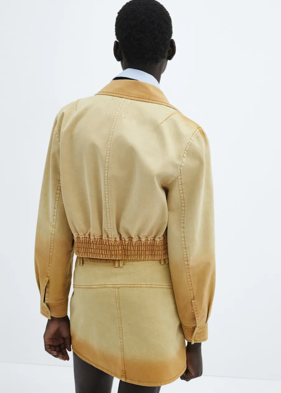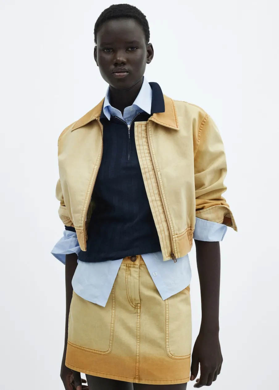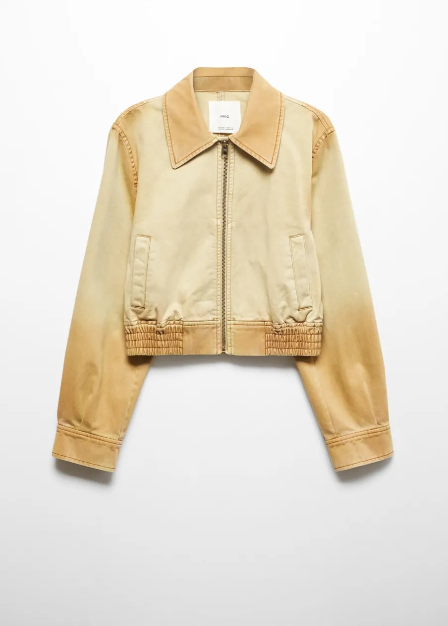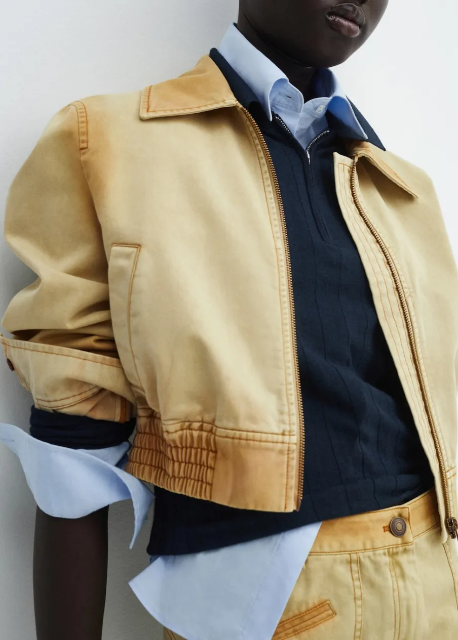 Bawełna 100%. Wytarty efekt. Model bomber. Koszulowy kołnierz. Długi rękaw. Dwie kieszenie boczne. Zapięcie na zamek z przodu. Elastyczna gumka u dołu. Total look.