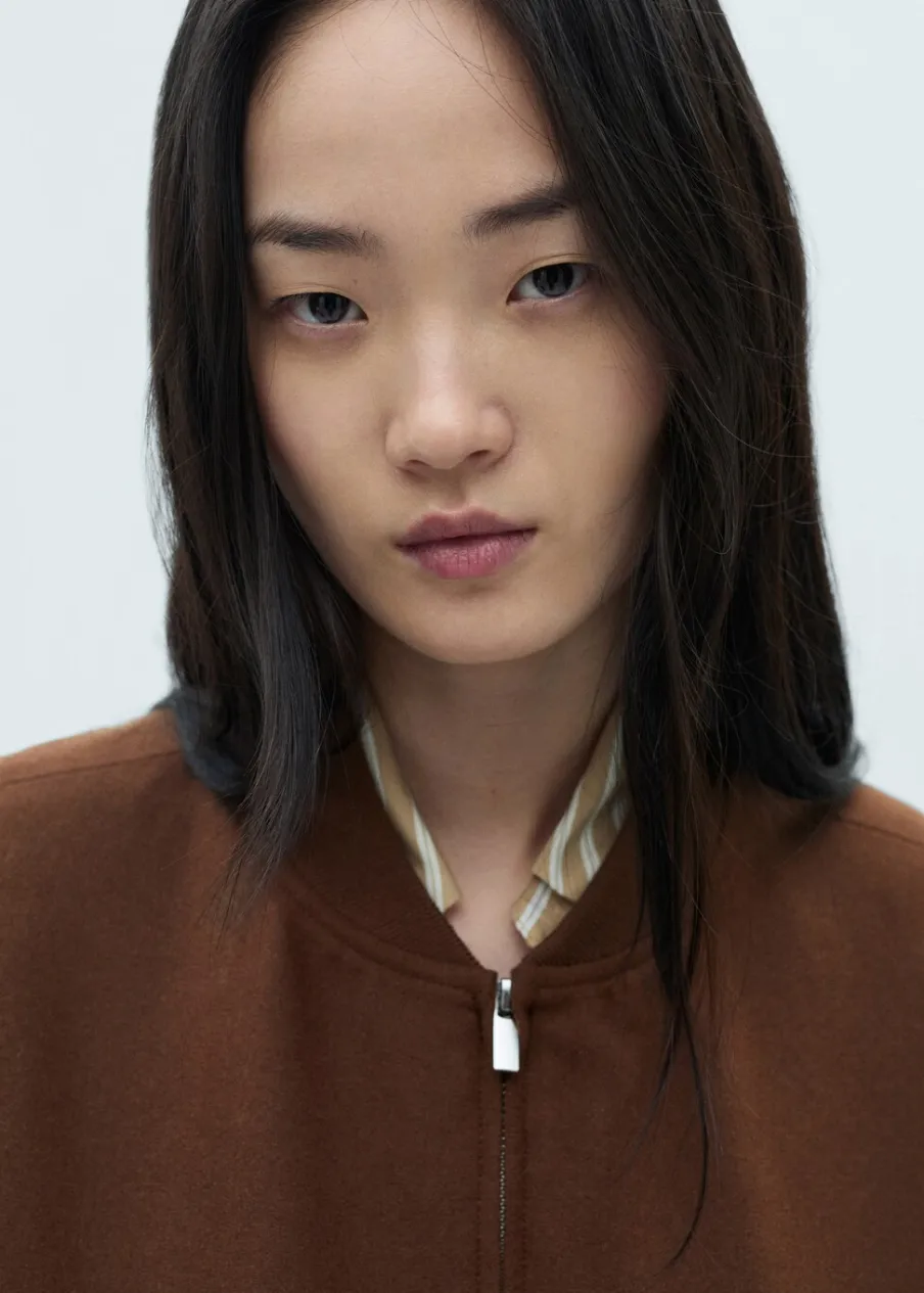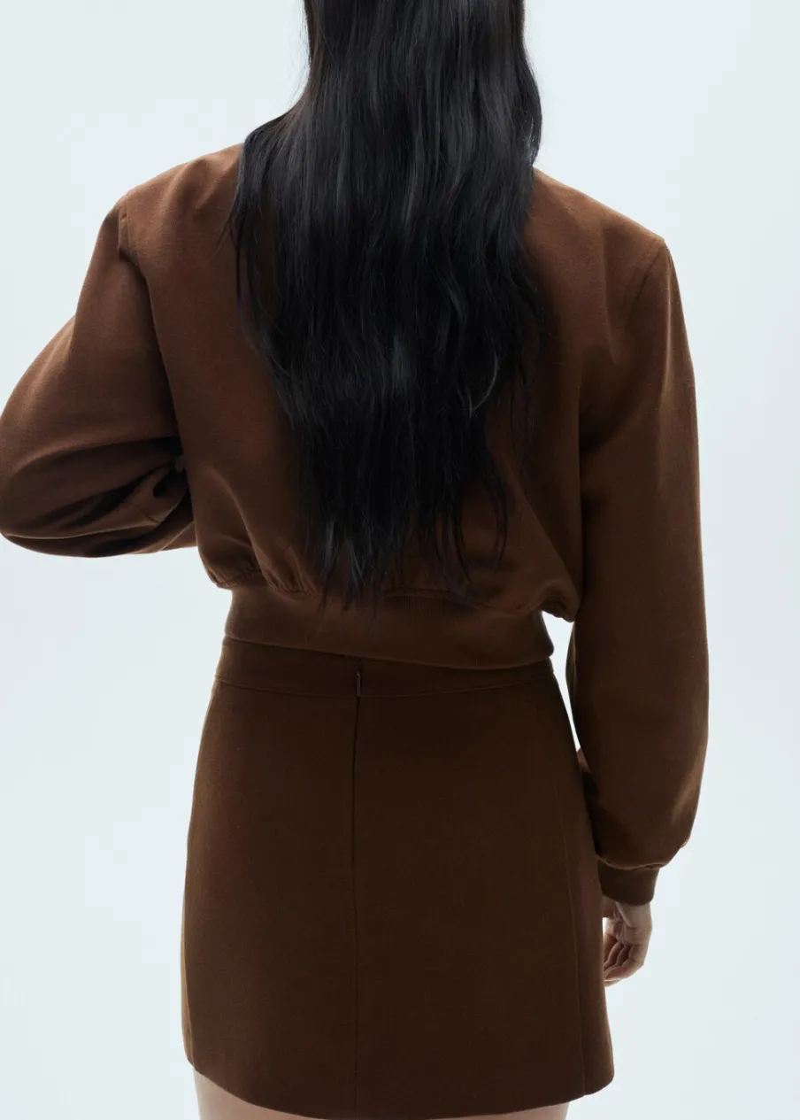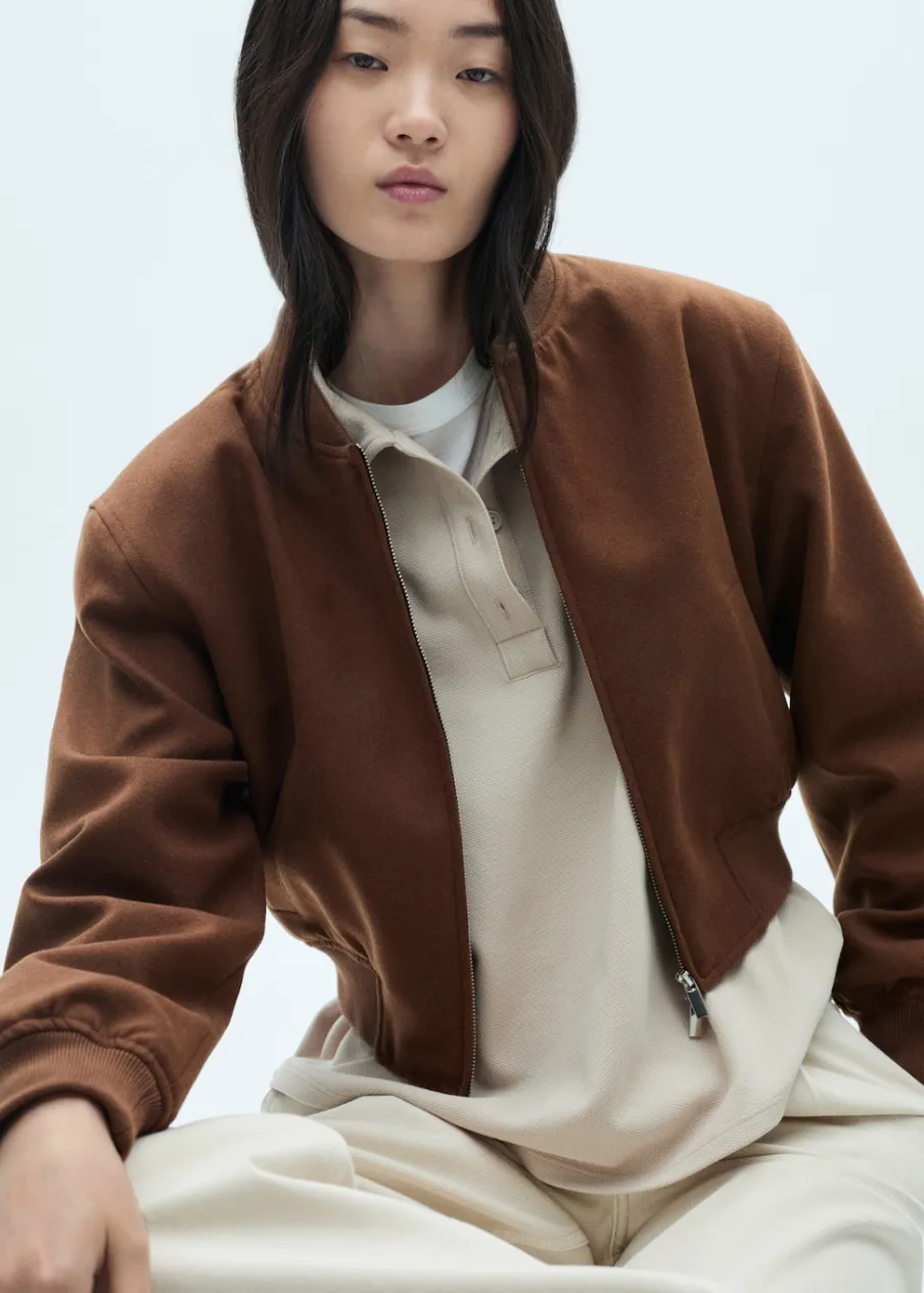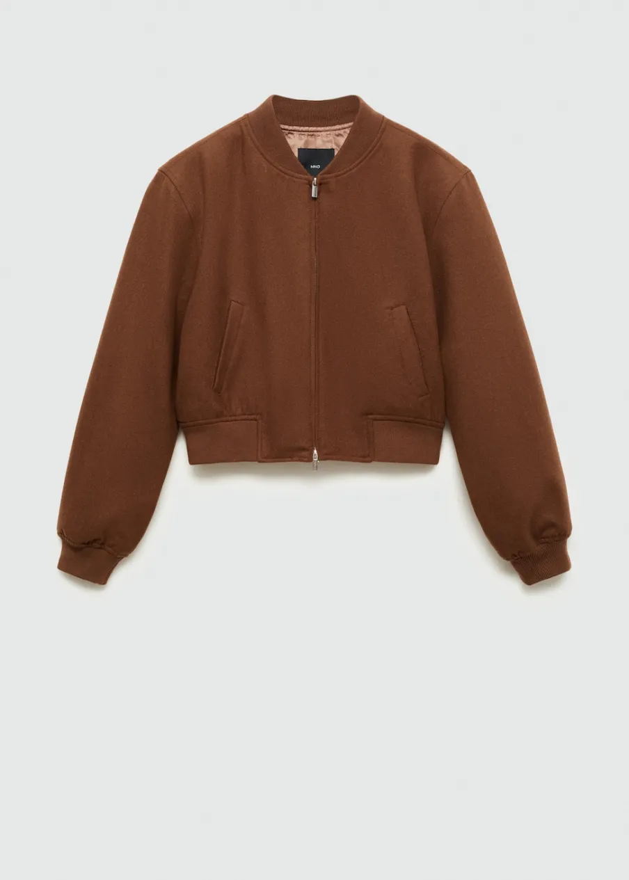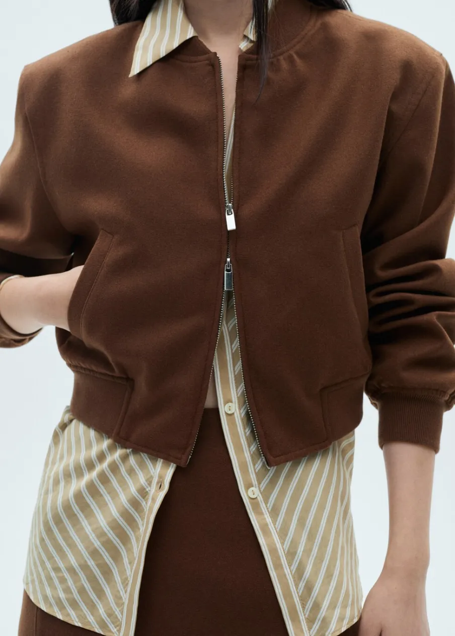 Model bomber. Długi rękaw z elastycznymi mankietami. Zapięcie z przodu na suwak. Wewnętrzna podszewka. Total look. Modelka ma 175 cm wzrostu i nosi rozmiar S/36. Model prosty. Tkanina mieszanka wełny. Kieszenie boczne. Okrągły dekolt.