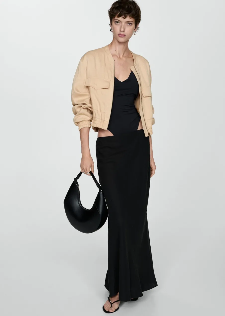 OpisLejąca tkanina. Model bomber. Okrągły dekolt. Długi rękaw z elastycznymi mankietami. Dwie kieszenie z patkami z…