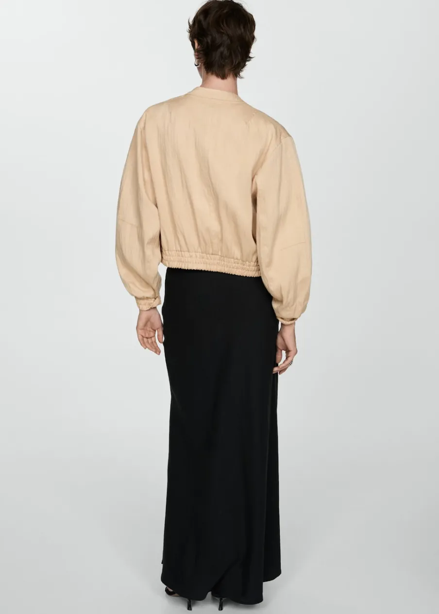 Lejąca tkanina. Model bomber. Okrągły dekolt. Długi rękaw z elastycznymi mankietami. Dwie kieszenie z patkami z przodu. Zapięcie na zamek z przodu. Elastyczne, ściągaczowe wykończenie nogawek.