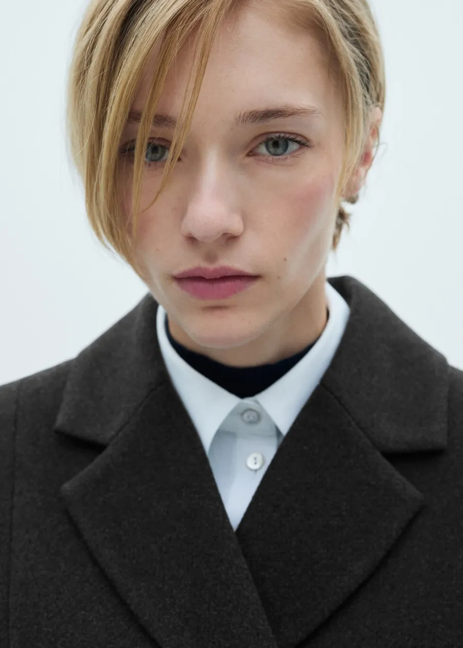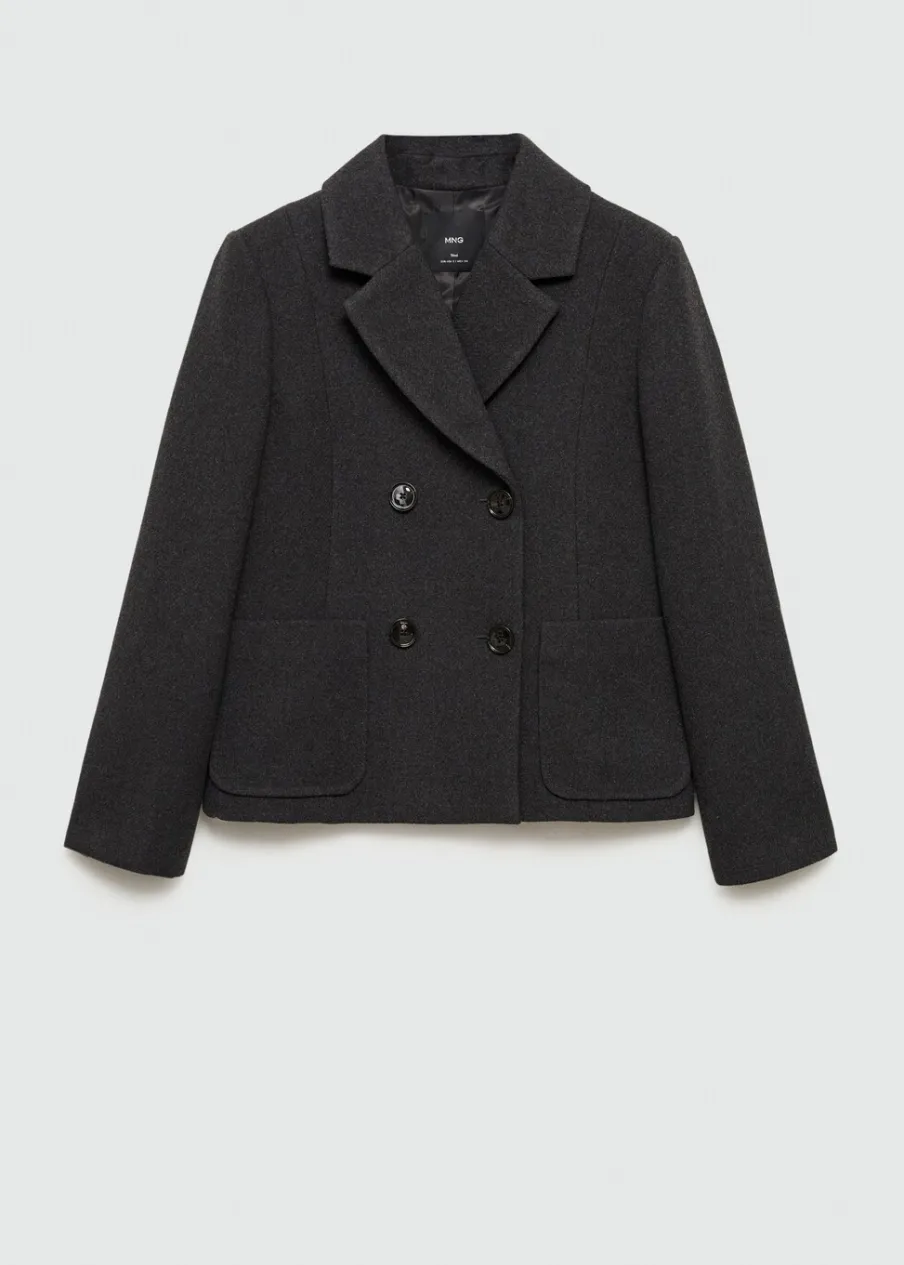 Krótki krój. Model prosty. Długie rękawy z rozcięciem. Dwie kieszenie nakładane z przodu. Dwurzędowe zapięcie. Wewnętrzna podszewka. Modelka ma 181 cm wzrostu i nosi rozmiar S/36. Tkanina mieszanka wełny. Dekolt w szpic z kołnierzykiem.