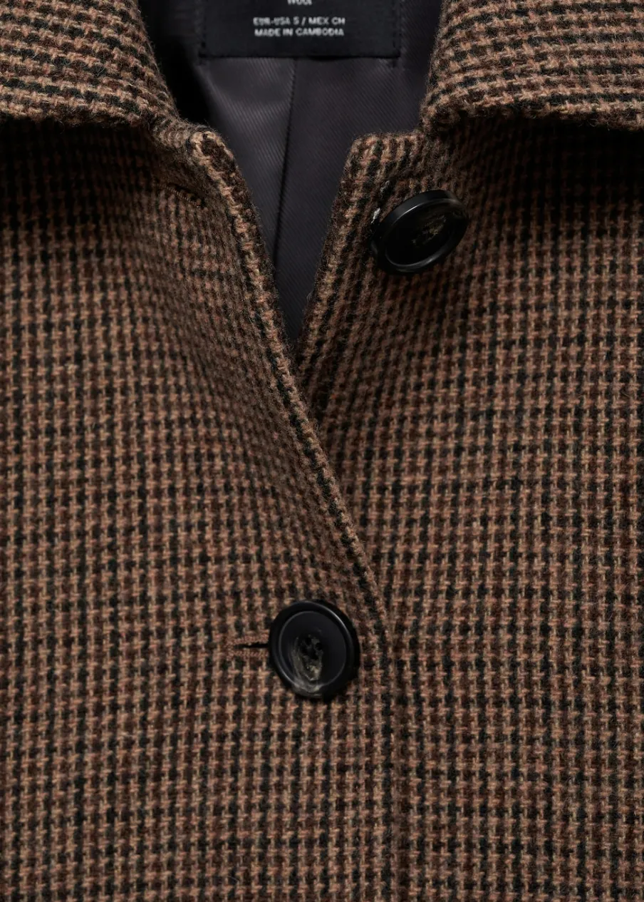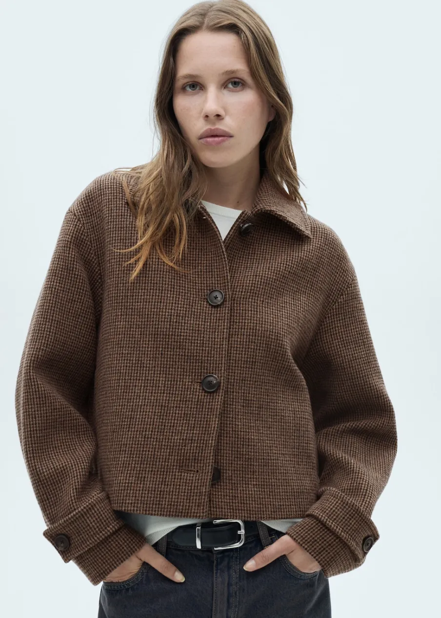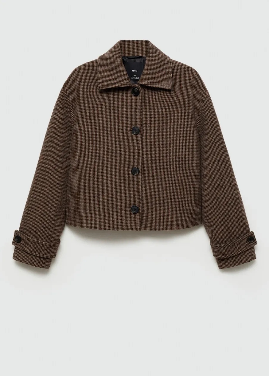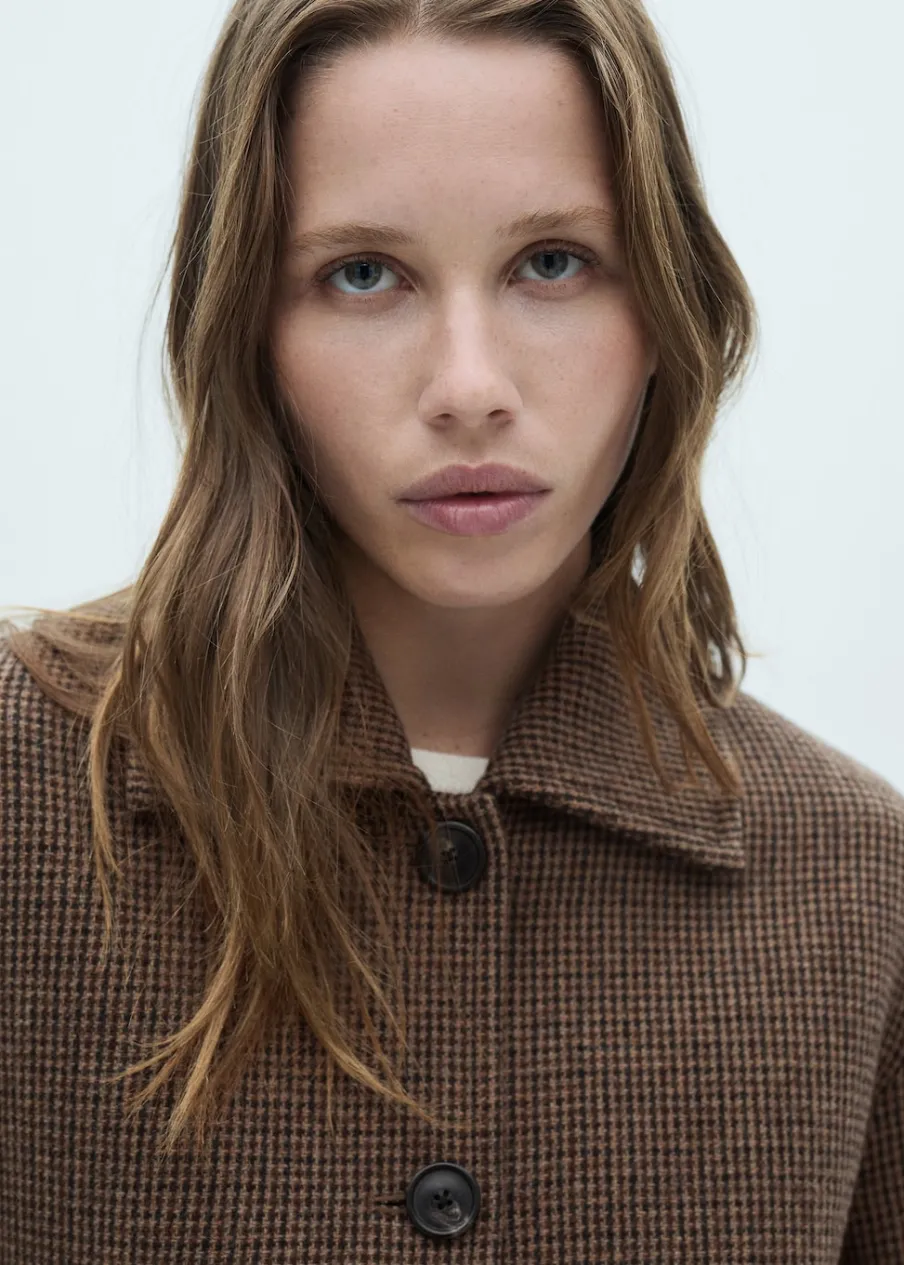 Tkanina mieszanka wełny. Model prosty. Krótki krój. Wzór w drobną kurzą stopkę. Koszulowy kołnierz. Zapięcie z przodu na guziki. Wewnętrzna podszewka. Modelka ma 175 cm wzrostu i nosi rozmiar S/36. Długi rękaw z zapięciem na guziki.