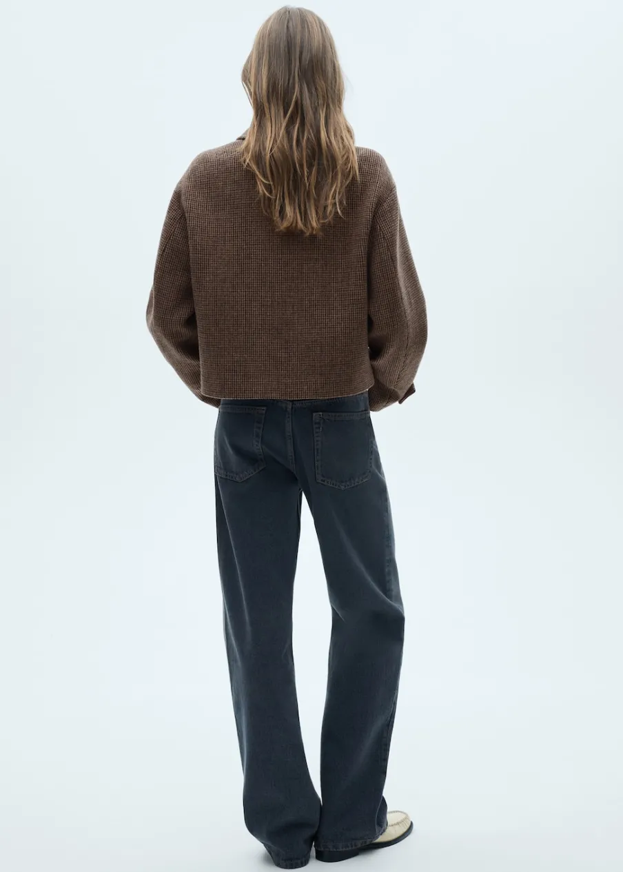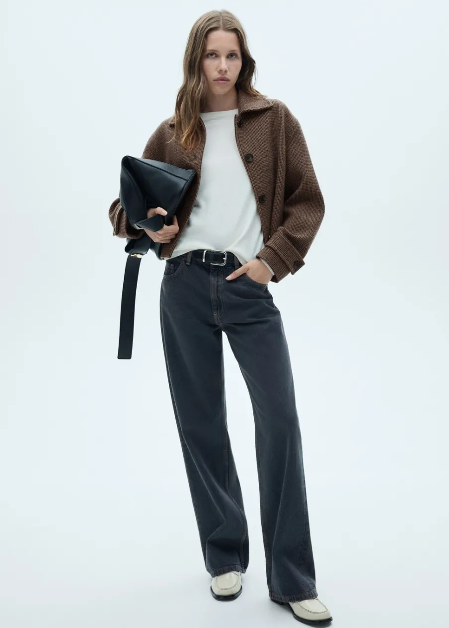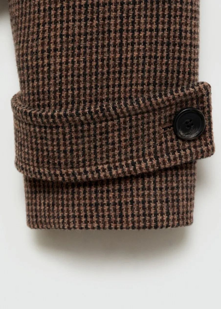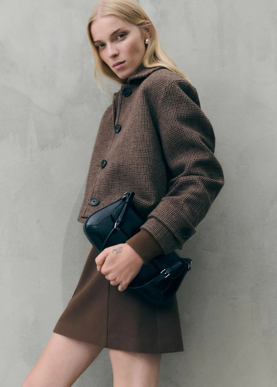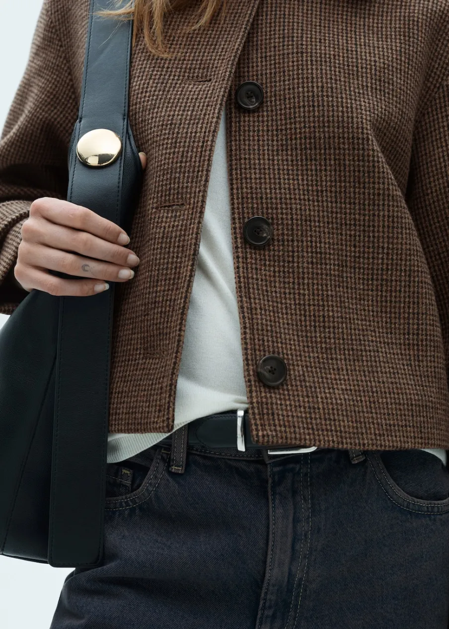 Tkanina mieszanka wełny. Model prosty. Krótki krój. Wzór w drobną kurzą stopkę. Koszulowy kołnierz. Zapięcie z przodu na guziki. Wewnętrzna podszewka. Modelka ma 175 cm wzrostu i nosi rozmiar S/36. Długi rękaw z zapięciem na guziki.