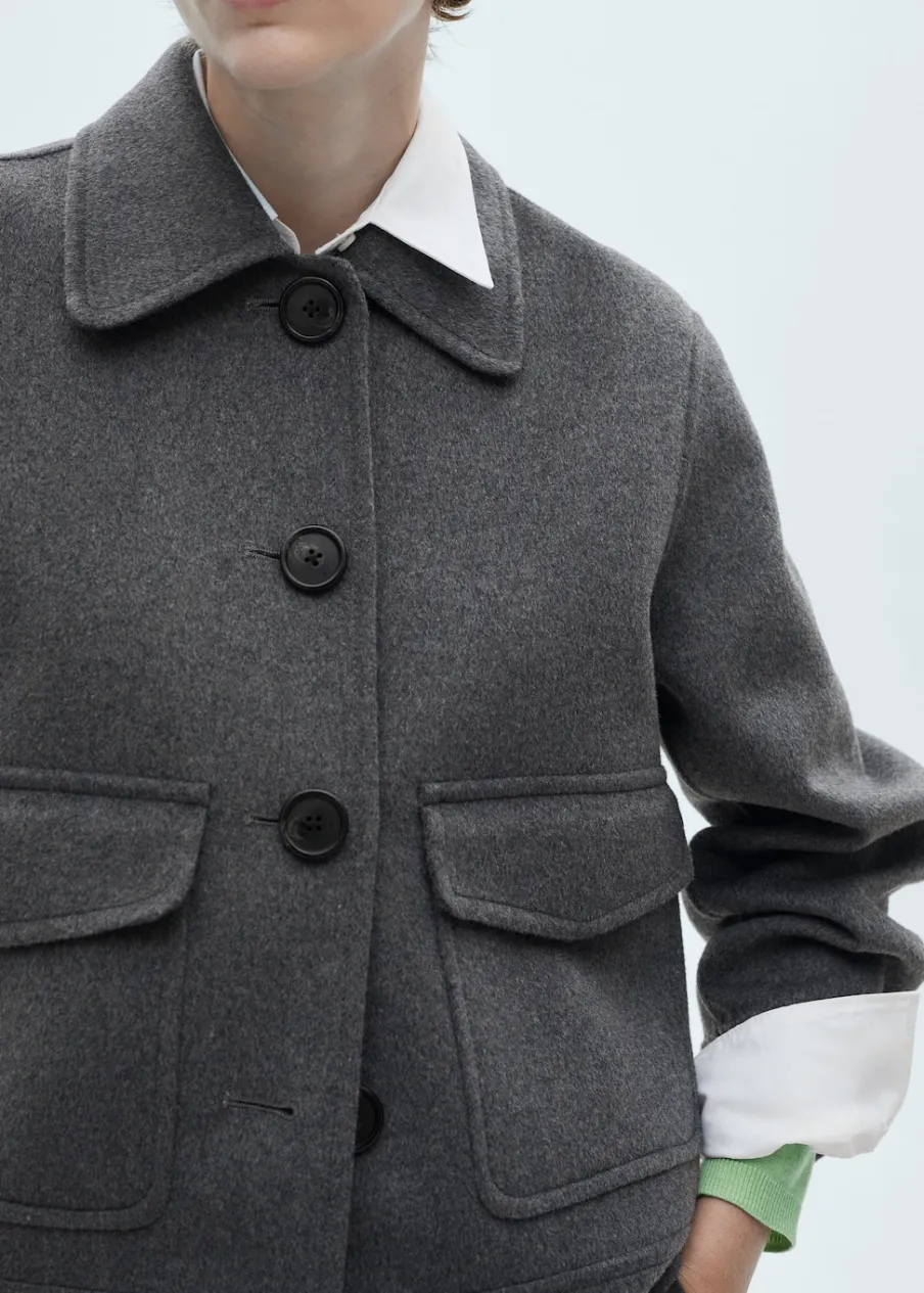 Tkanina mieszanka wełny. Model prosty. Koszulowy kołnierz. Długi rękaw. Dwie kieszenie z patkami z przodu. Modelka ma 181 cm wzrostu i nosi rozmiar S/36. Zapięcie na guziki z przodu.