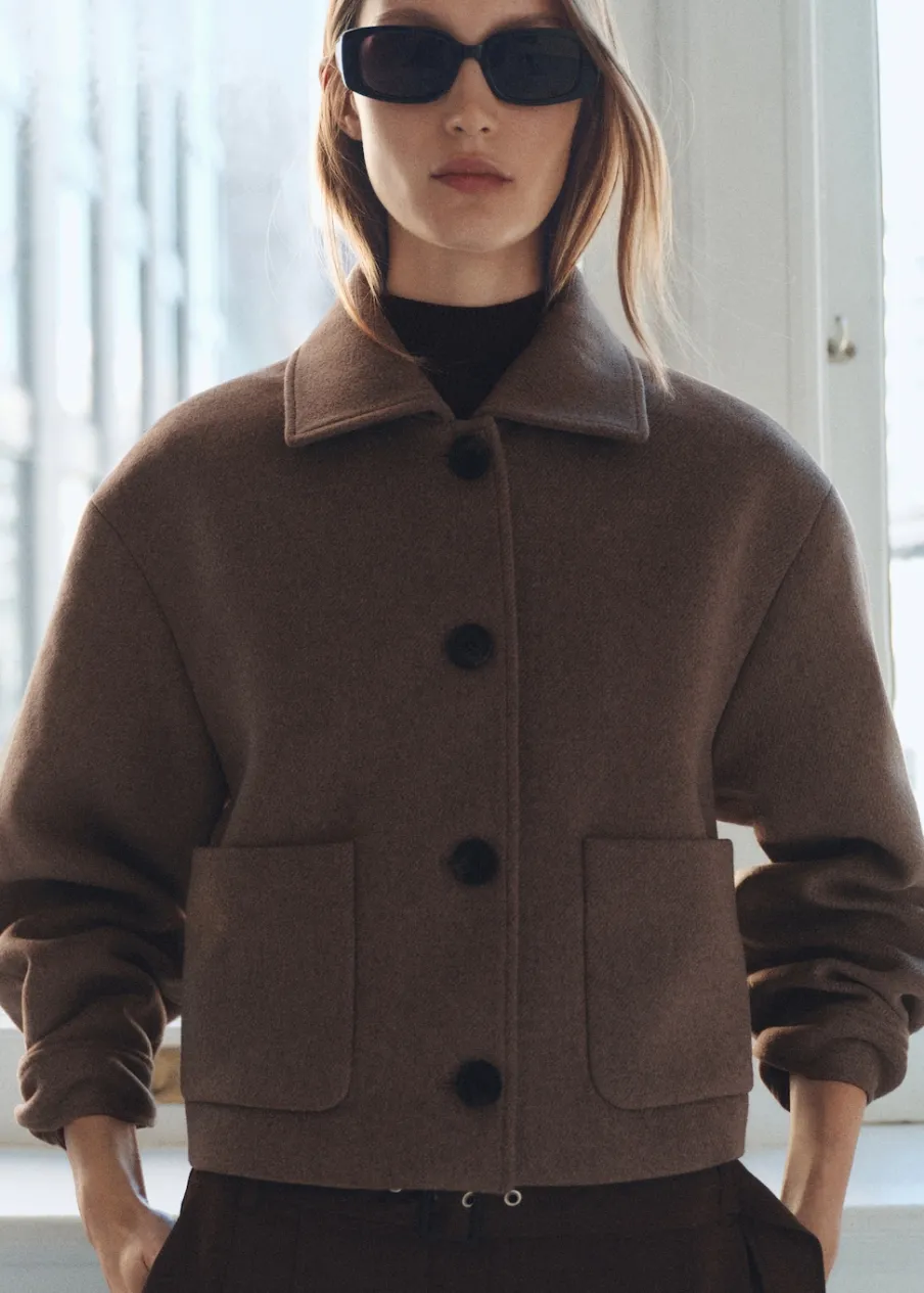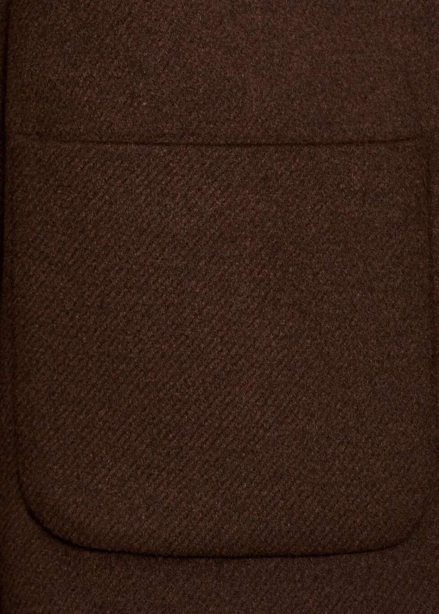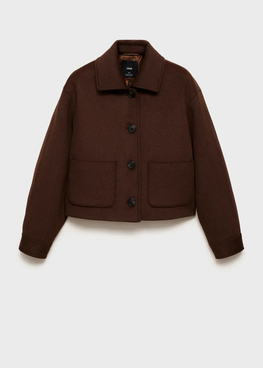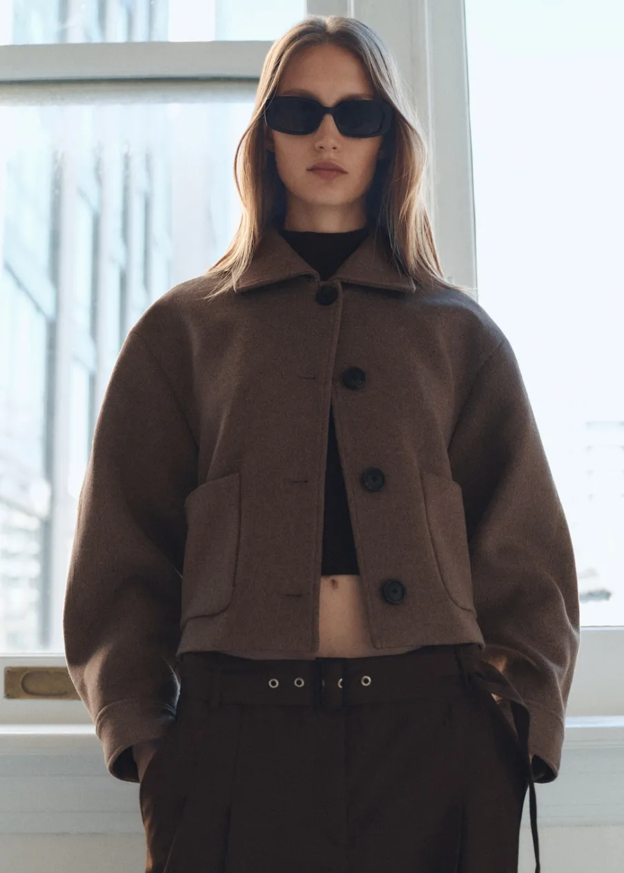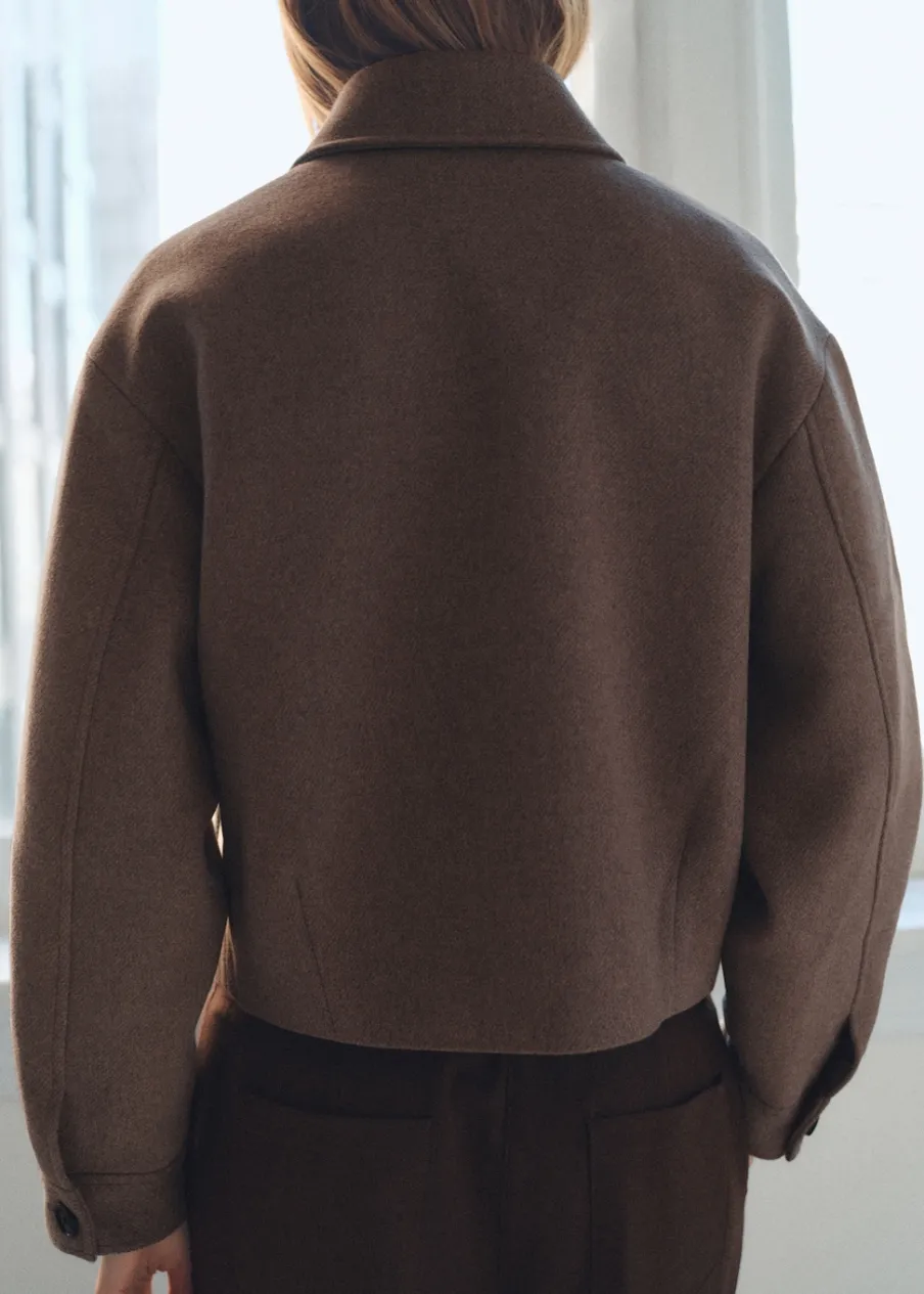 Tkanina mieszanka wełny. Krótki krój. Model prosty. Kołnierz z klapami. Długi rękaw. Mankiety z odpinanymi guzikami. Dwie kieszenie nakładane z przodu. Zapięcie z przodu na guziki. Wewnętrzna podszewka.