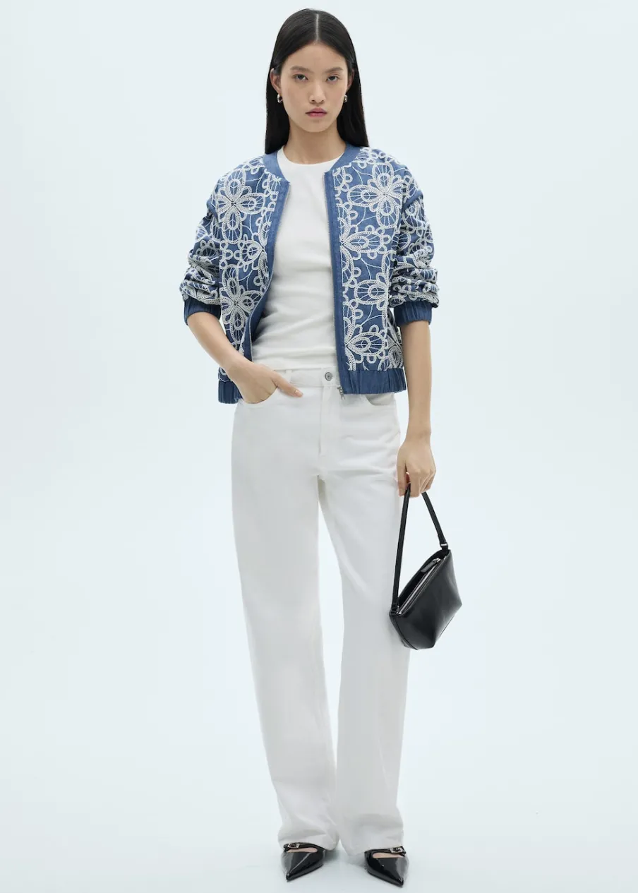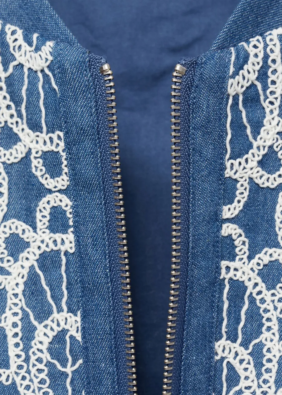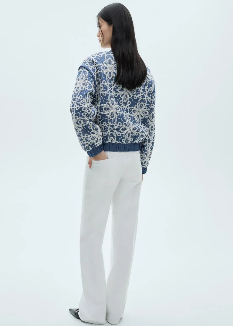 Bawełna 100%. Model prosty. Model standardowy. Kwiatowy haft. Średnia wielkość. Stójkowy kołnierzyk. Długi rękaw. Elastyczne mankiety. Zapięcie z przodu na suwak. Tylko podszewka.