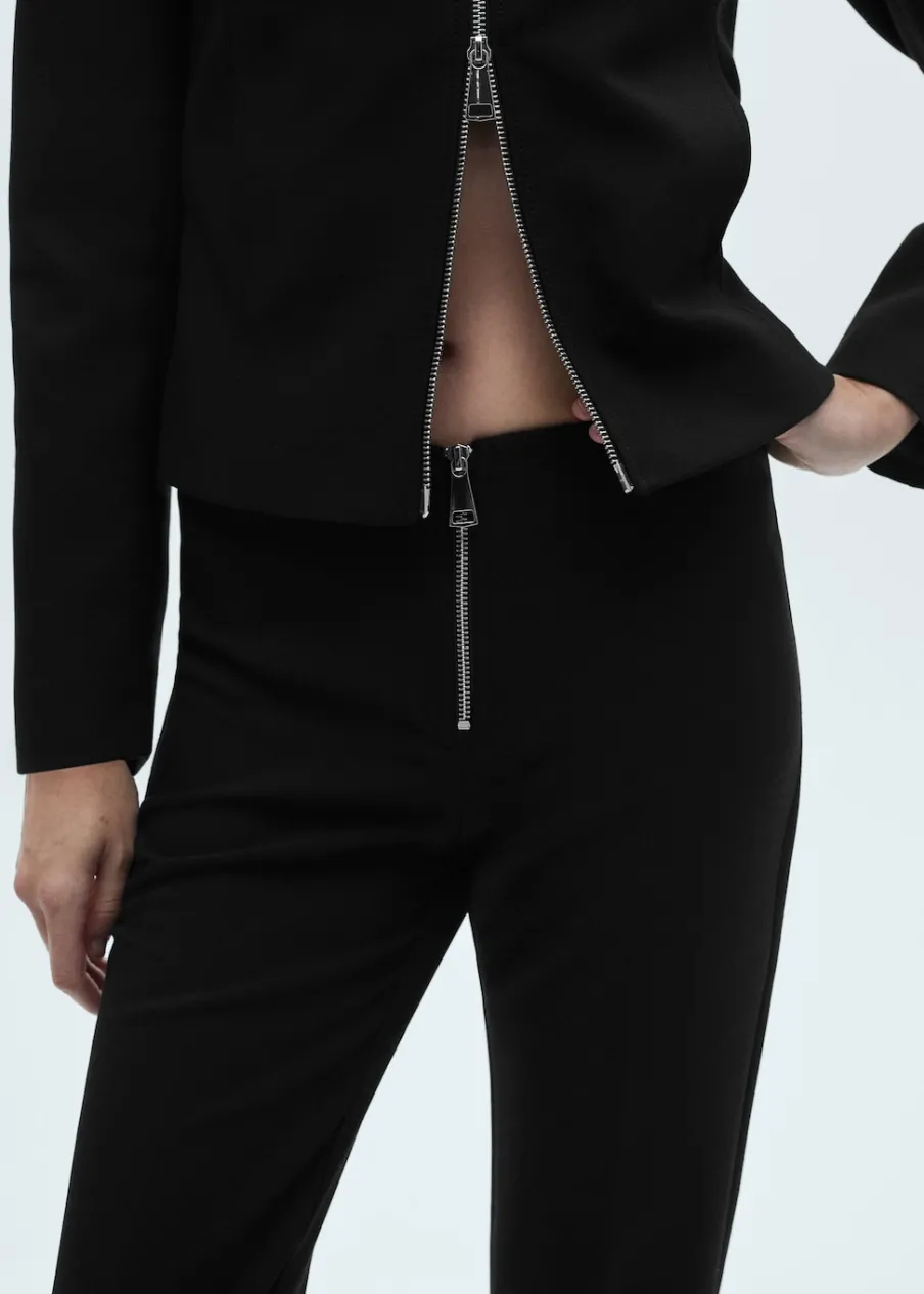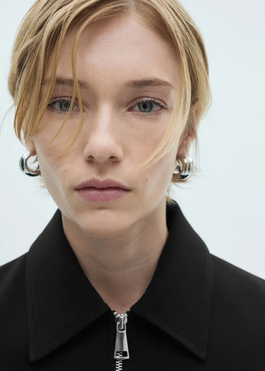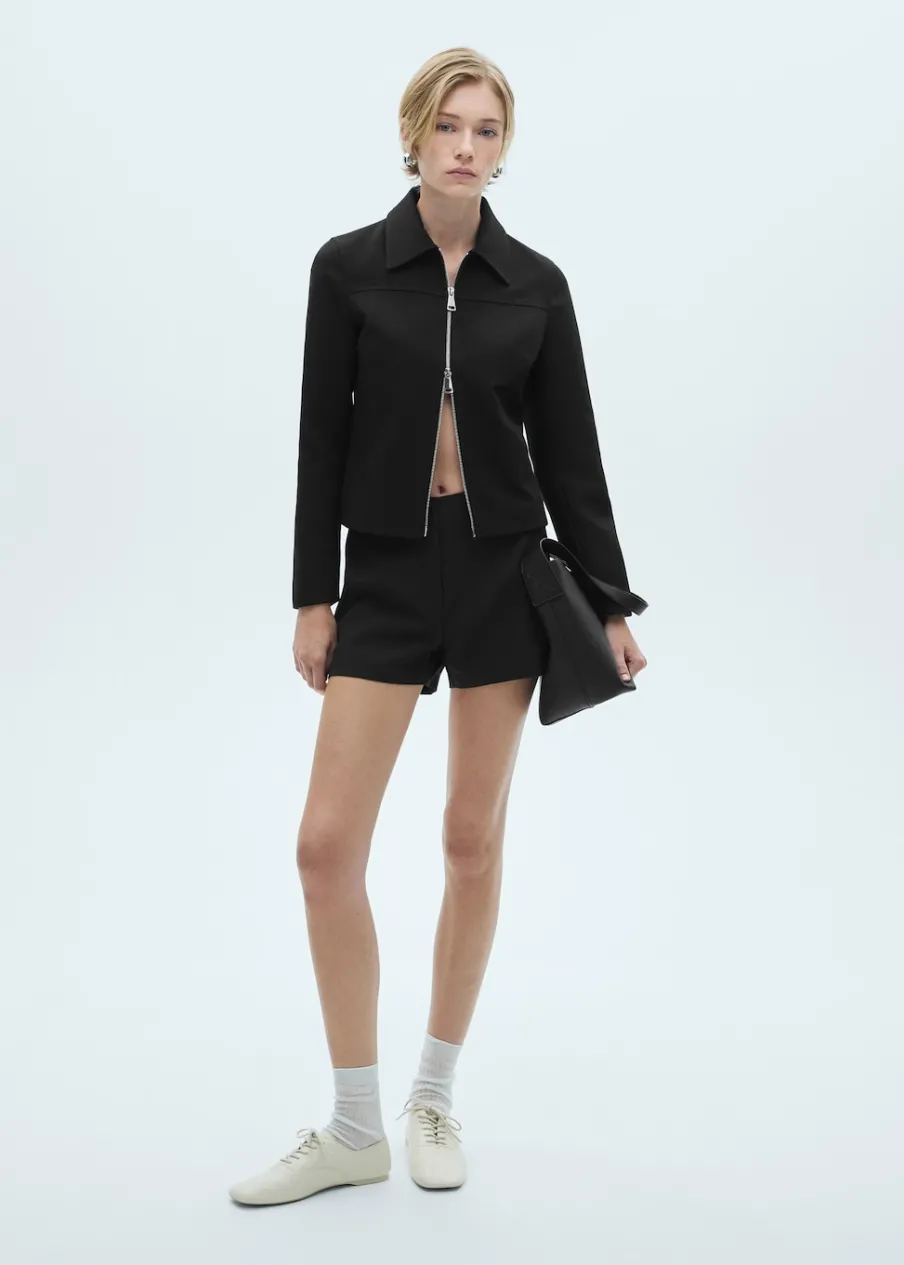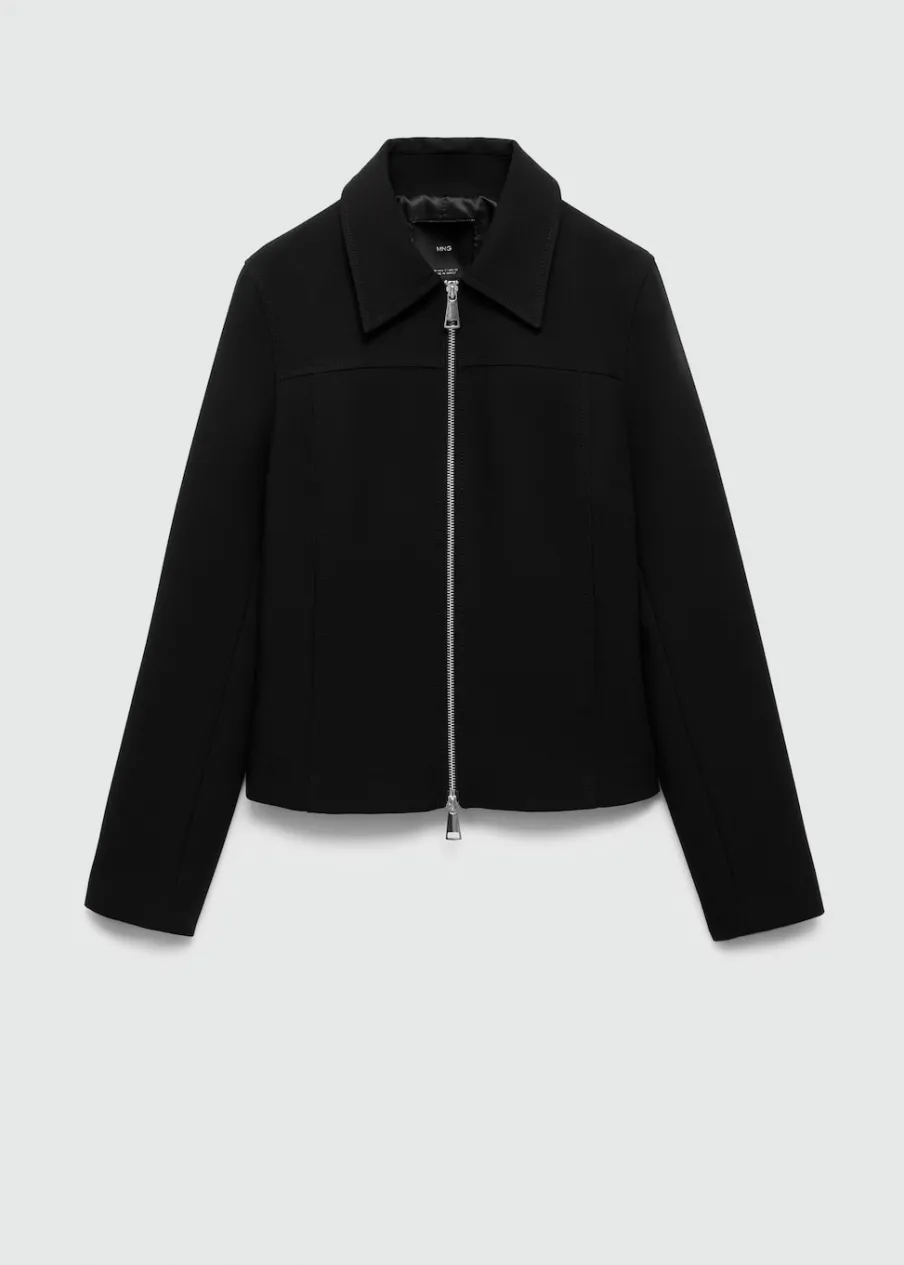 Model prosty. Koszulowy kołnierz. Długi rękaw. Zapięcie na podwójny suwak. Total look. Modelka ma 181 cm wzrostu i nosi rozmiar S/36.