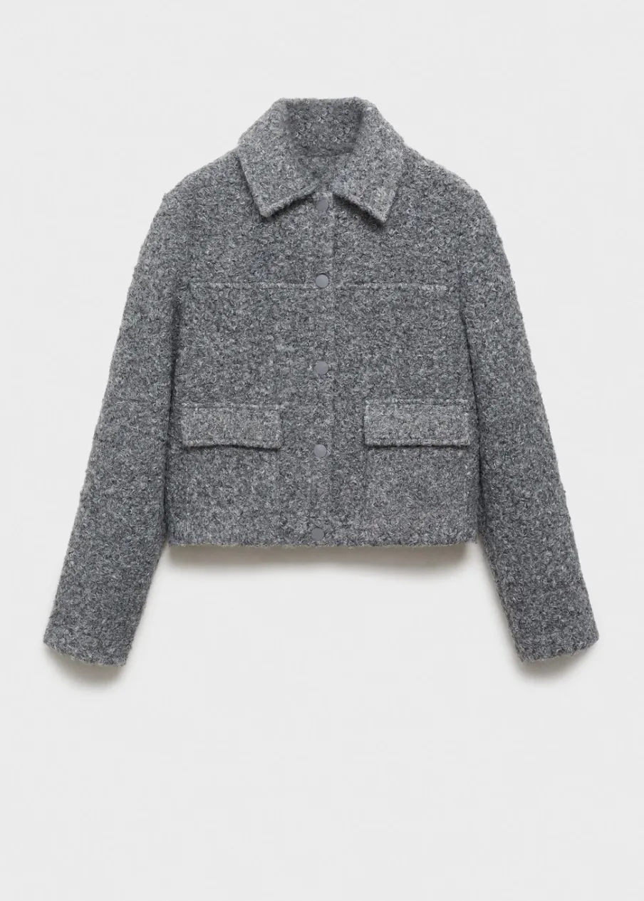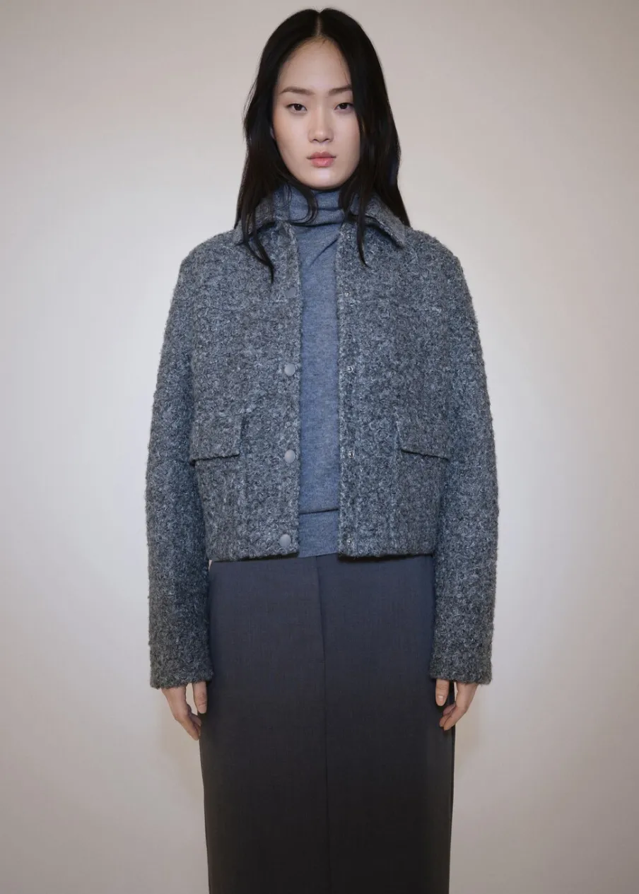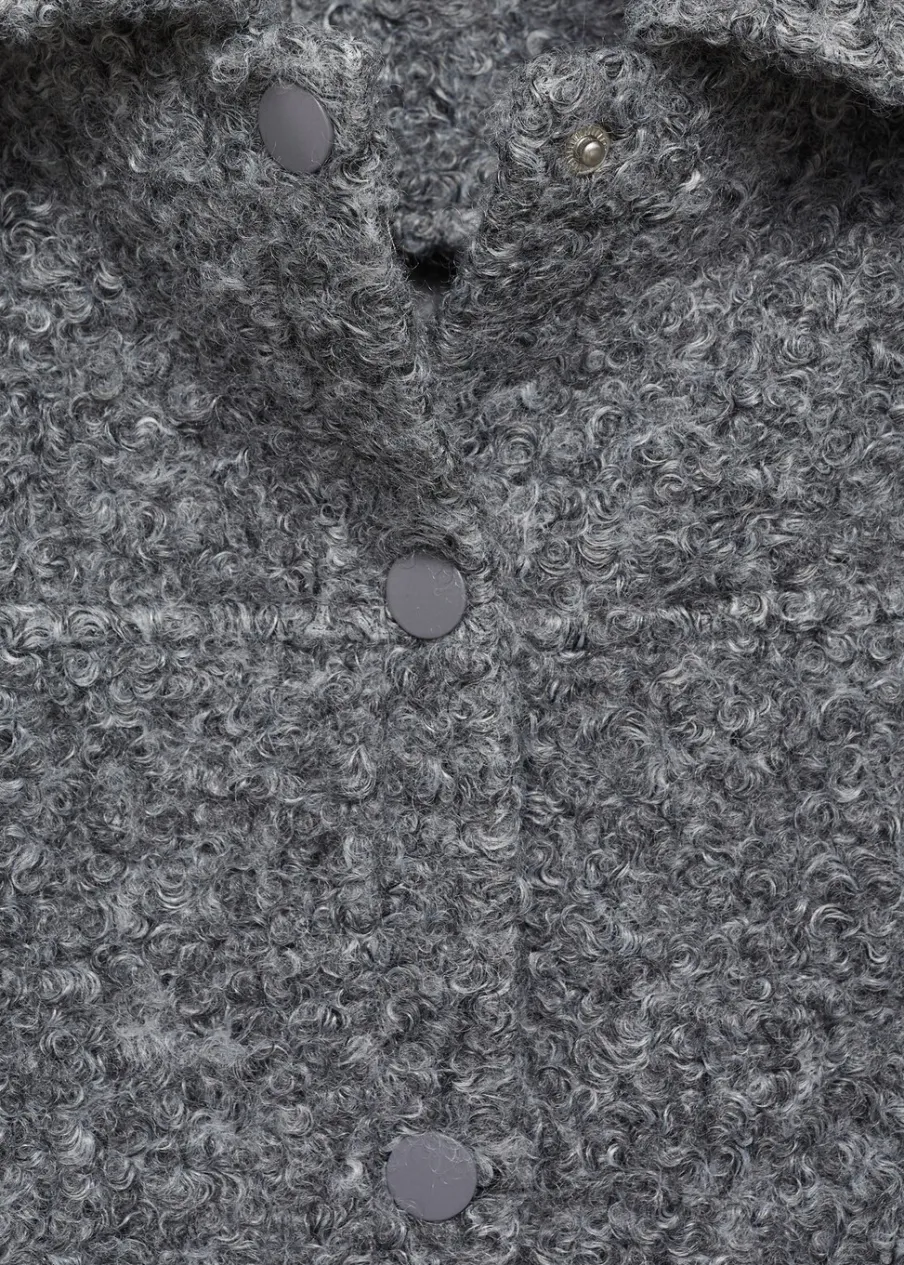 Krótki krój. Koszulowy kołnierz. Długi rękaw. Zapięcie z przodu na zatrzaskowe guziki. Dwie kieszenie z patkami z przodu. Model prosty. Efekt czesanego materiału z teksturą frotte. Modelka ma 175 cm wzrostu i nosi rozmiar S/36.