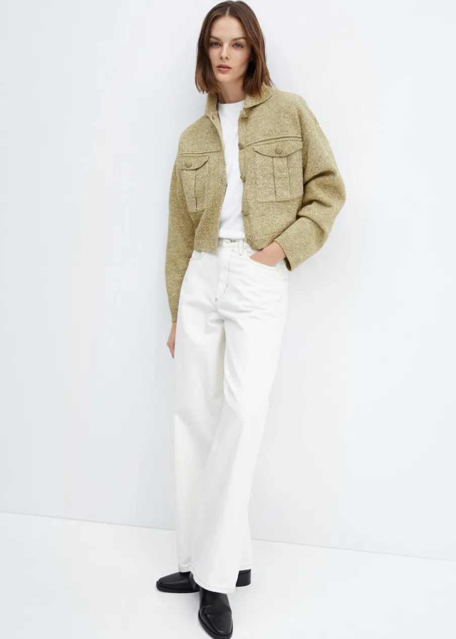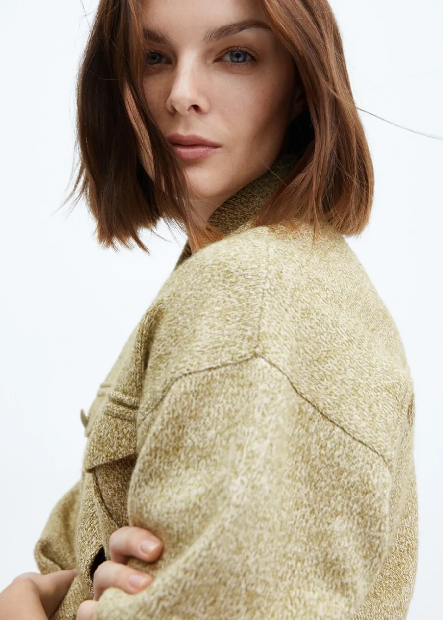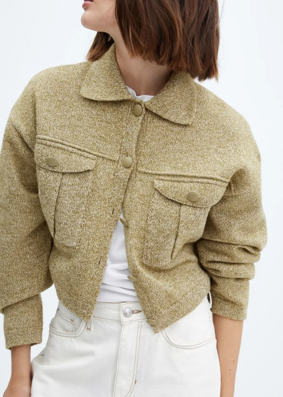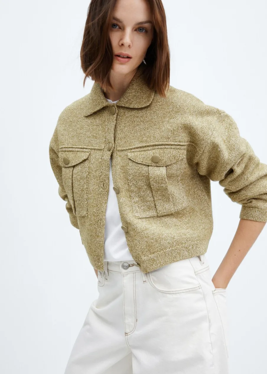 Dzianinowa tkanina. Tkanina mieszanka bawełny. Krótki krój. Model prosty. Koszulowy kołnierz. Długi rękaw. Dwie naszywane kieszenie na guzik z przodu. Zapięcie na guziki z przodu.