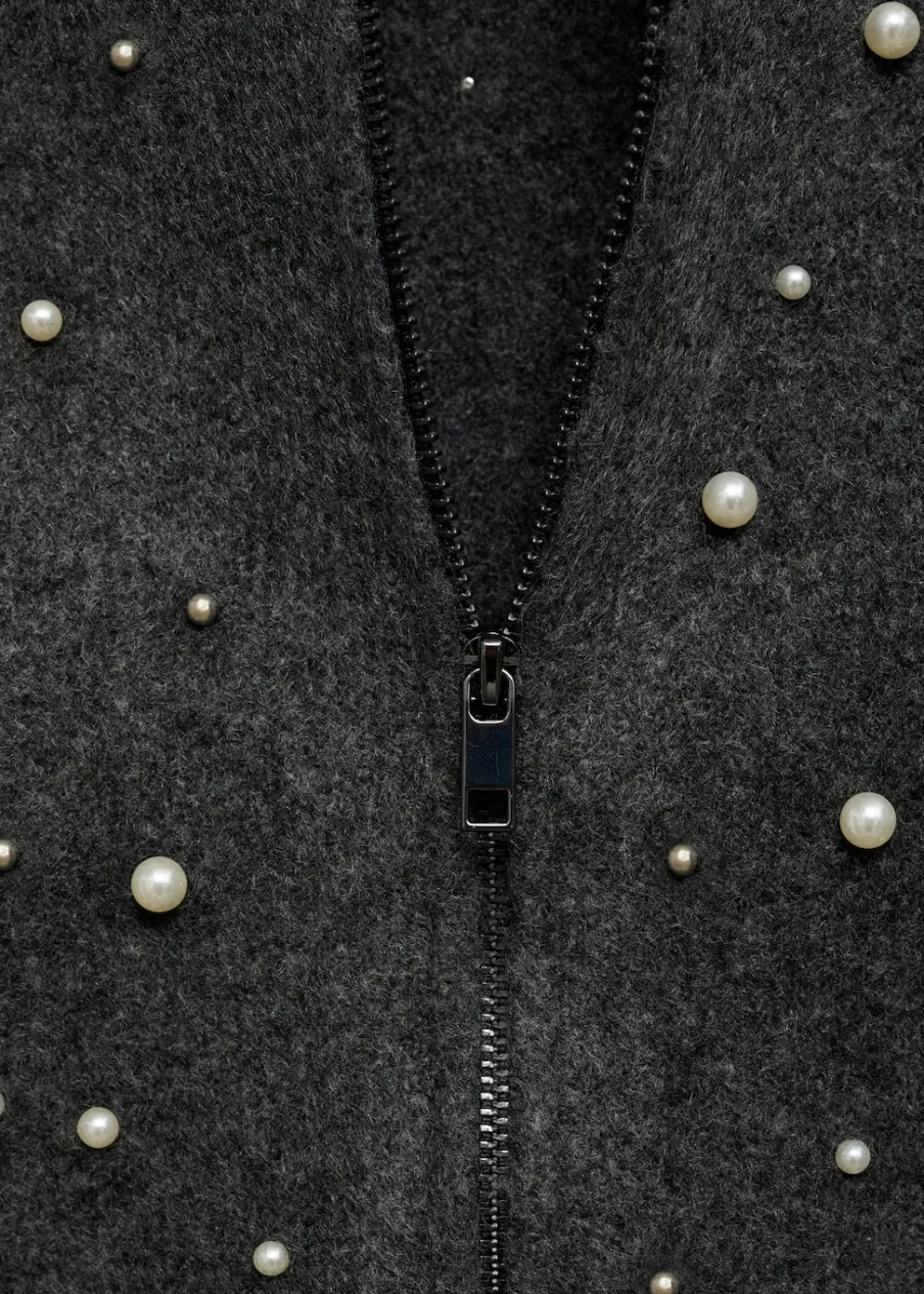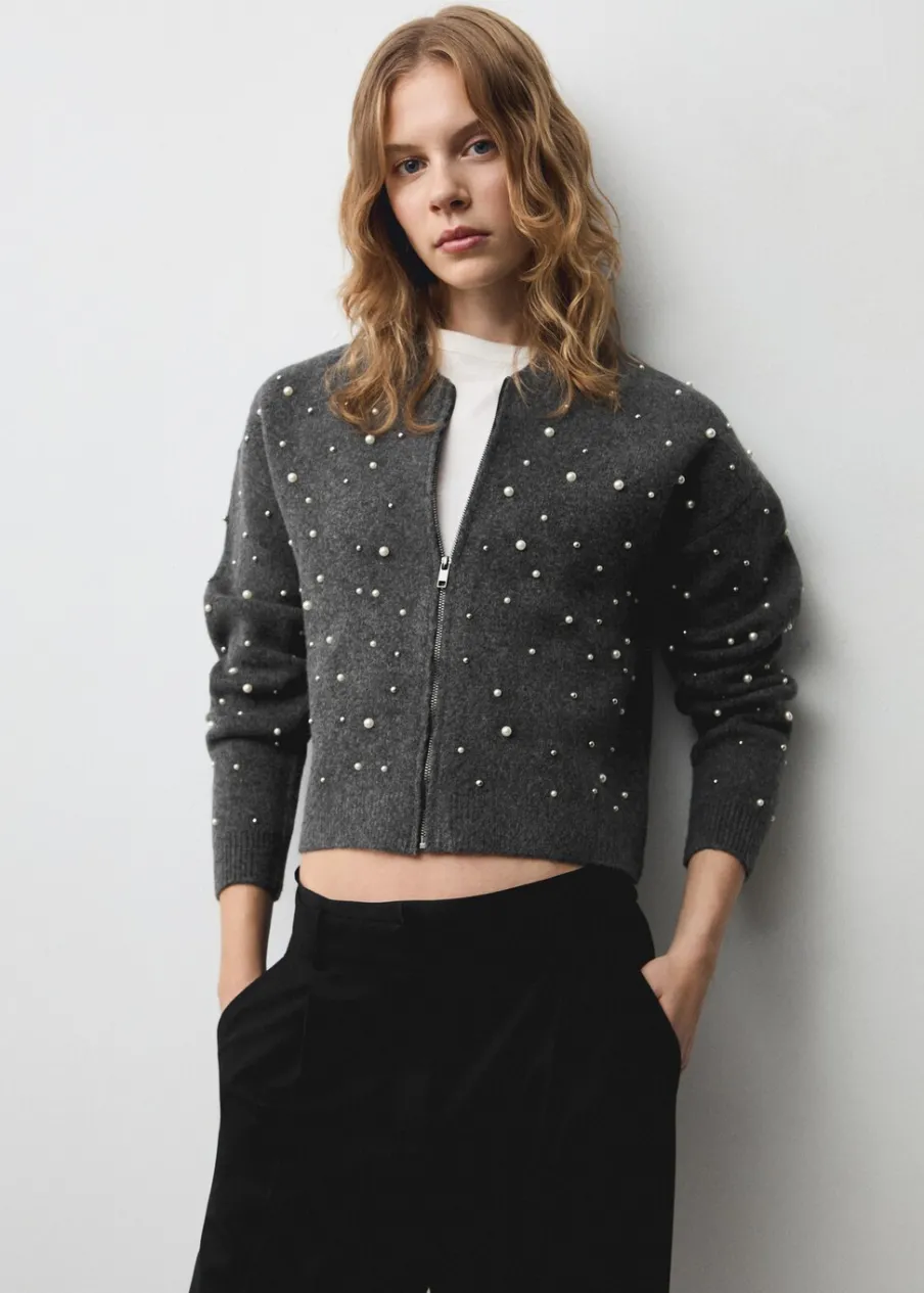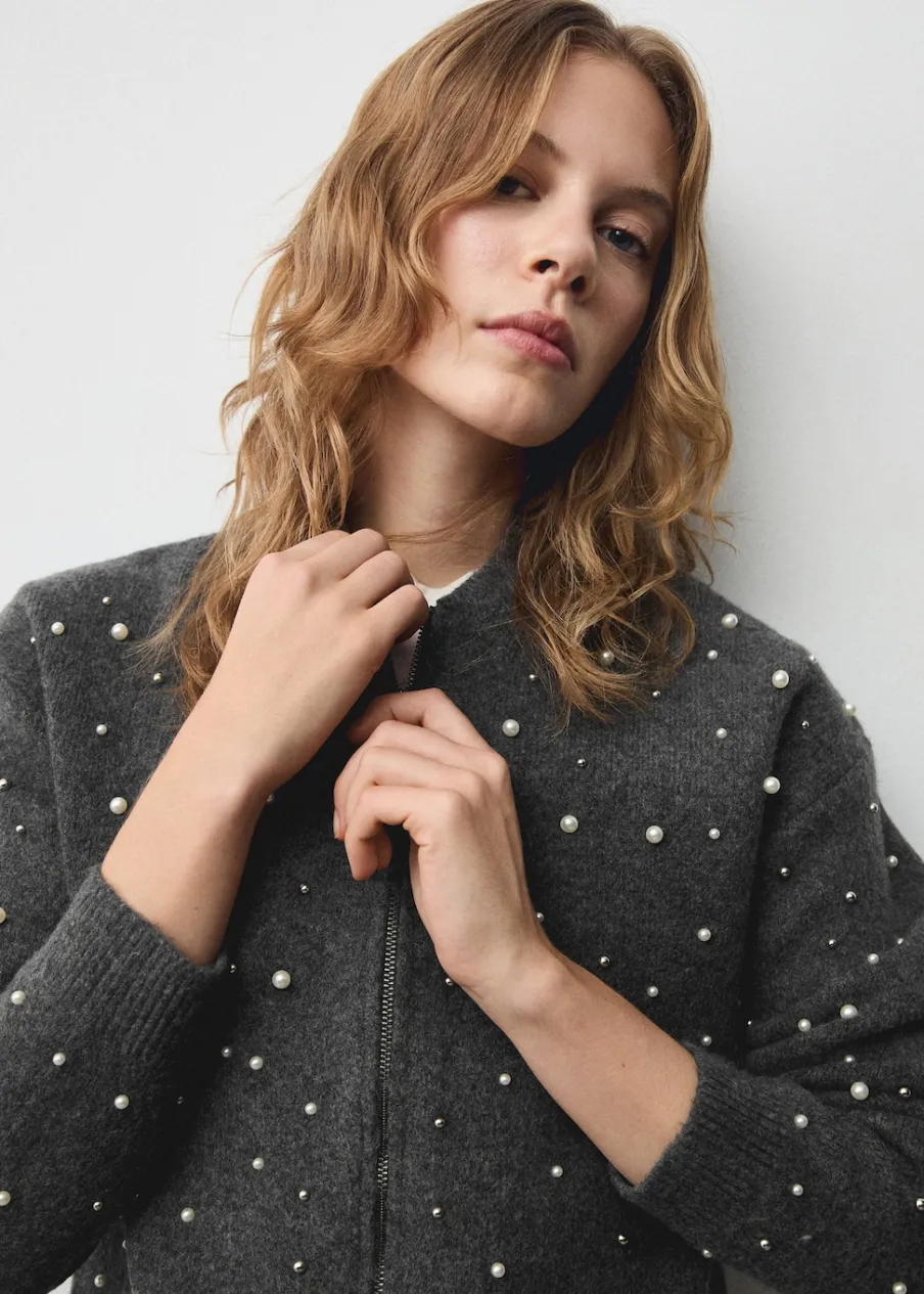 OpisDzianinowa tkanina. Model prosty. Okrągły dekolt. Długi rękaw. Perełkowa ozdoba. Zapięcie z przodu na suwak. M…
