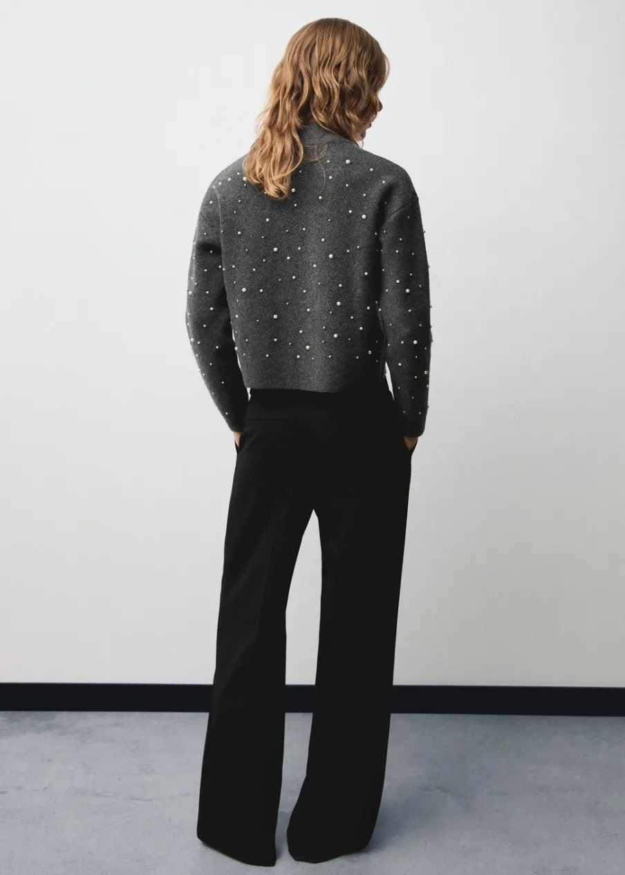 Dzianinowa tkanina. Model prosty. Okrągły dekolt. Długi rękaw. Perełkowa ozdoba. Zapięcie z przodu na suwak. Modelka ma 179 cm wzrostu i nosi rozmiar S/36. Kolekcja wizytowa.