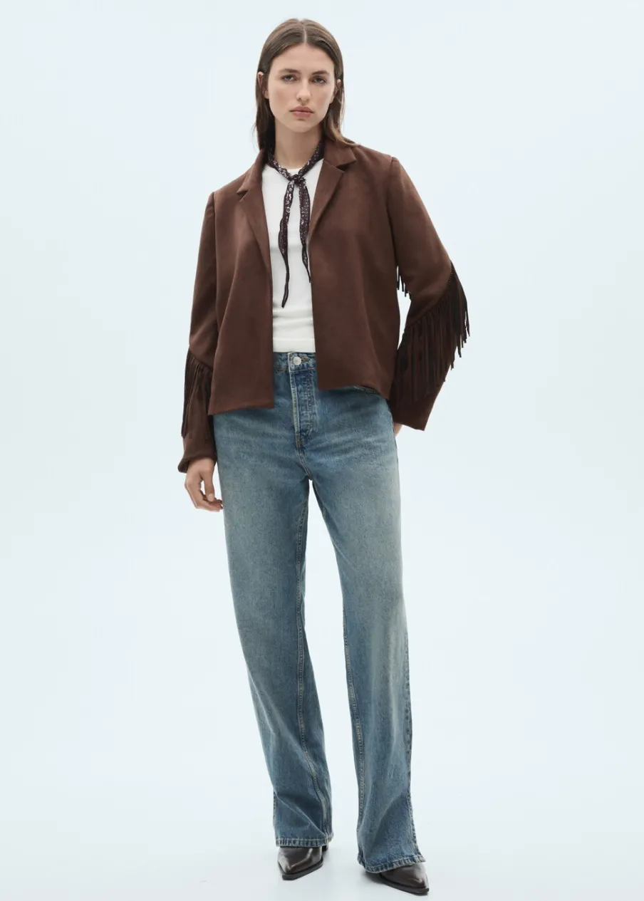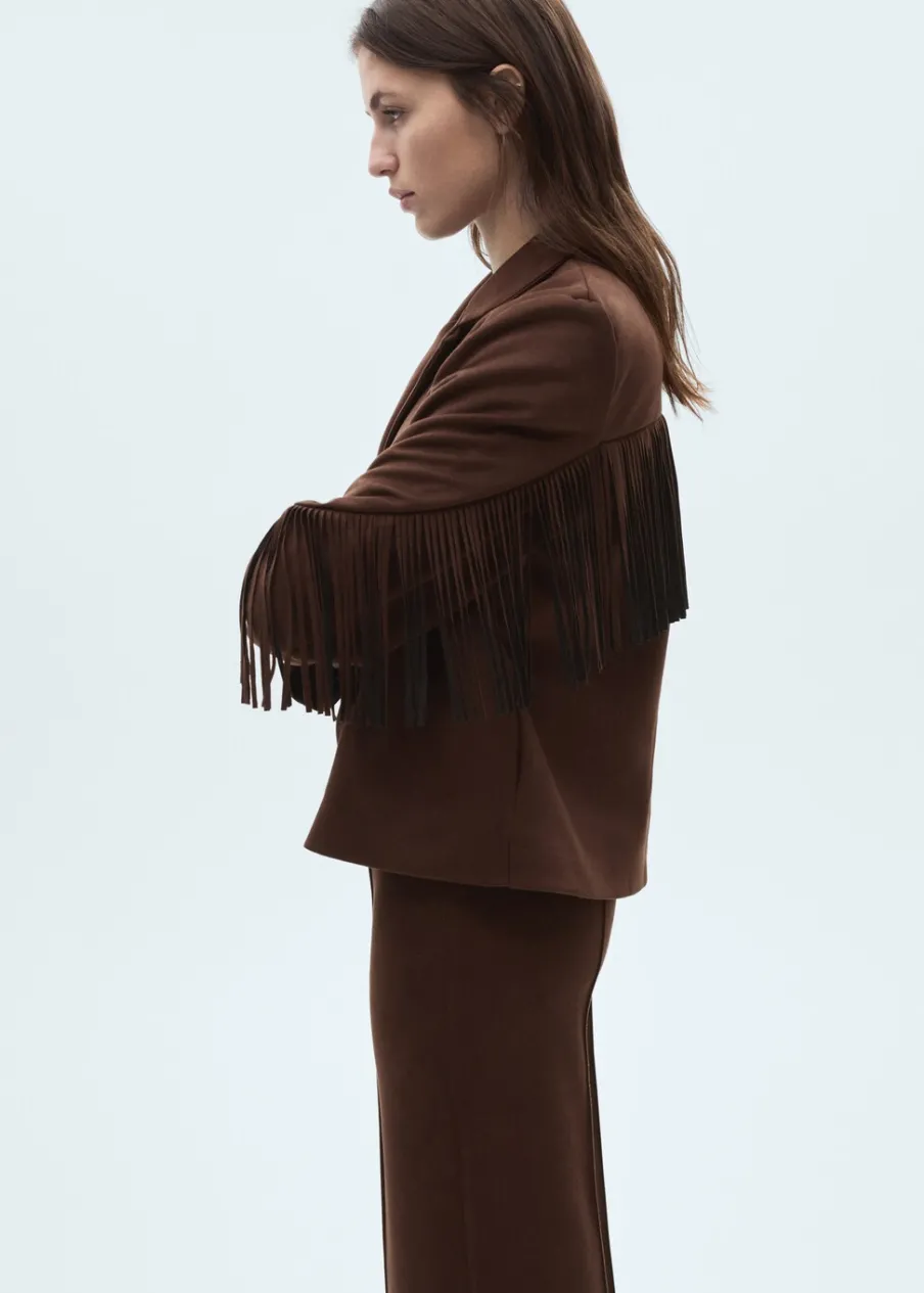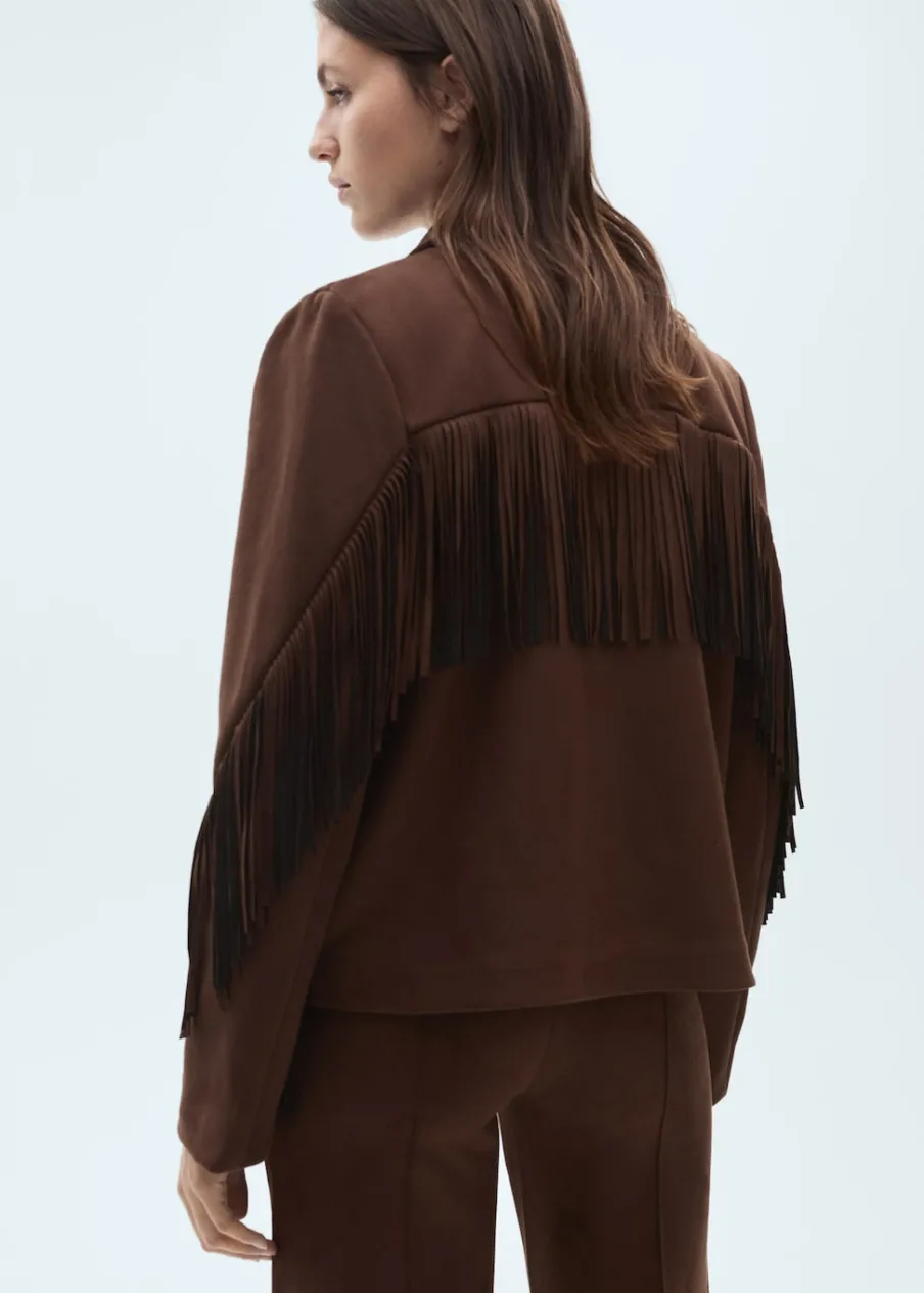 Imitacja zamszu. Model prosty. Dekolt w szpic z kołnierzykiem. Długi rękaw. Detal z frędzli. Bez zapięcia. Wewnętrzna podszewka. Modelka ma 178 cm wzrostu i nosi rozmiar S/36. Total look.