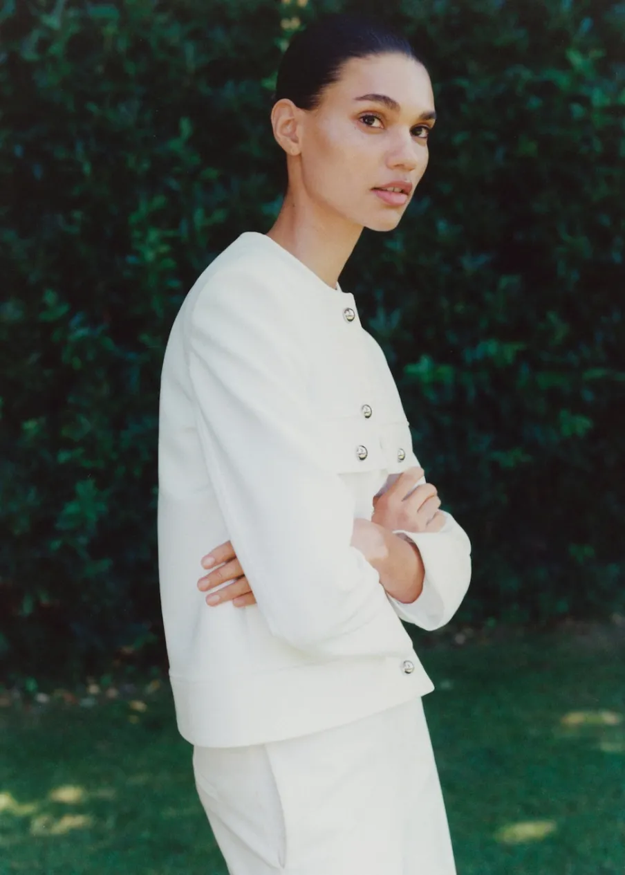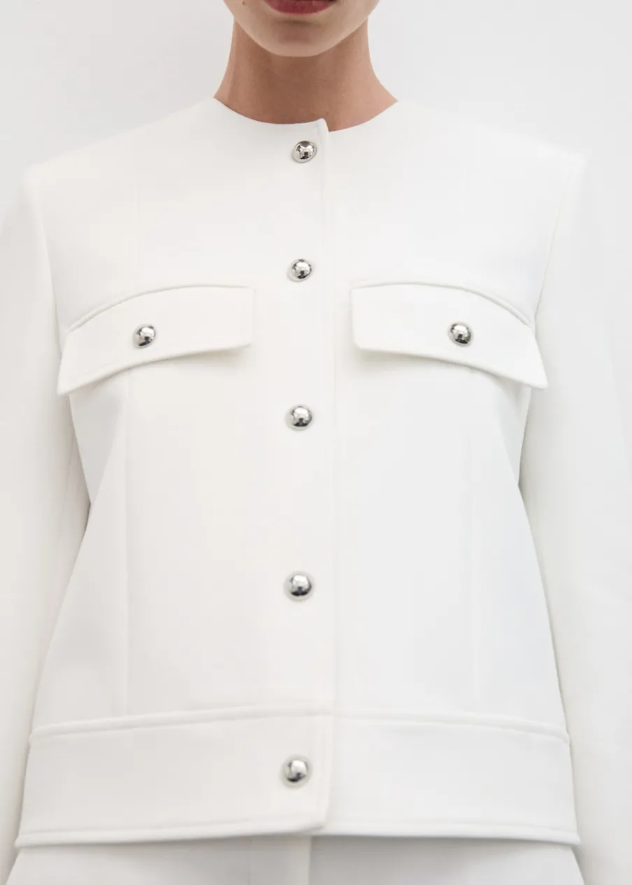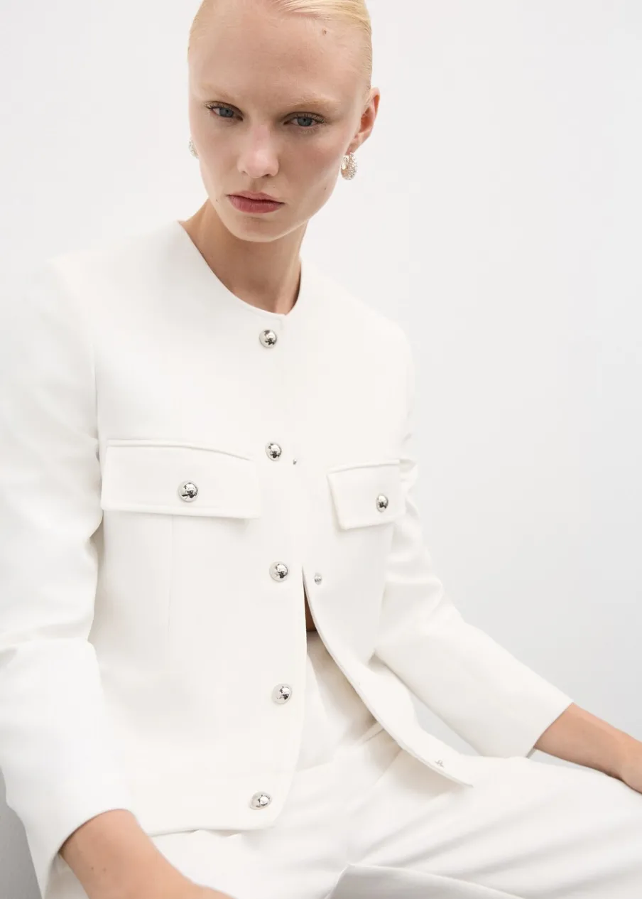 Model prosty. Okrągły dekolt. Długi rękaw. Zapięcie na zatrzaski z przodu. Dwie przednie kieszenie z patką i guzikiem. Ozdobne szwy. Total look.