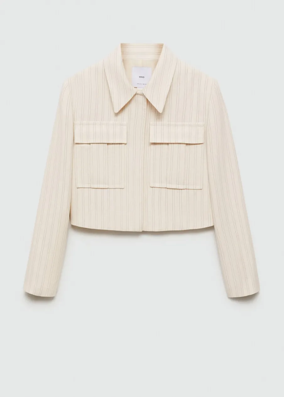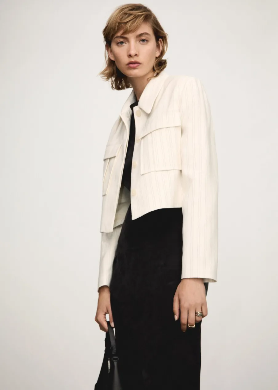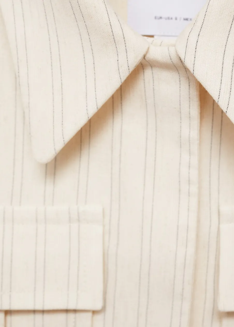 Tkanina mieszanka bawełny i lnu. Model prosty. Koszulowy kołnierz. Długi rękaw. Dwie kieszenie nakładane z przodu. Wewnętrzna podszewka. Total look. Kryte zapięcie na guziki z przodu. Wzór w paski.