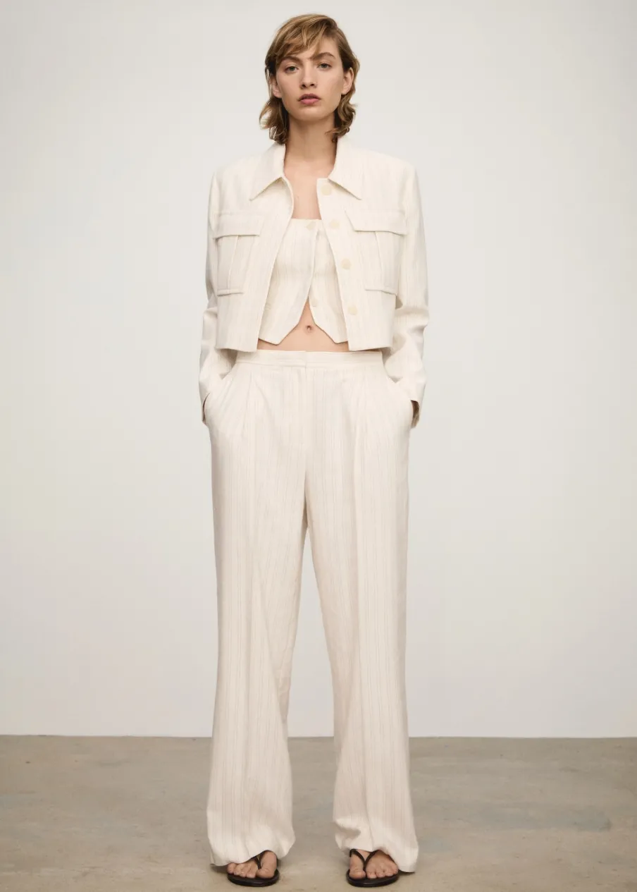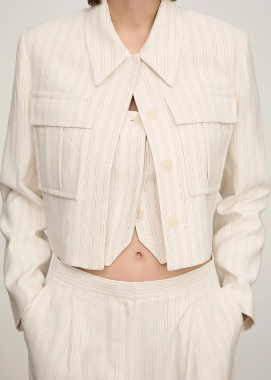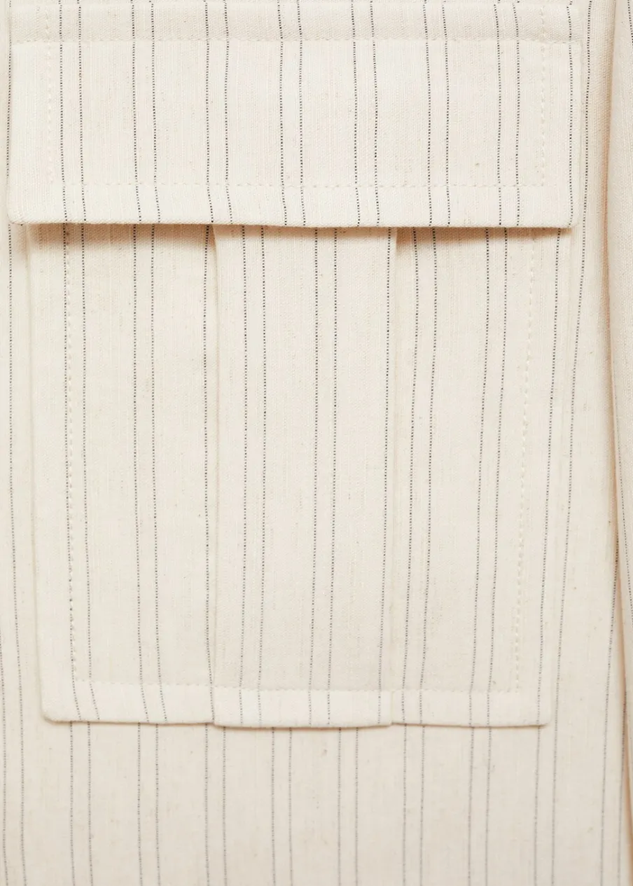 Tkanina mieszanka bawełny i lnu. Model prosty. Koszulowy kołnierz. Długi rękaw. Dwie kieszenie nakładane z przodu. Wewnętrzna podszewka. Total look. Kryte zapięcie na guziki z przodu. Wzór w paski.