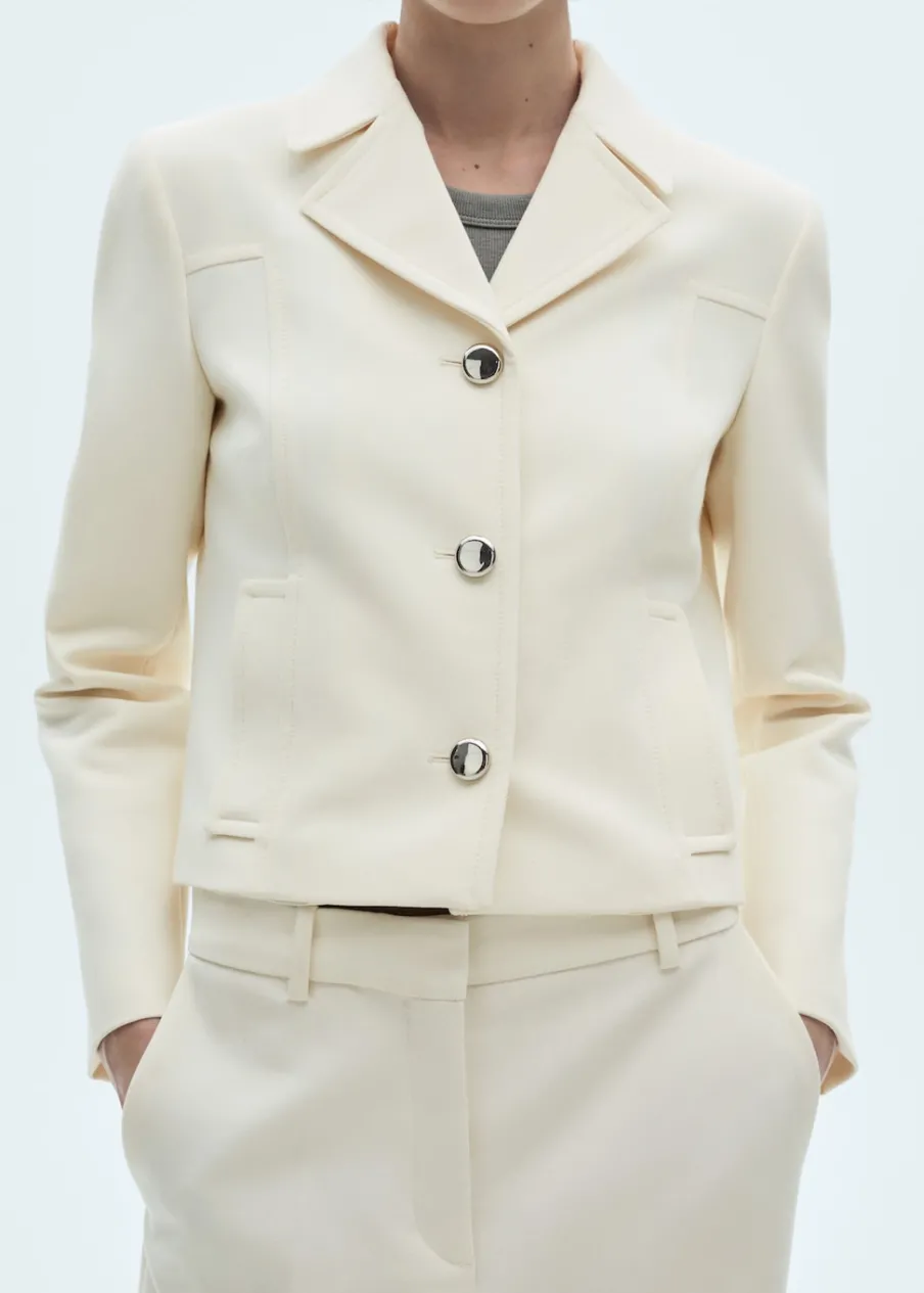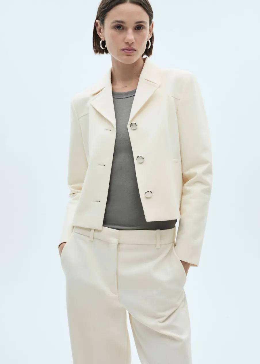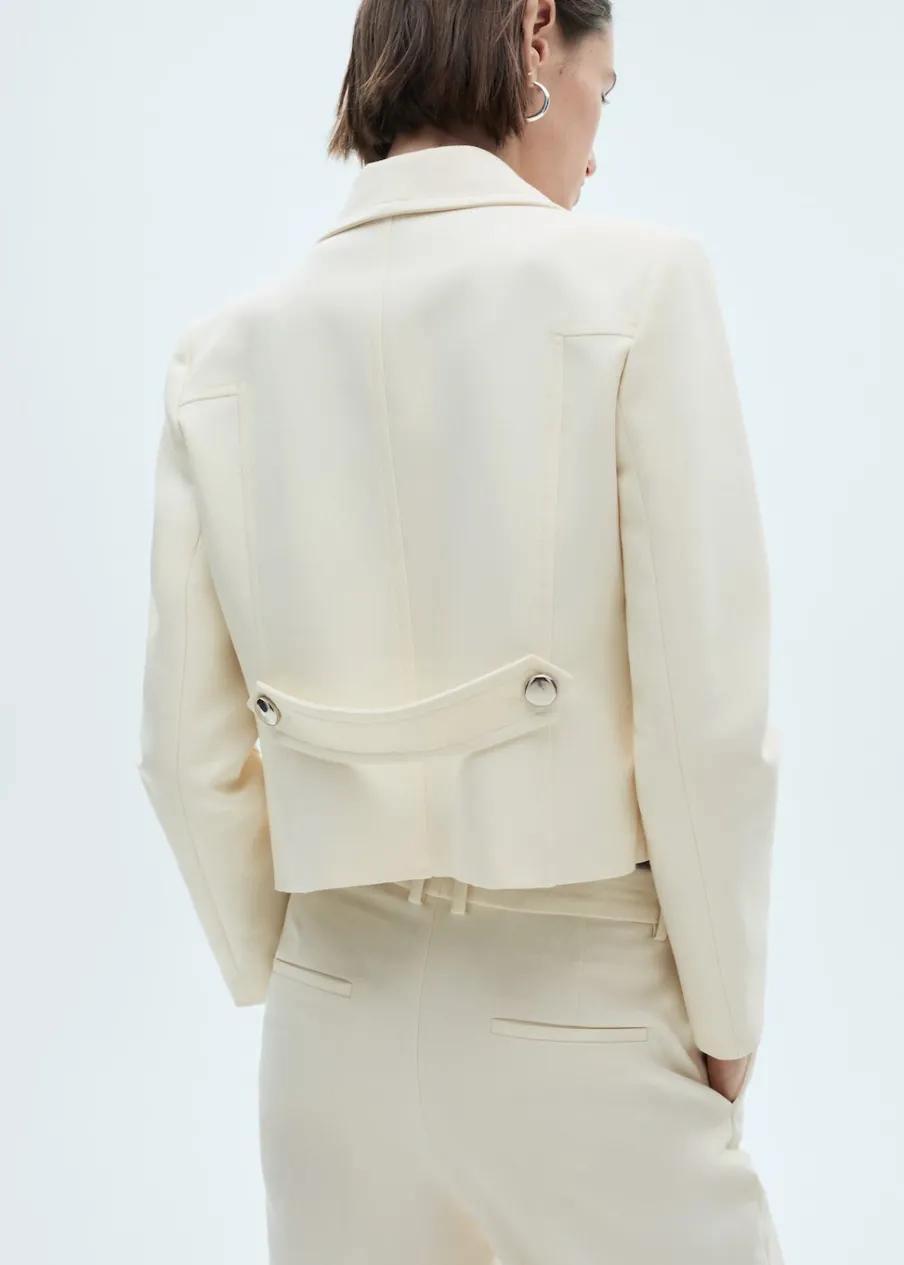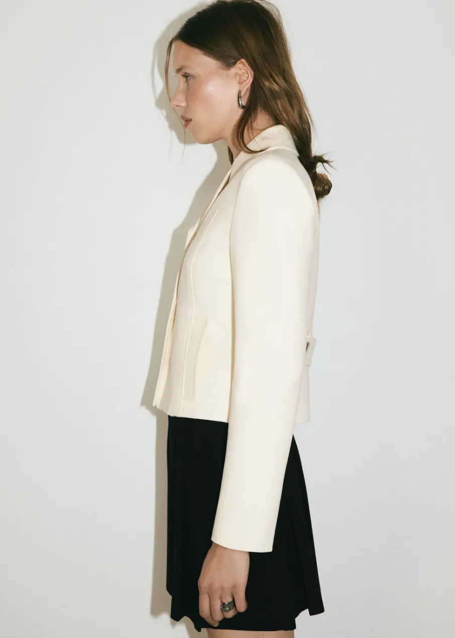 Model prosty. Dekolt w szpic z kołnierzykiem. Długi rękaw. Dwie kieszenie boczne. Zapięcie na metalowe guziki z przodu. Wewnętrzna podszewka. Modelka ma 179 cm wzrostu i nosi rozmiar S/36.