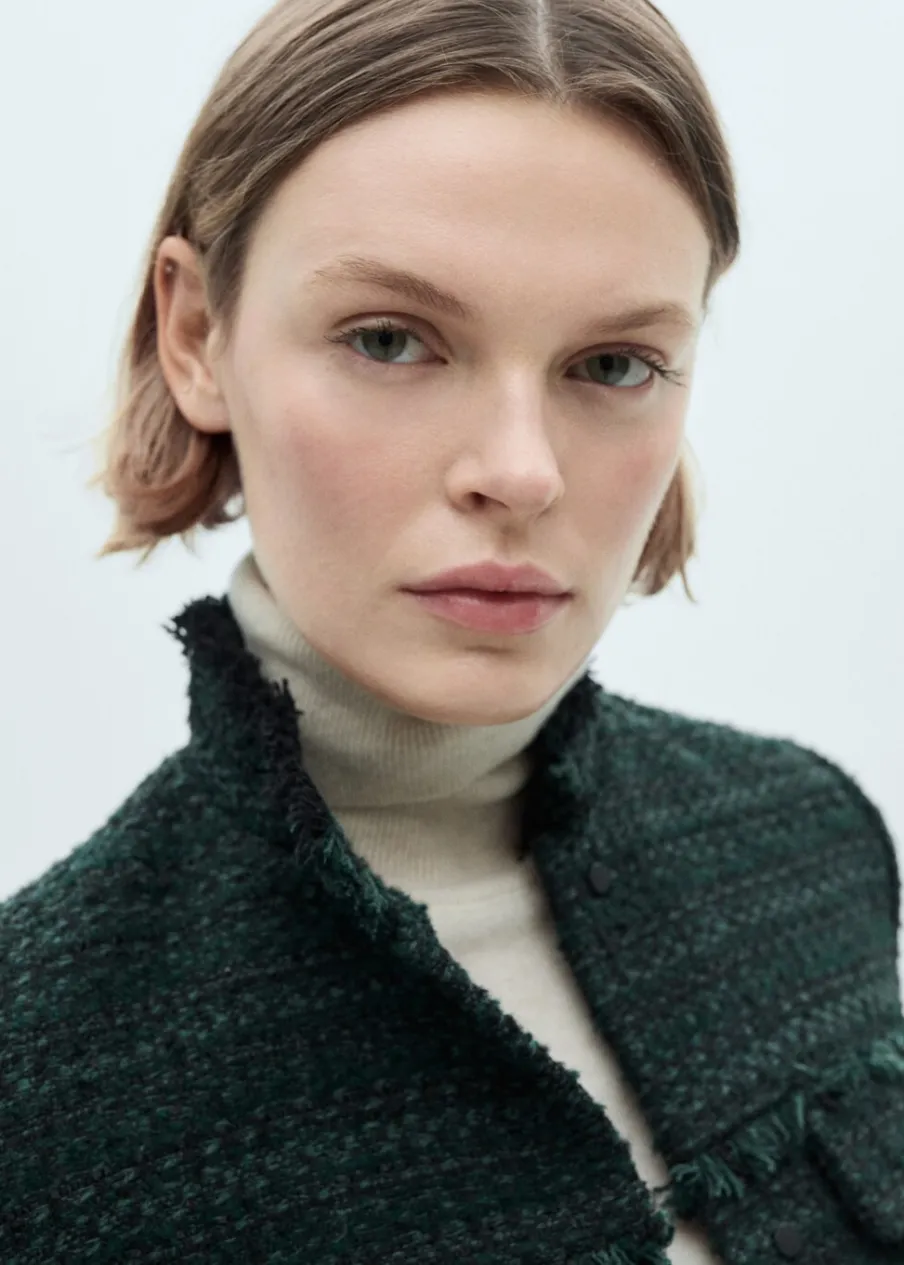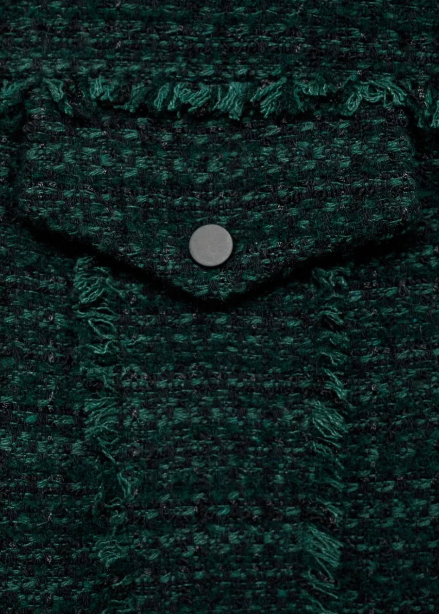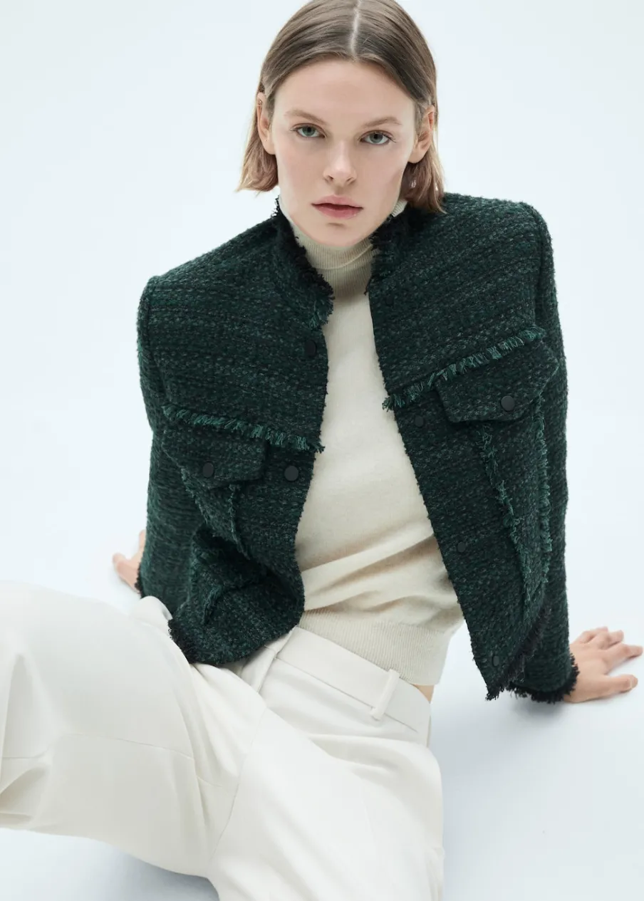 Tkanina mieszanka bawełny. Tkanina tweedowa. Model prosty. Krótki krój. Golf. Długi rękaw. Zapięcie z przodu na guziki. Dwie przednie kieszenie z patką i guzikiem. Postrzępione wykończenia. Ozdobne szwy. Modelka ma 180 cm wzrostu i nosi rozmiar S/36.