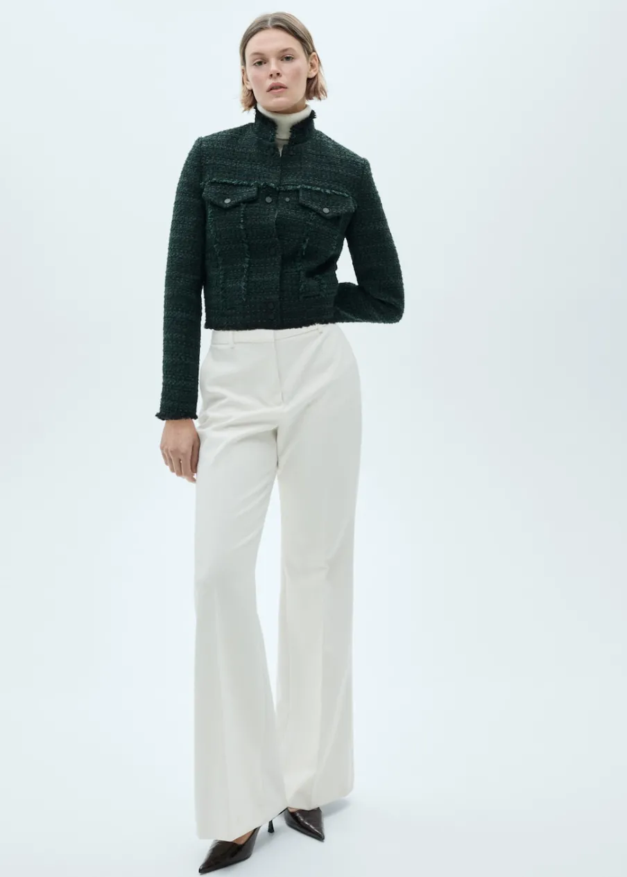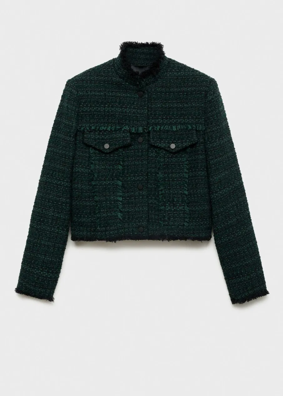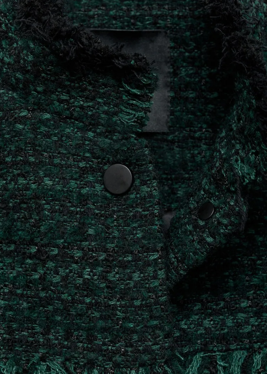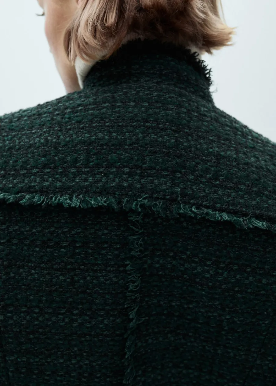 Tkanina mieszanka bawełny. Tkanina tweedowa. Model prosty. Krótki krój. Golf. Długi rękaw. Zapięcie z przodu na guziki. Dwie przednie kieszenie z patką i guzikiem. Postrzępione wykończenia. Ozdobne szwy. Modelka ma 180 cm wzrostu i nosi rozmiar S/36.