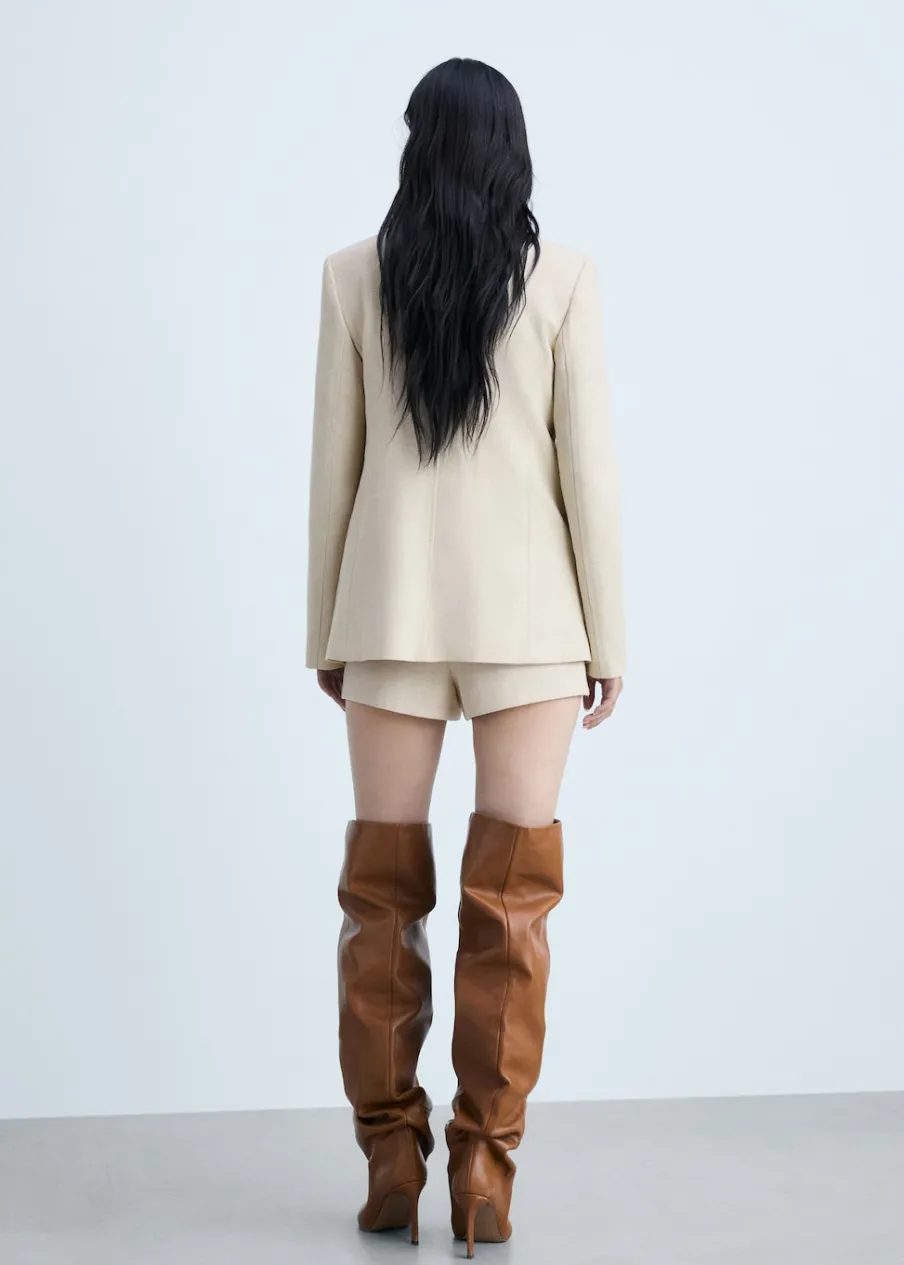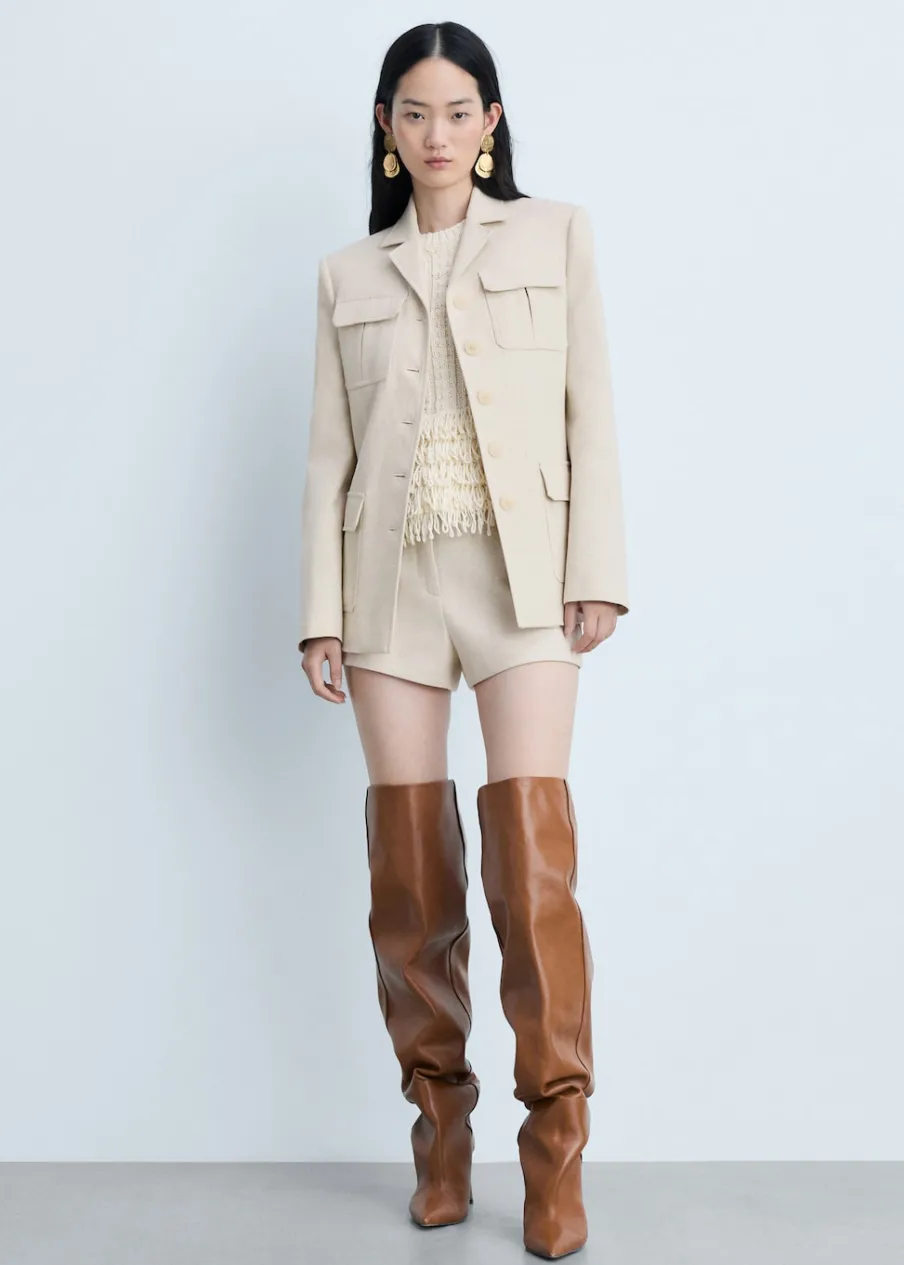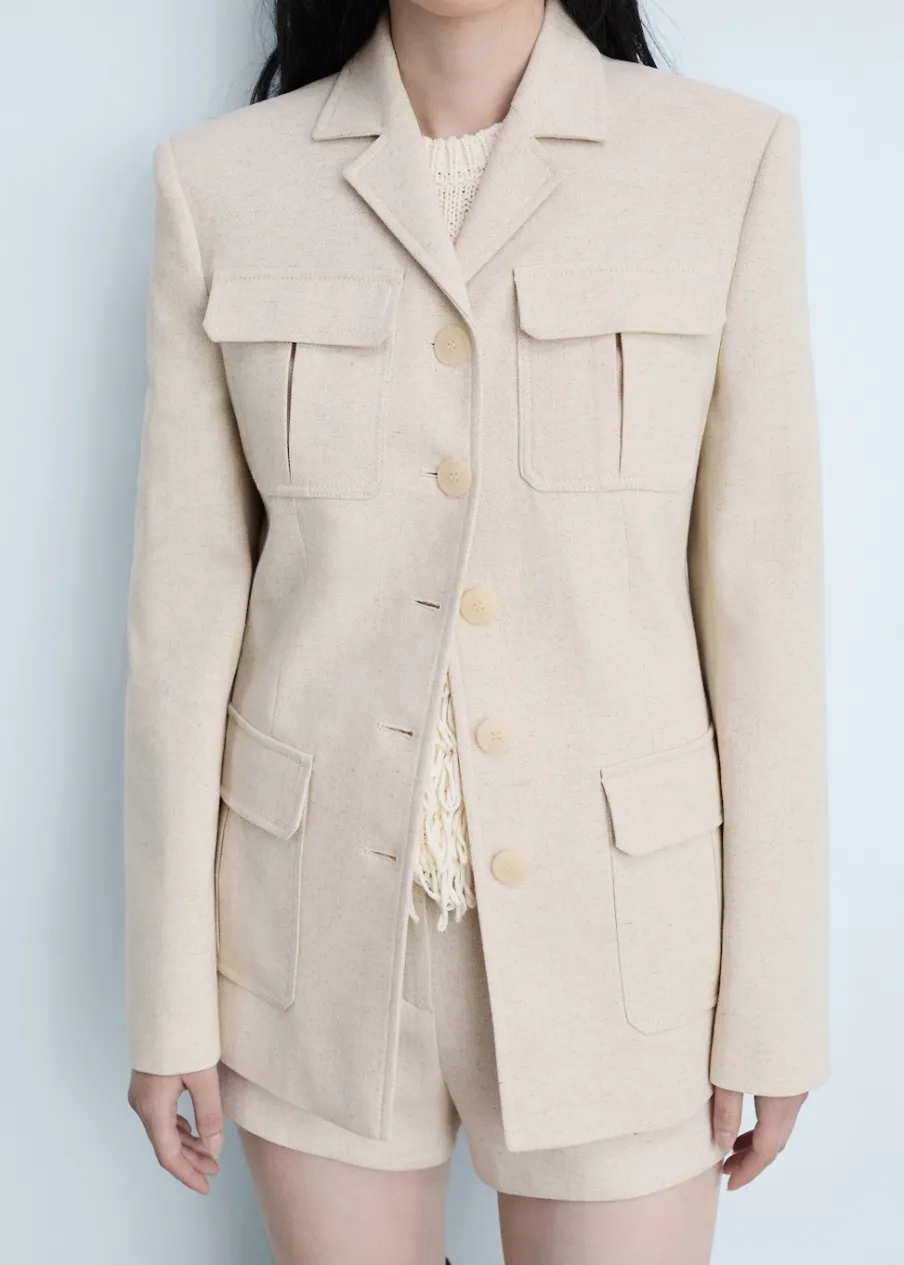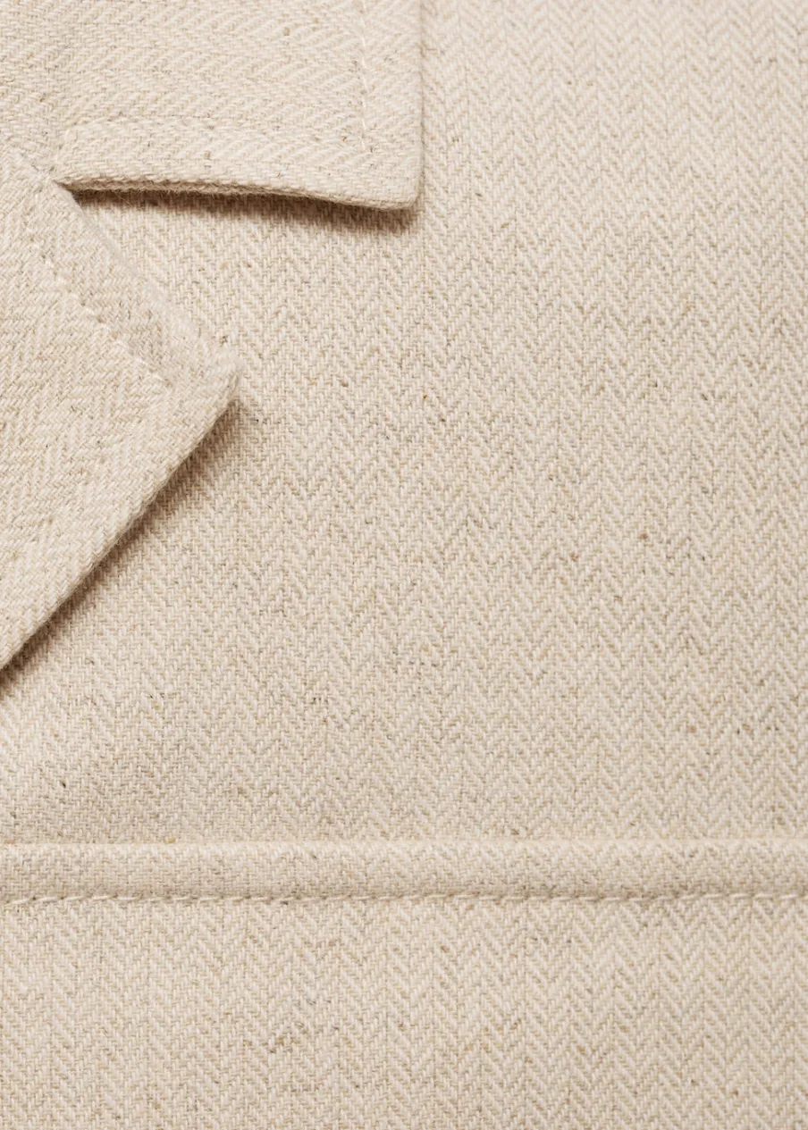Tkanina mieszanka bawełny i lnu. Model prosty. Kołnierz z klapami. Klapy z nacięciem. Długi rękaw z guzikami na mankietach. Cztery kieszenie z patkami z przodu. Wewnętrzna podszewka. Total look. Zapięcie na guziki z przodu. Tkanina w jodełkę.