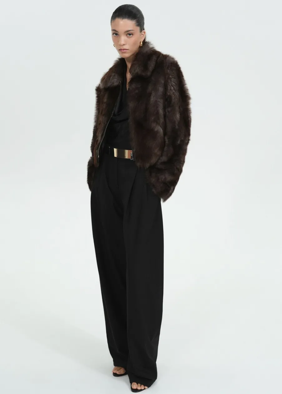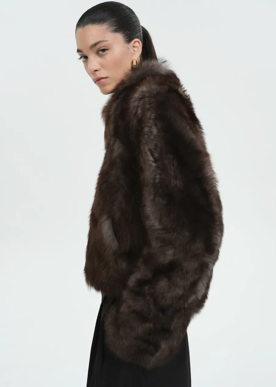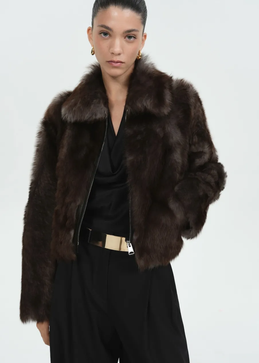 Skóra owcza 100%. Futro. Ciężka struktura. Model dwustronny. Model prosty. Krótki krój. Koszulowy kołnierz. Długi rękaw. Zapięcie z przodu na suwak. Dwie kieszenie boczne. Modelka ma 177 cm wzrostu i nosi rozmiar S/36. Kolekcja wizytowa. Kolekcja Selection.