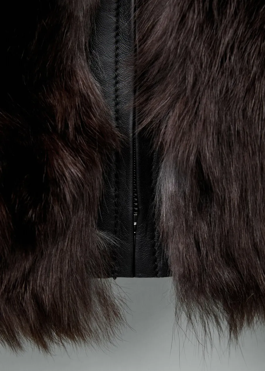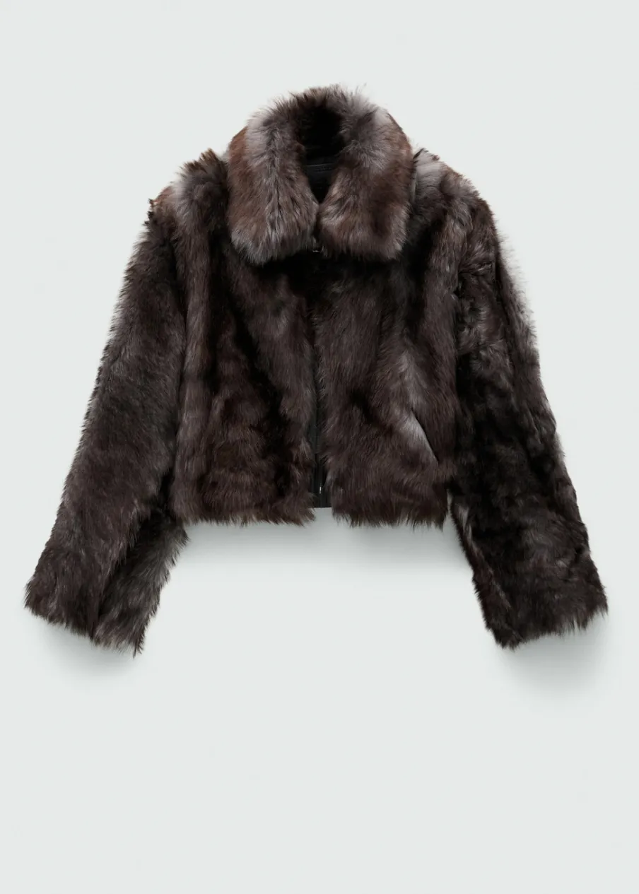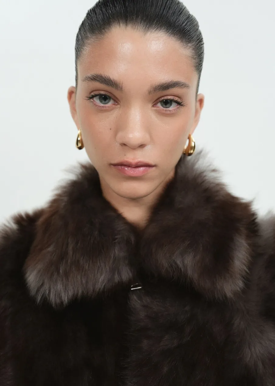 Skóra owcza 100%. Futro. Ciężka struktura. Model dwustronny. Model prosty. Krótki krój. Koszulowy kołnierz. Długi rękaw. Zapięcie z przodu na suwak. Dwie kieszenie boczne. Modelka ma 177 cm wzrostu i nosi rozmiar S/36. Kolekcja wizytowa. Kolekcja Selection.