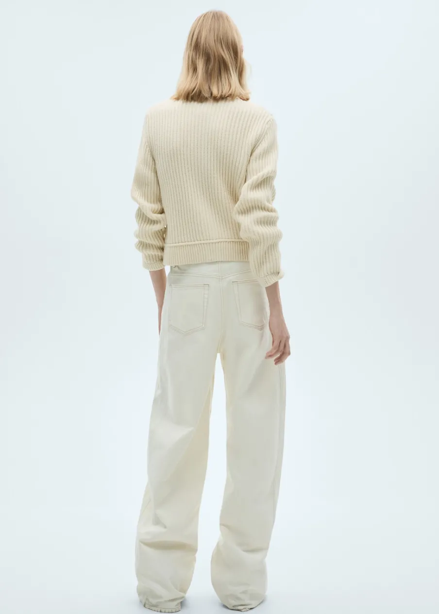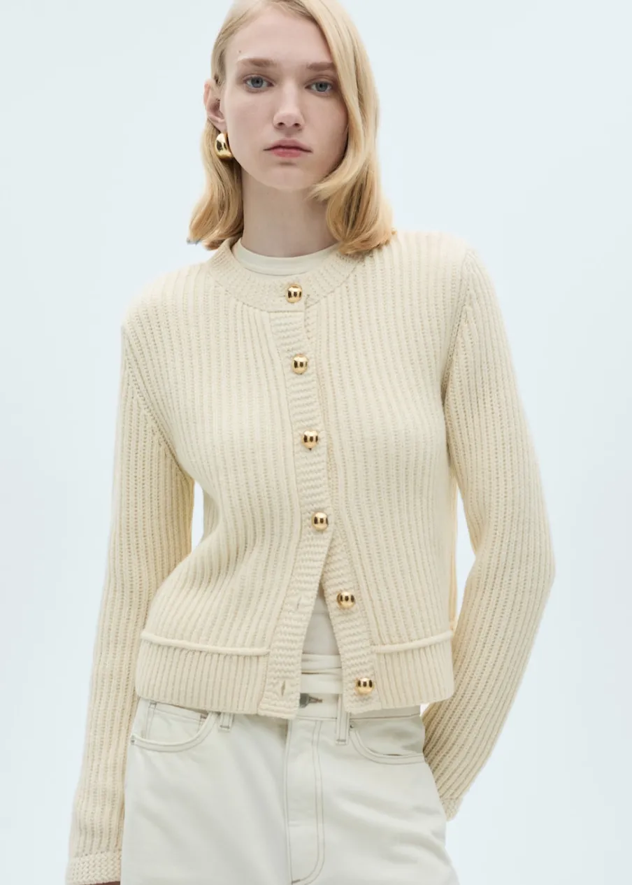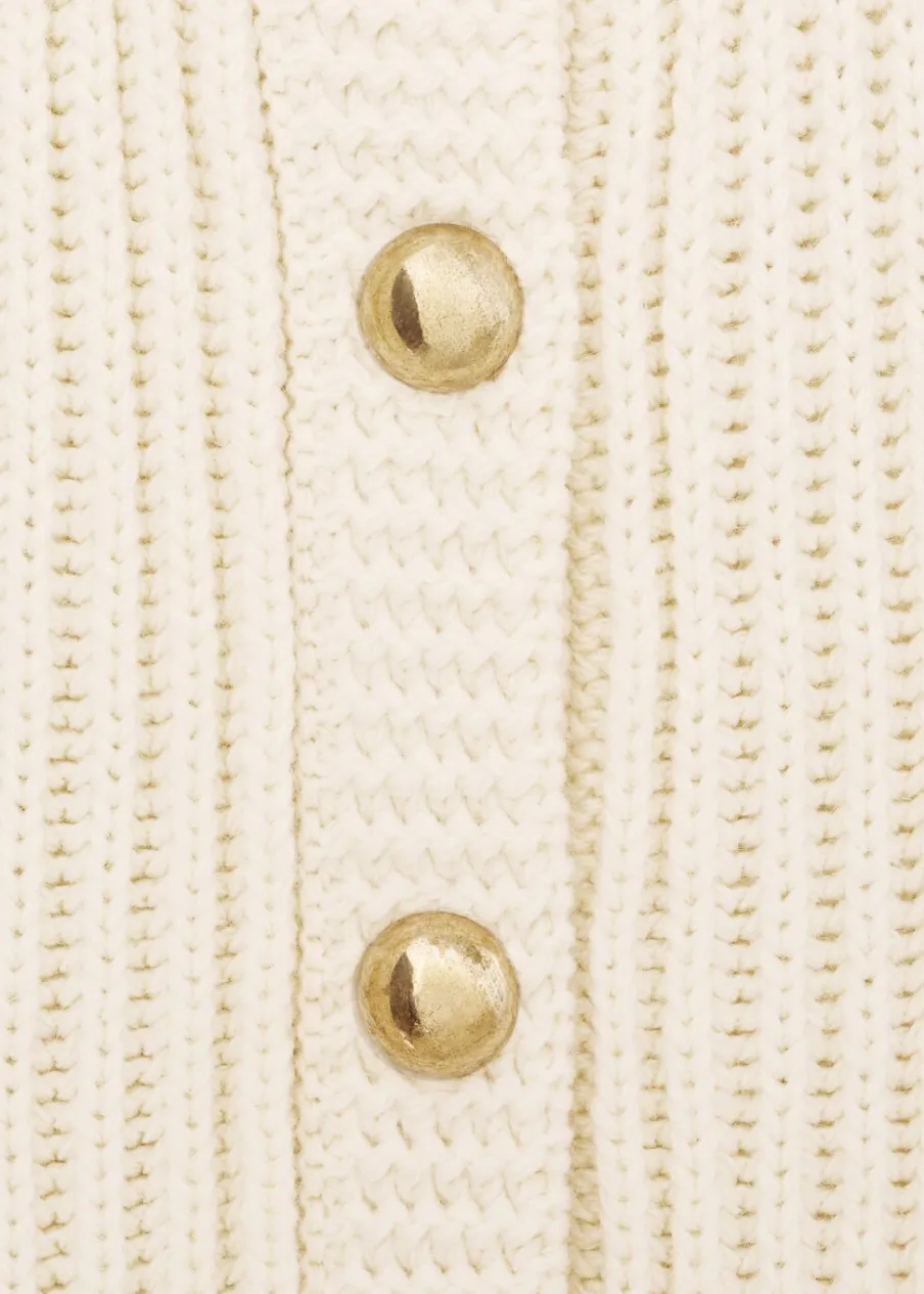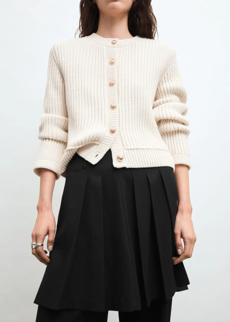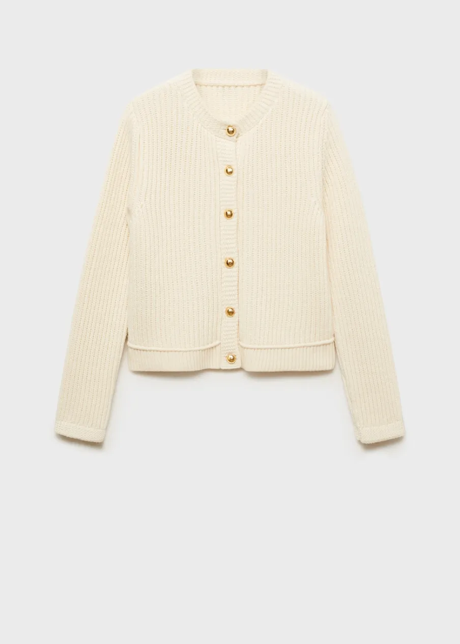 Dzianina o średniej grubości. Model standardowy. Model prosty. Okrągły dekolt. Długi rękaw. Zapięcie z przodu na guziki. Biżuteryjne guziki.