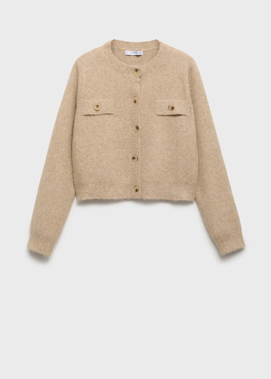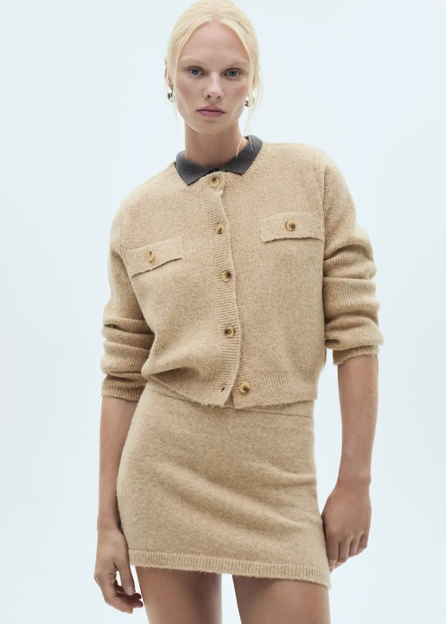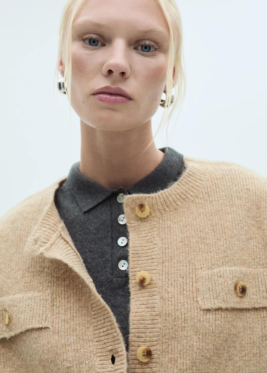 Tkanina mieszanka wełny. Ściągaczowa dzianina. Dzianina średniej grubości. Krótki krój. Model prosty. Okrągły dekolt. Długi rękaw. Zapięcie z przodu na guziki. Dwie przednie kieszenie z patką i guzikiem. Modelka ma 178 cm wzrostu i nosi rozmiar S/36. Total look.
