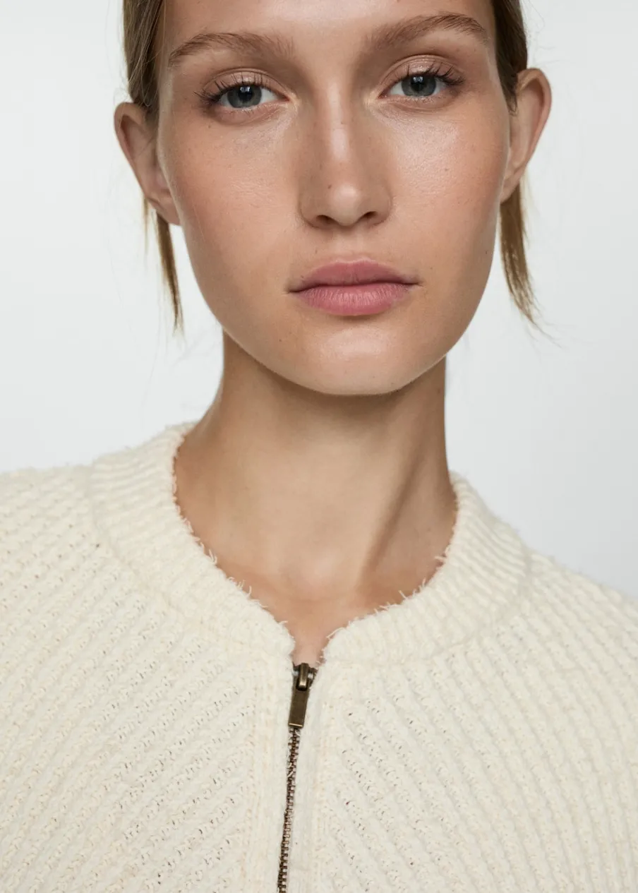 Tkanina z grubej dzianiny. Tkanina mieszanka bawełny. Model prosty. Okrągły dekolt. Długi rękaw z elastycznymi mankietami. Zapięcie na zamek z przodu. Elastyczne wykończenia.