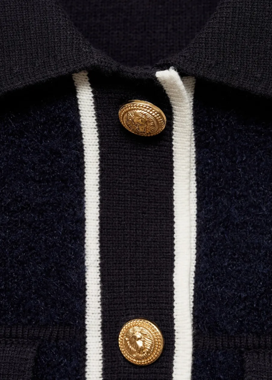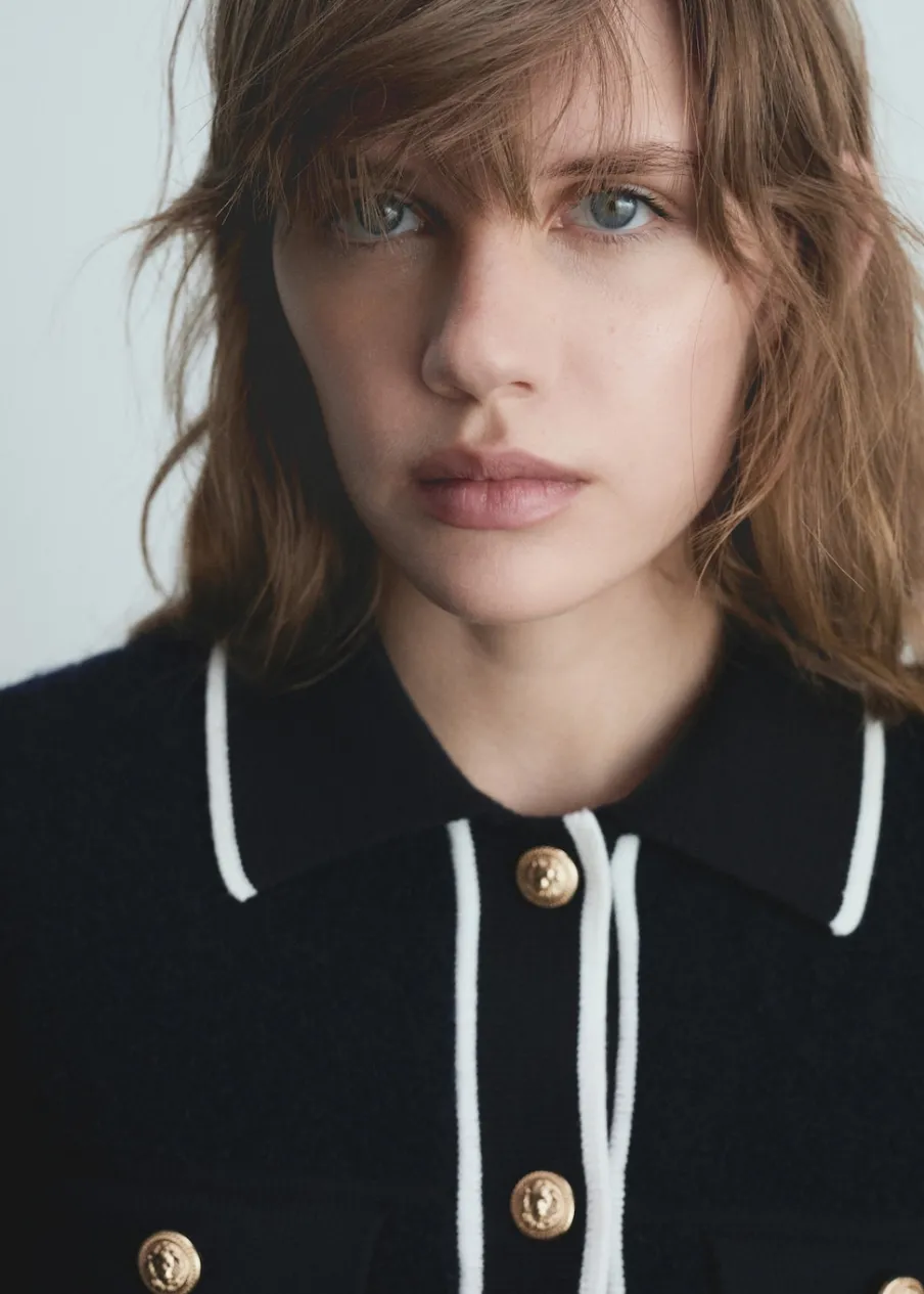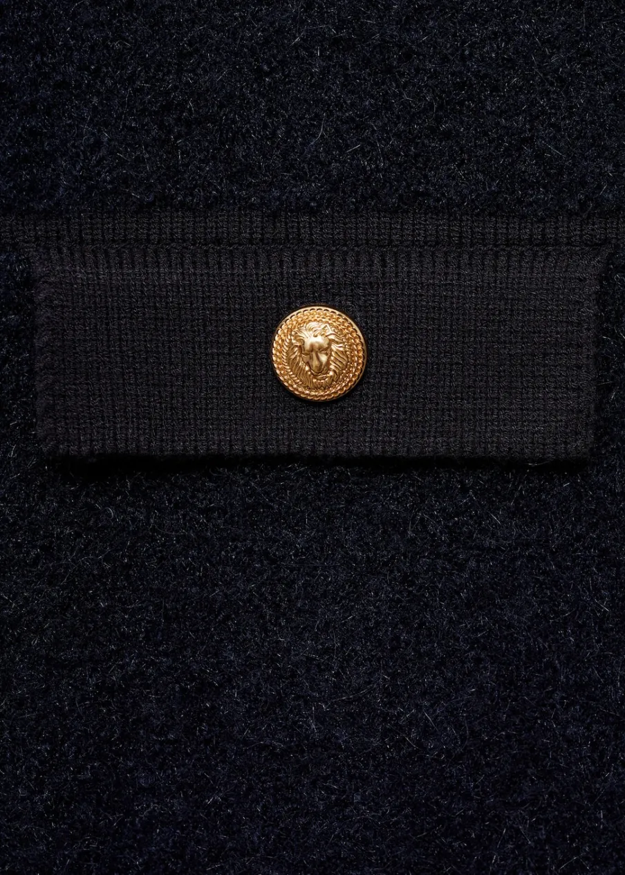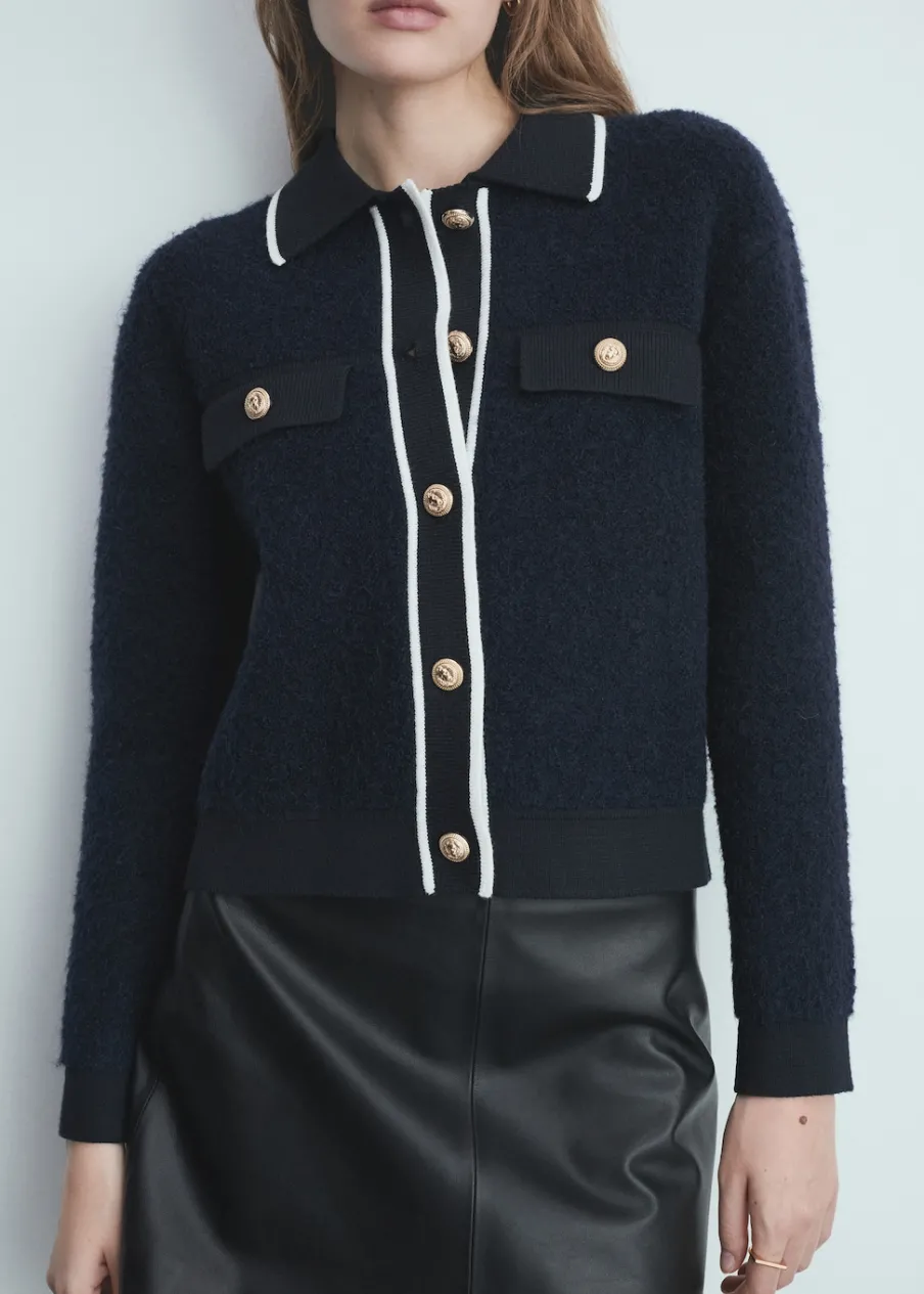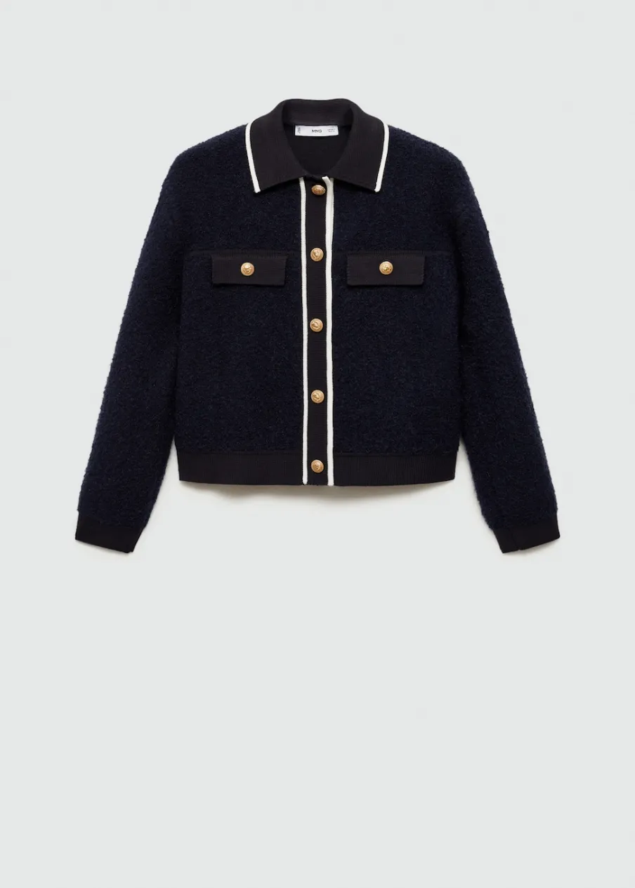 Tkanina z grubej dzianiny. Model prosty. Koszulowy kołnierz. Długi rękaw z elastycznymi mankietami. Dwie kieszenie z patką na piersi. Bez podszewki. Kontrastowe wykończenie. Modelka ma 178 cm wzrostu i nosi rozmiar S/36. Zapięcie na guziki z przodu.