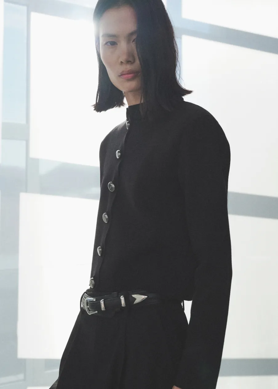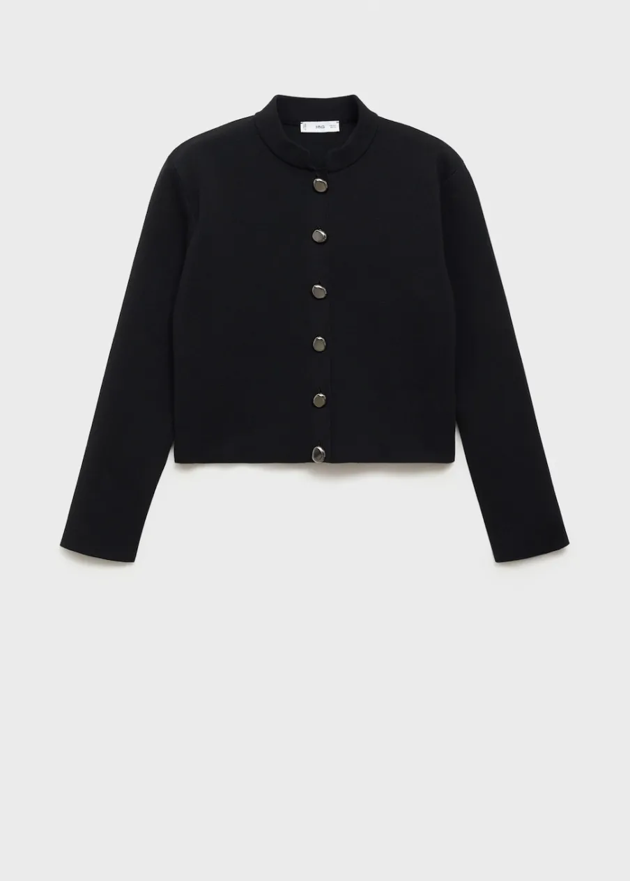 Tkanina z cienkiej dzianiny. Model prosty. Stójkowy kołnierzyk. Długi rękaw. Zapięcie na guziki z przodu. Biżuteryjne guziki.