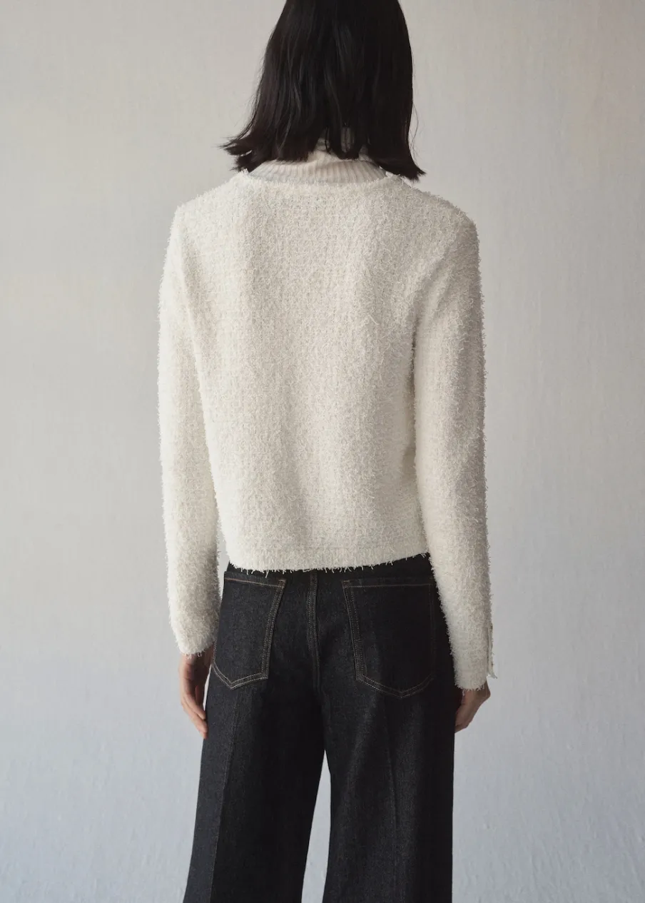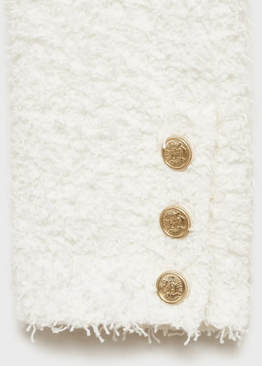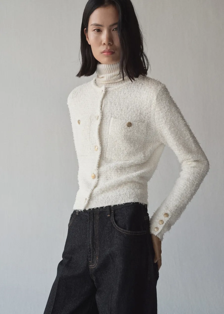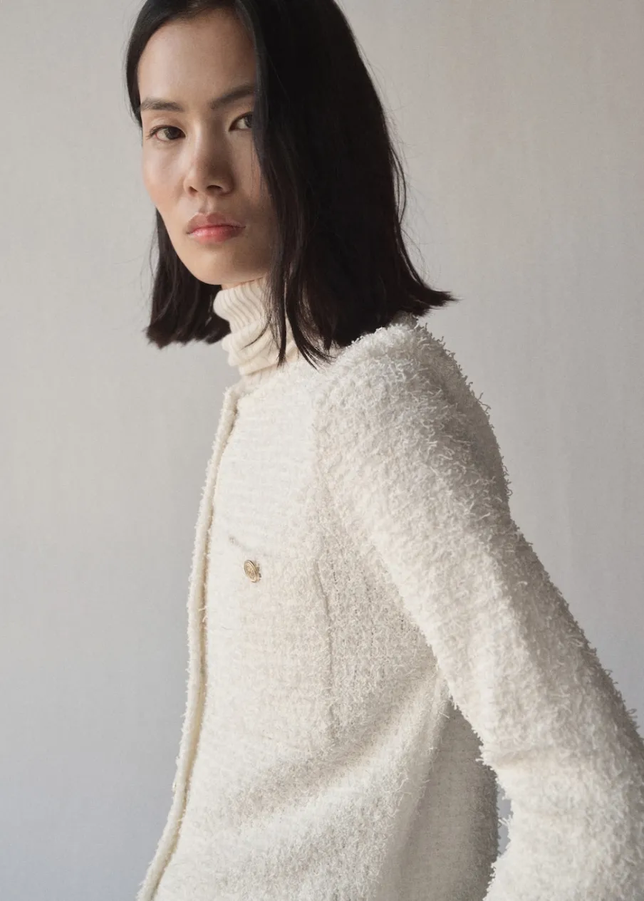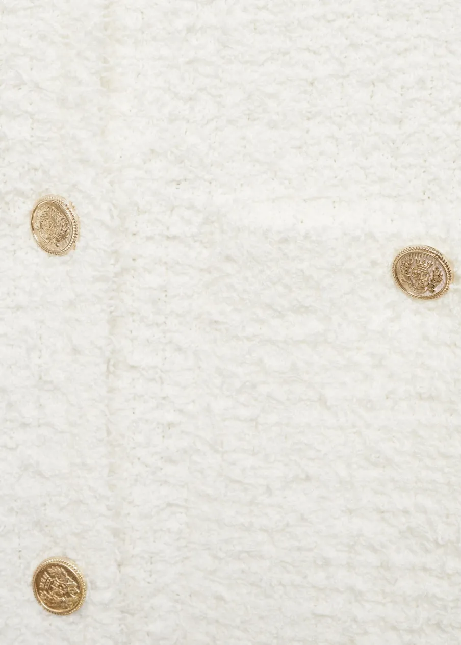 Tkanina tweedowa. Model prosty. Model standardowy. Okrągły dekolt. Długi rękaw. Dwie kieszenie naszyte na piersi. Zapięcie z przodu na guziki. Biżuteryjne guziki.