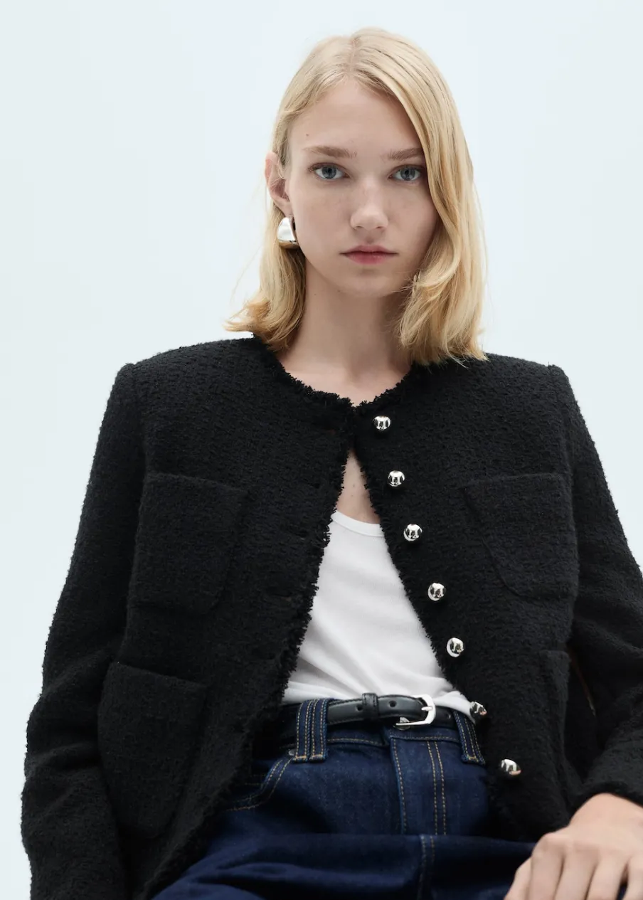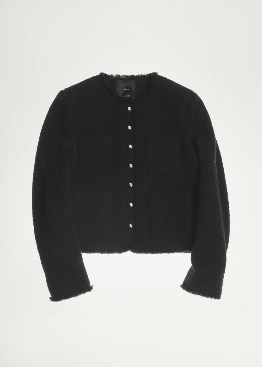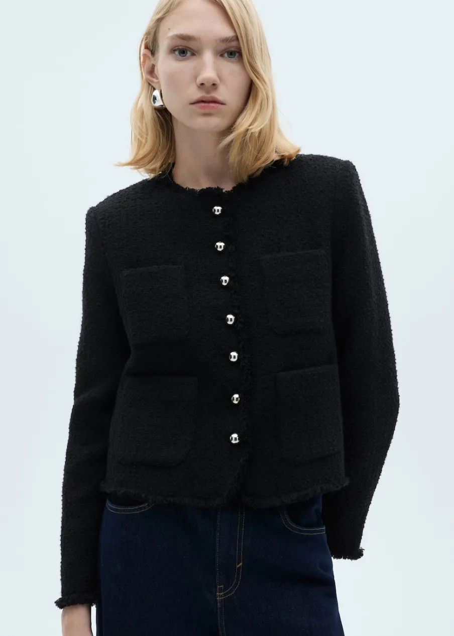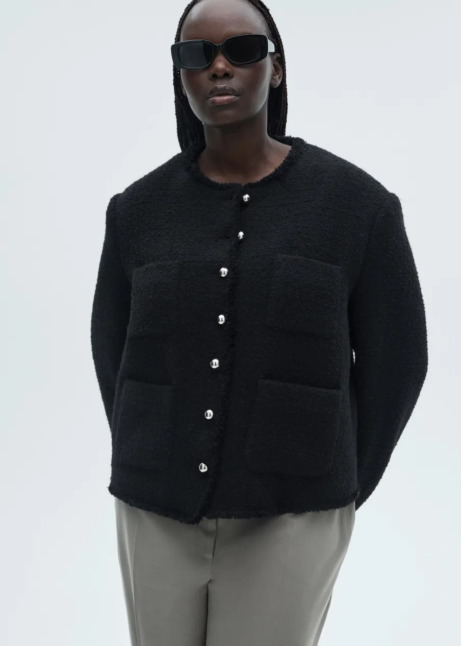 Tkanina z mieszanki bawełny i wełny. Tkanina tweedowa. Model prosty. Średnia wielkość. Okrągły dekolt. Długi rękaw. Zapinane mankiety. Dwie kieszenie naszyte z przodu. Zapięcie z przodu na guziki. Postrzępione wykończenia. Tylko podszewka. Dostępne w Plus Size.