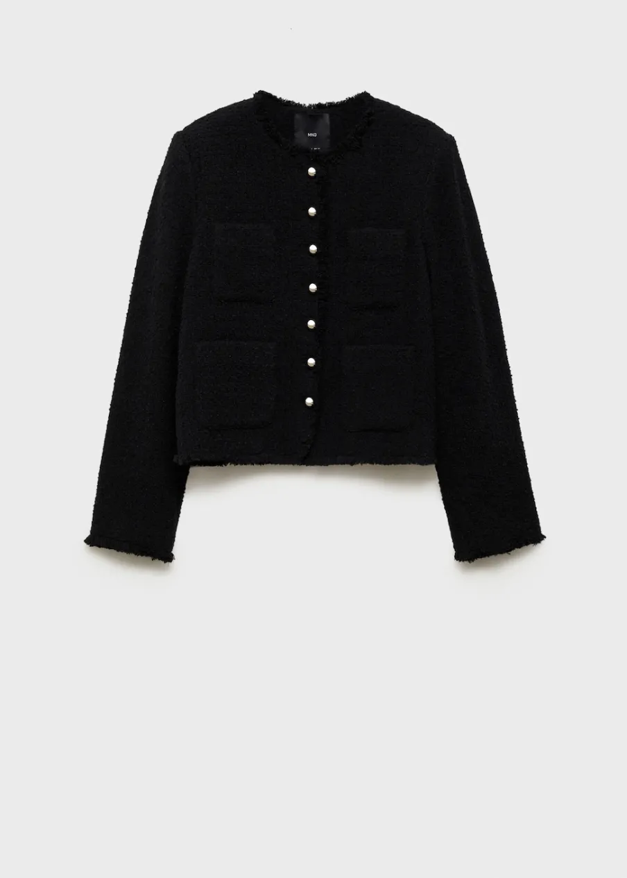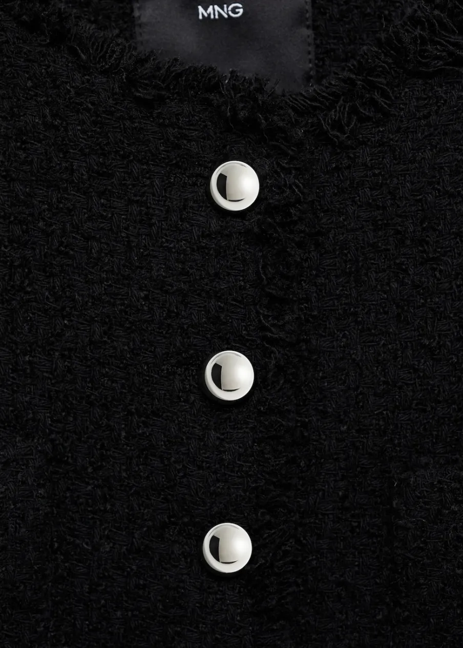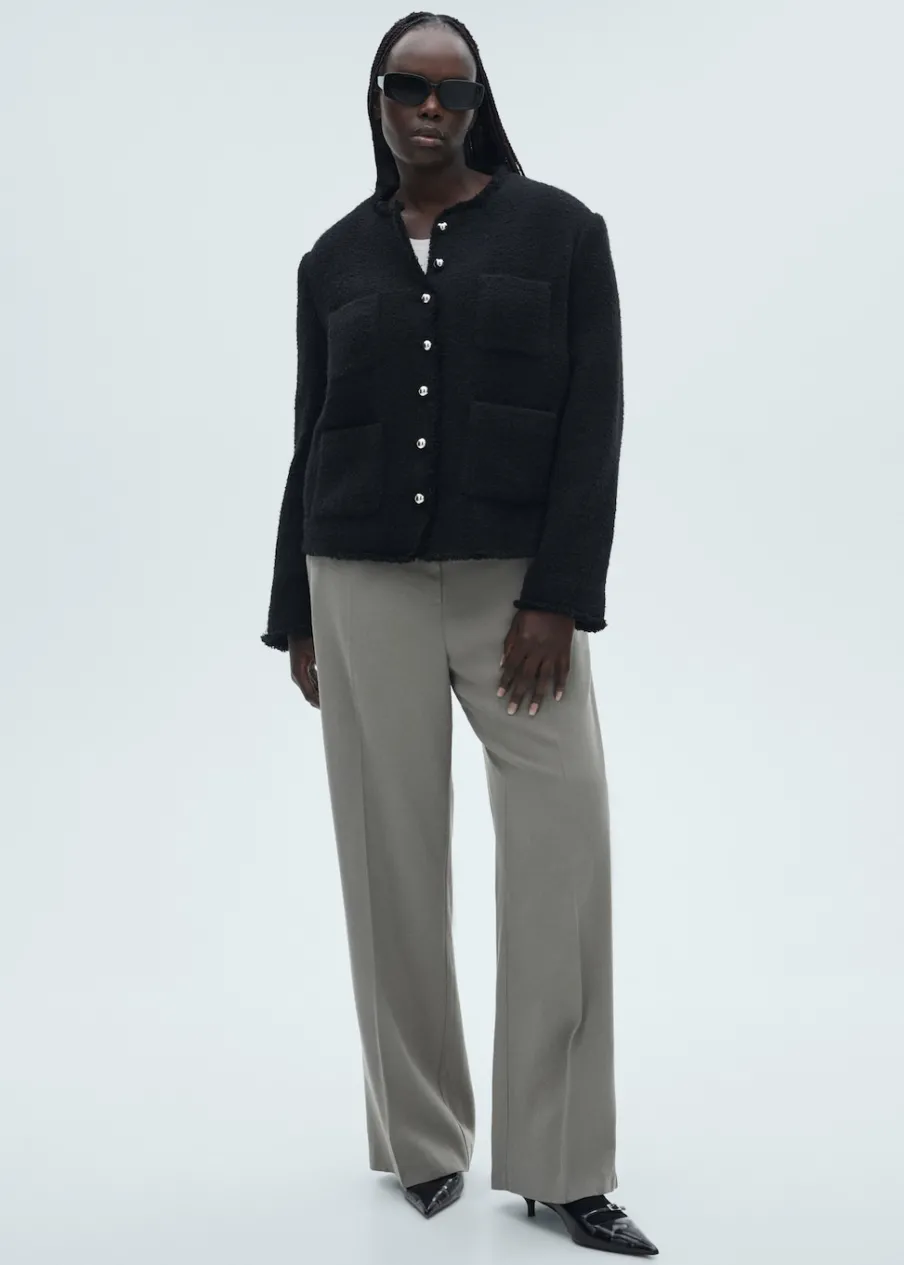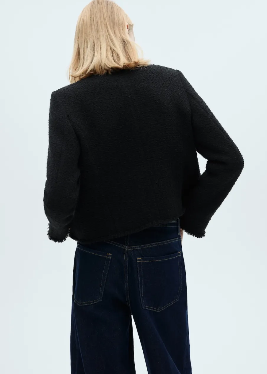 Tkanina z mieszanki bawełny i wełny. Tkanina tweedowa. Model prosty. Średnia wielkość. Okrągły dekolt. Długi rękaw. Zapinane mankiety. Dwie kieszenie naszyte z przodu. Zapięcie z przodu na guziki. Postrzępione wykończenia. Tylko podszewka. Dostępne w Plus Size.