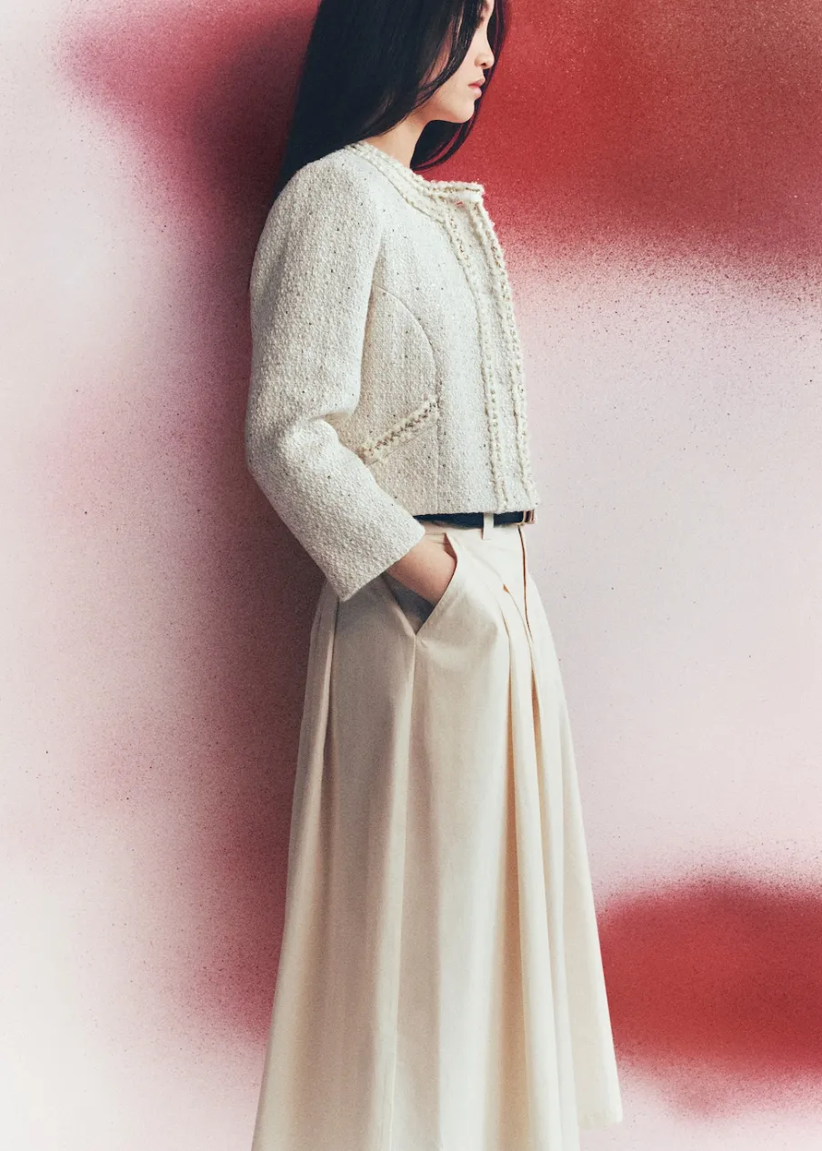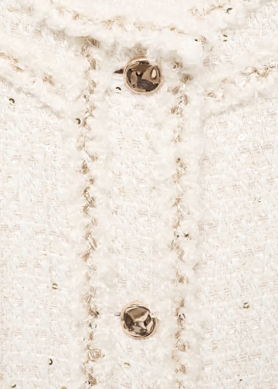Tkanina tweedowa. Model prosty. Model standardowy. Okrągły dekolt. Długi rękaw. Dwie wpuszczene kieszenie z przodu. Zapięcie z przodu na guziki. Biżuteryjne guziki. Wewnętrzna podszewka.
