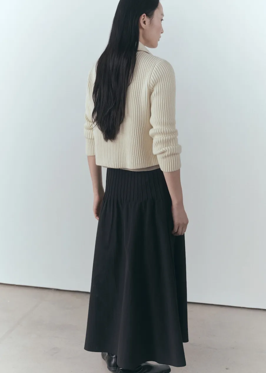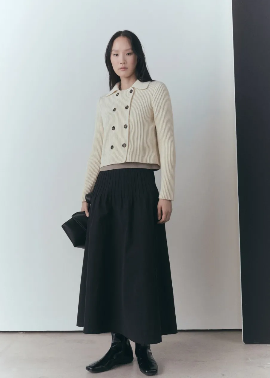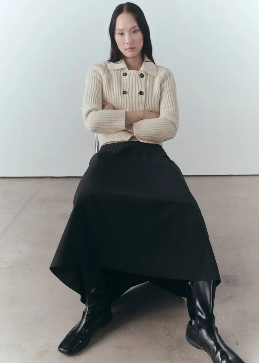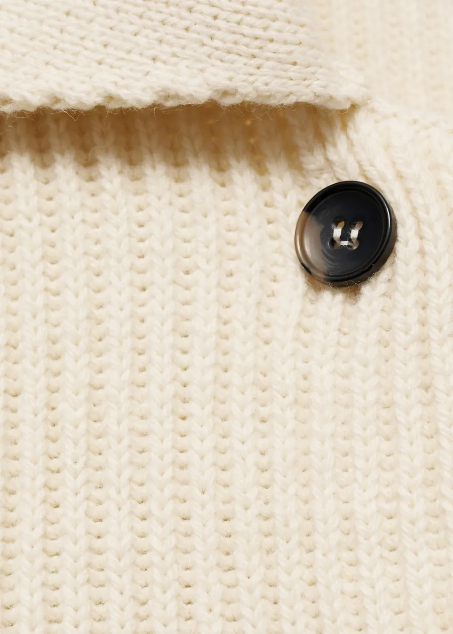 Dzianina średniej grubości. Tkanina ze ściągaczowej dzianiny. Model prosty. Koszulowy kołnierz. Okrągły dekolt. Długi rękaw. Zapięcie z przodu na guziki. Modelka ma 175 cm wzrostu i nosi rozmiar S/36.