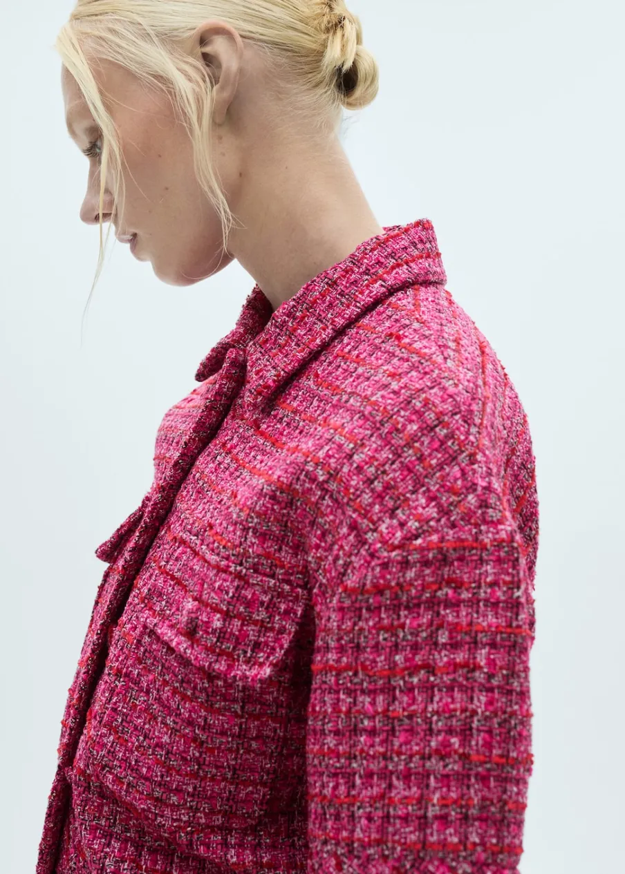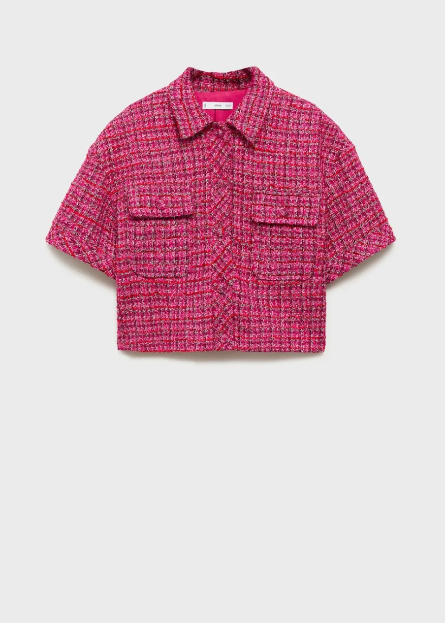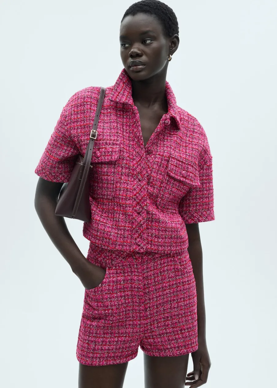 Tkanina tweedowa. Model oversize. Krótki rękaw. Dwie kieszenie z klapą naszyte z przodu. Zapięcie z przodu na guziki. Modelka ma 178 cm wzrostu i nosi rozmiar S/36. Koszulowy kołnierz. Modelka ma 179 cm wzrostu i nosi rozmiar S/36. Total look.
