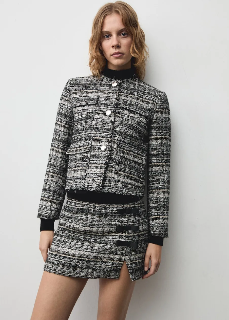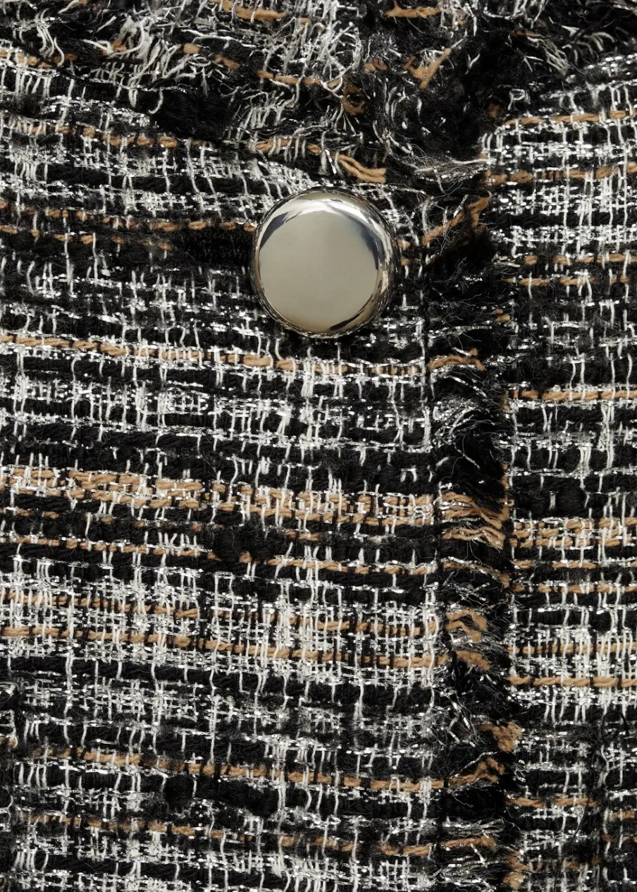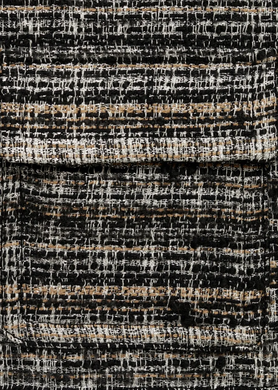 Tkanina tweedowa. Model prosty. Okrągły dekolt. Długi rękaw. Cztery kieszenie z patkami z przodu. Zapięcie z przodu na guziki. Metalowe guziki. Wewnętrzna podszewka. Total look. Modelka ma 178 cm wzrostu i nosi rozmiar S/36.
