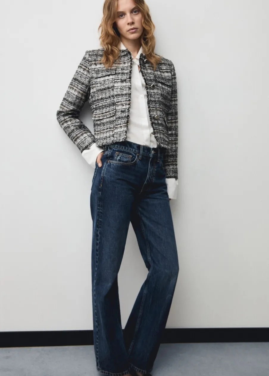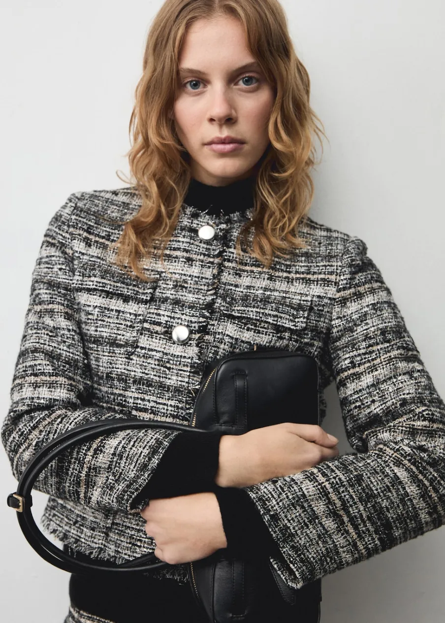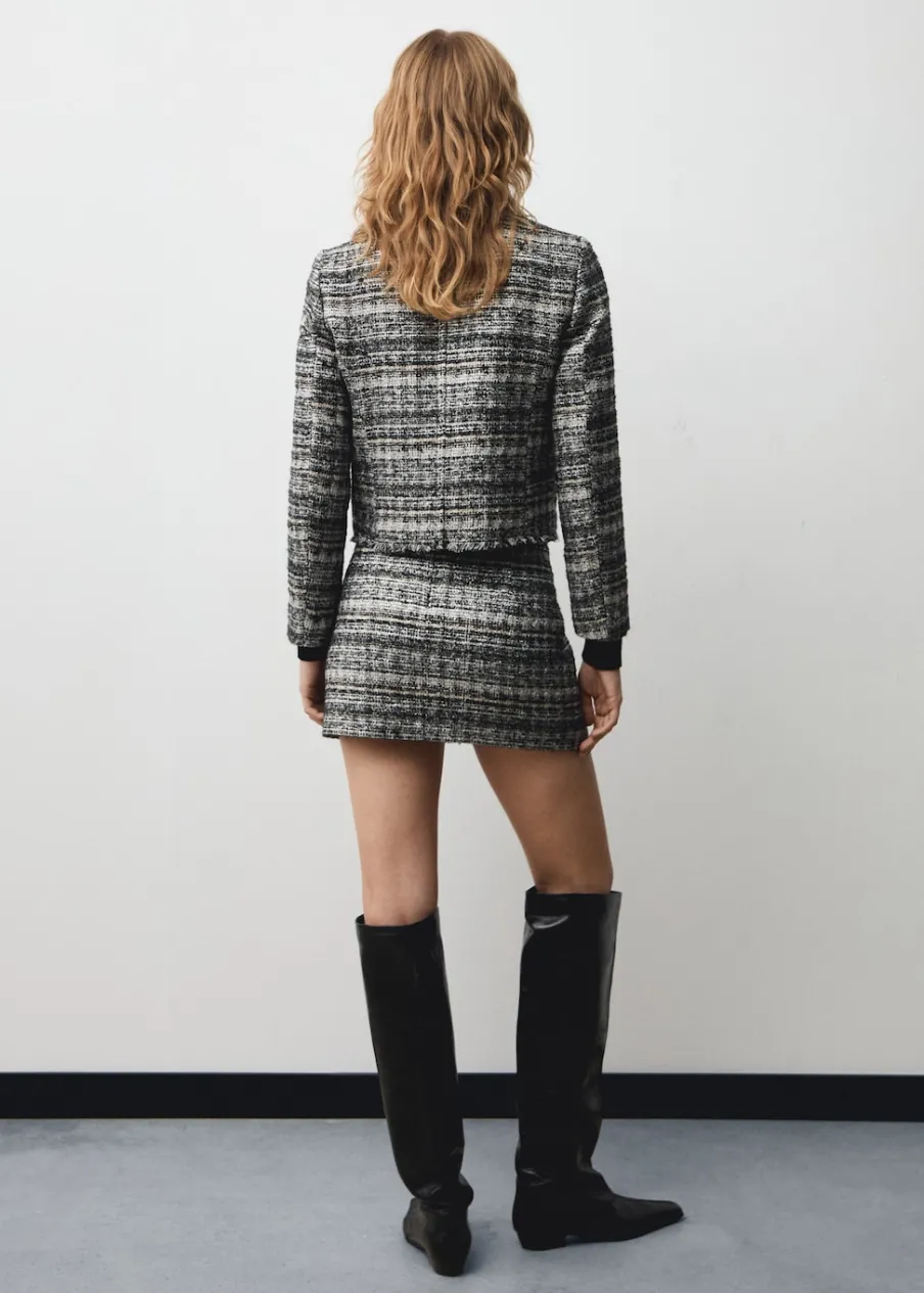 Tkanina tweedowa. Model prosty. Okrągły dekolt. Długi rękaw. Cztery kieszenie z patkami z przodu. Zapięcie z przodu na guziki. Metalowe guziki. Wewnętrzna podszewka. Total look. Modelka ma 178 cm wzrostu i nosi rozmiar S/36.