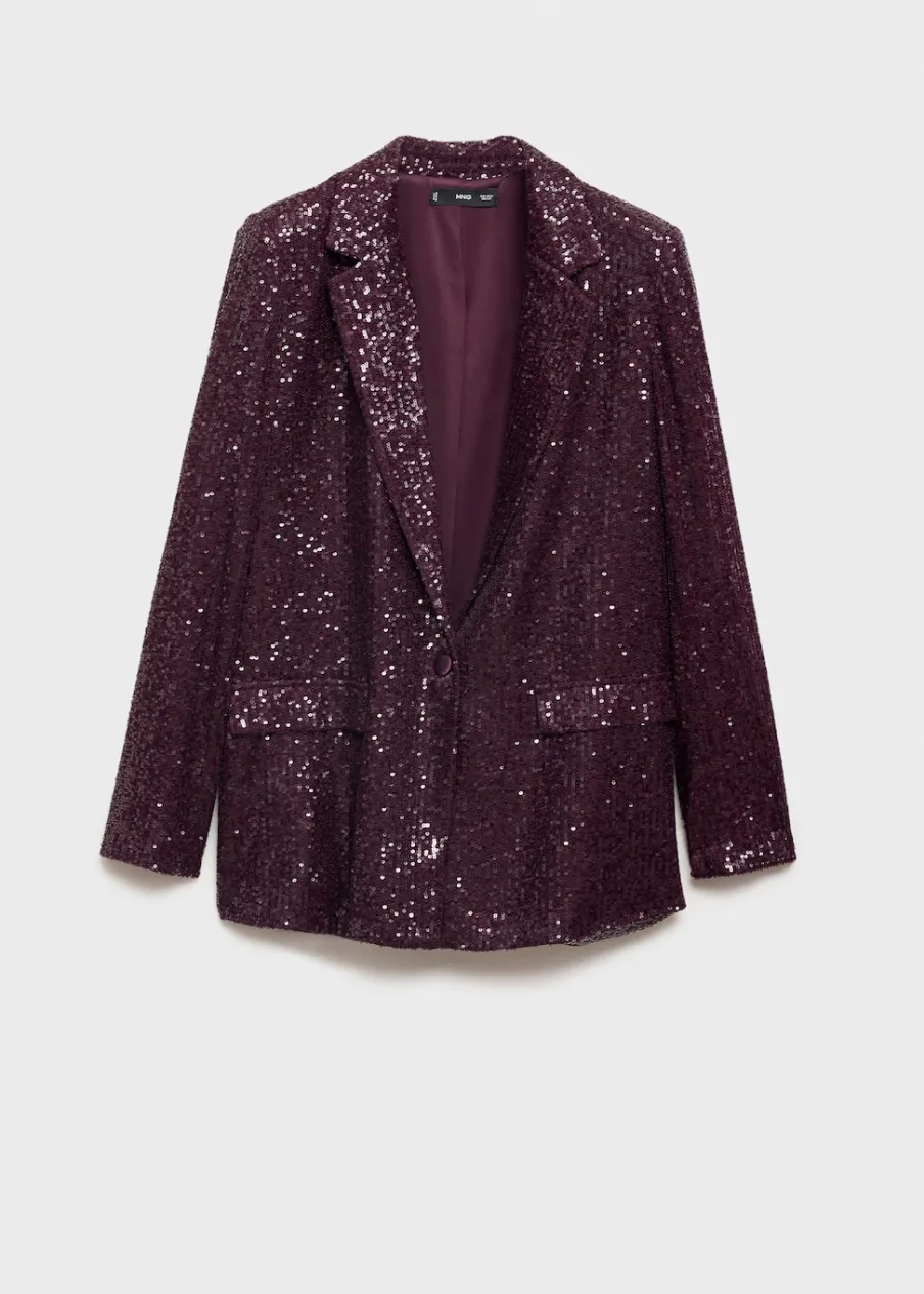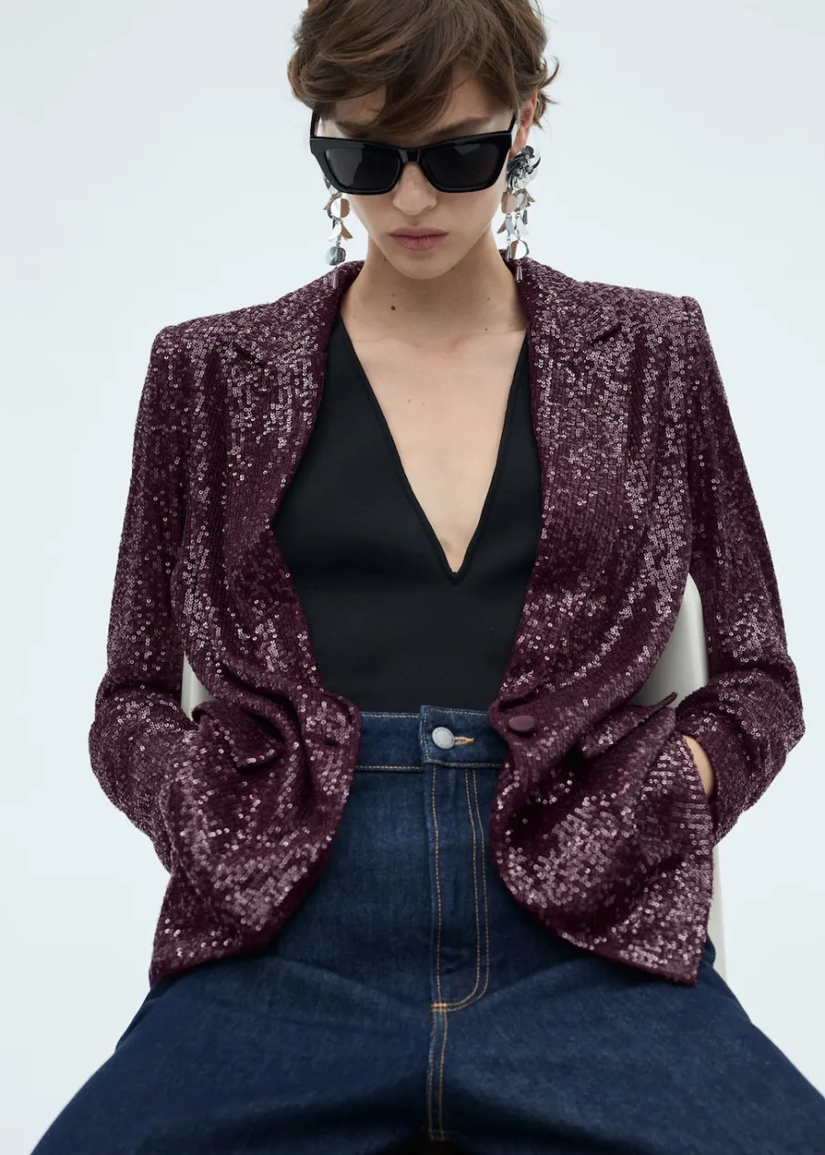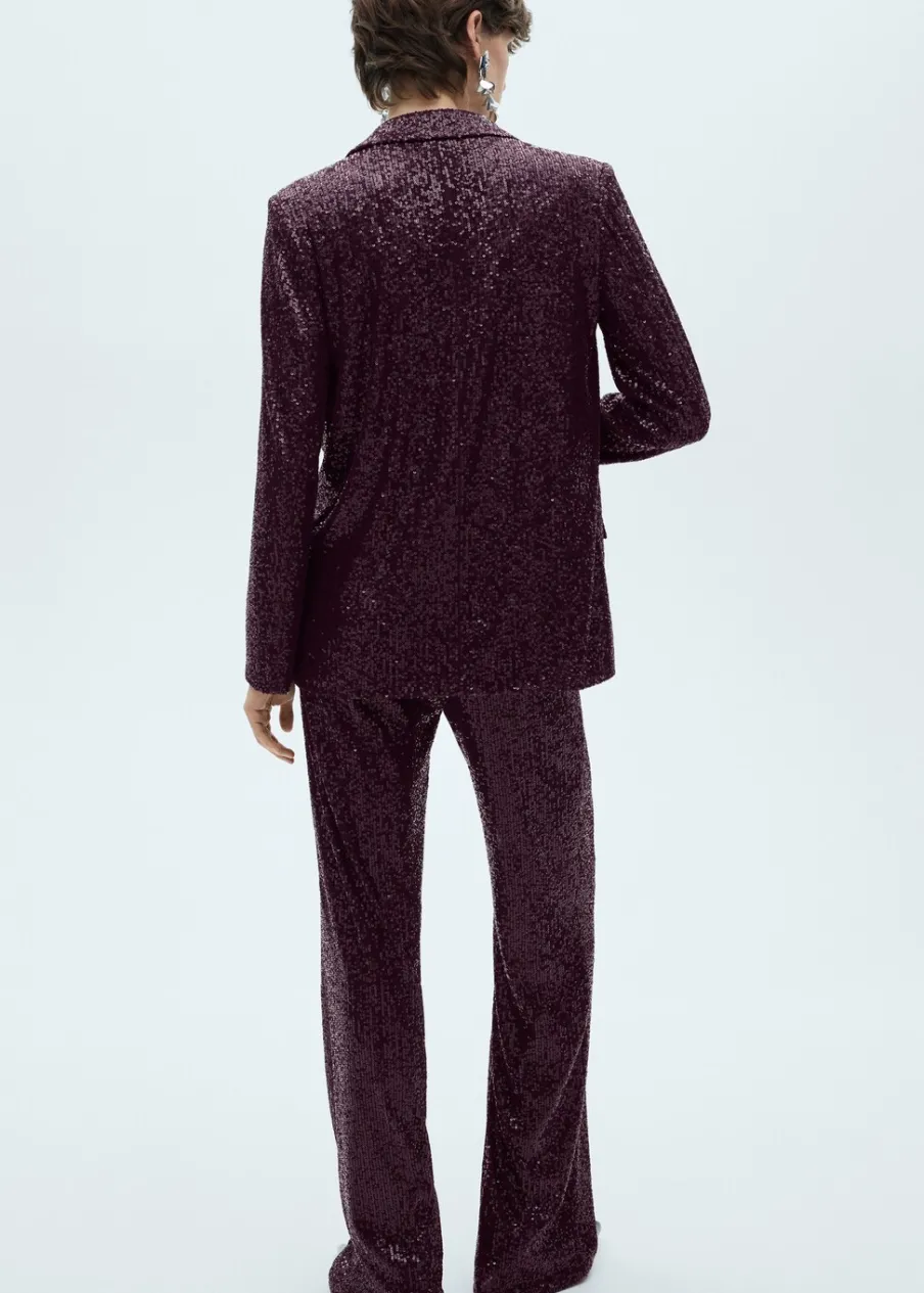 Tkanina z cekinami. Model prosty. Dekolt w szpic z kołnierzykiem. Długi rękaw. Dwie kieszenie z przodu z wypustkami i patką. Zapięcie z przodu na guzik. Total look. Kolekcja wizytowa.