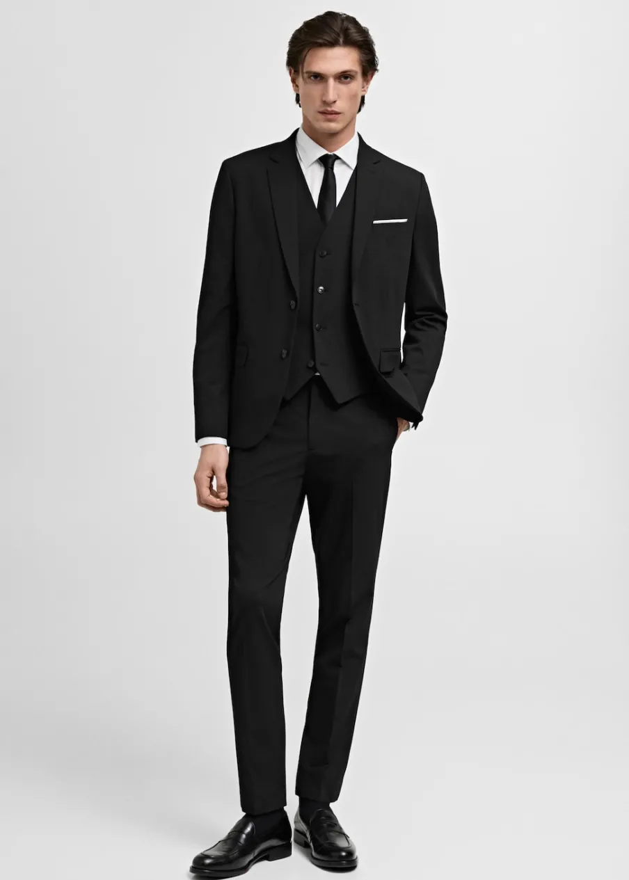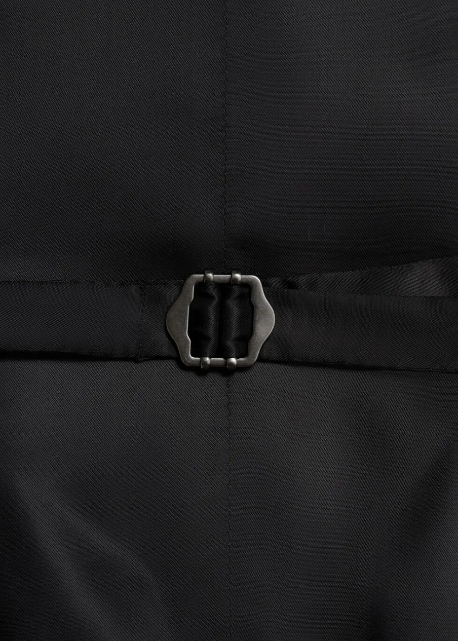 Super slim-fit. Tkanina stretch, która zapewnia maksymalną wygodę i swobodę ruchów. Dekolt V. Zapięcie na guziki z przodu. Dwie kieszenie z wypustkami z przodu. Klamerka do regulacji z tyłu. Wewnętrzna podszewka. Wewnętrzna kieszeń. Model ma 190 cm wzrostu i nosi rozmiar 50.