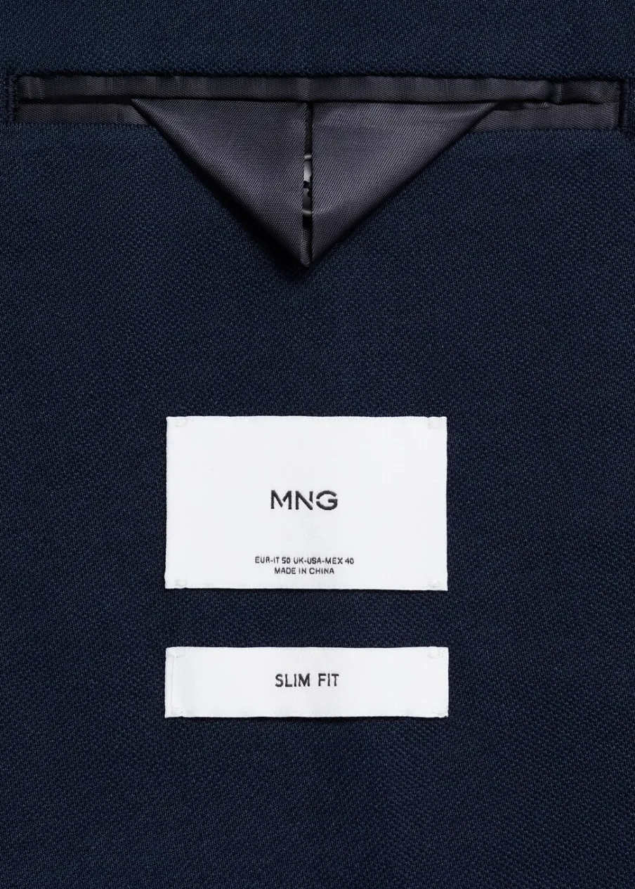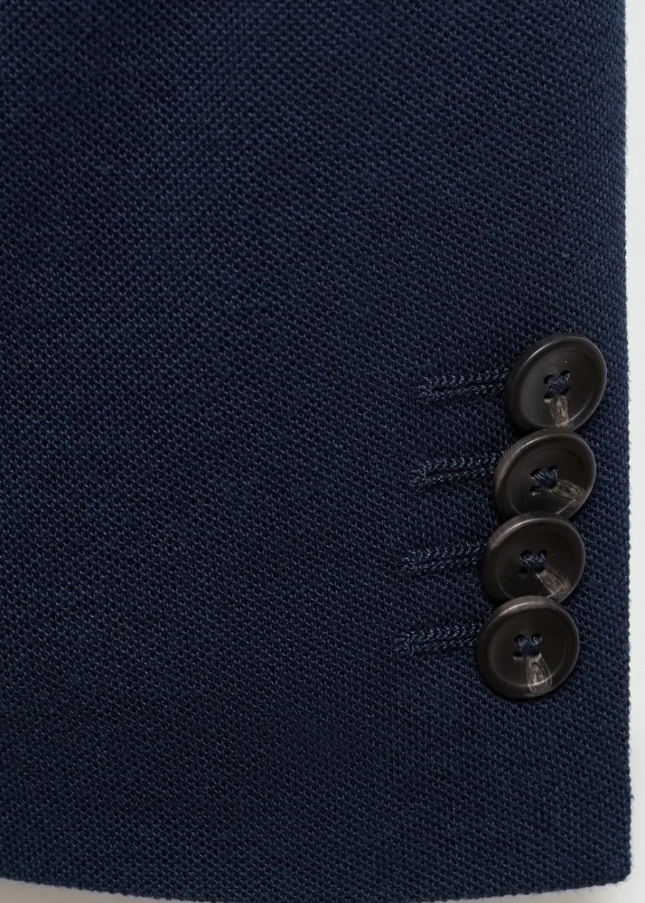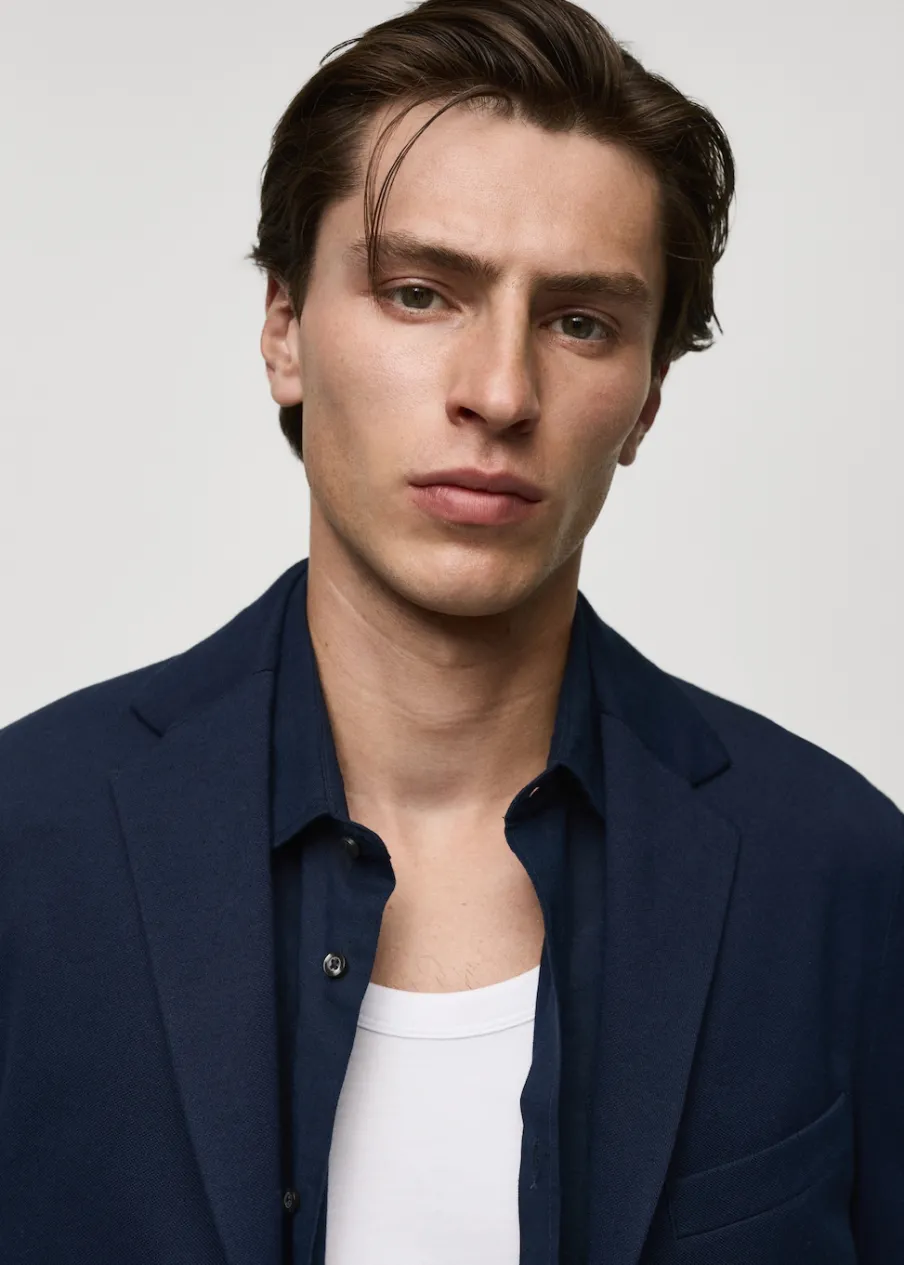 Slim-fit. Tkanina bawełniana. Tekstura bawełniany diagonal. Cienka tkanina. Kołnierz z klapami. Dwie kieszenie nakładane z przodu. Długi rękaw z guzikami na mankietach. Kieszeń wewnętrzna z zapięciem na guzik. Podszewka z przodu. Podwójne rozcięcie z tyłu. Model ma 187 cm wzrostu i nosi rozmiar 50. Zapięcie na guziki z przodu.