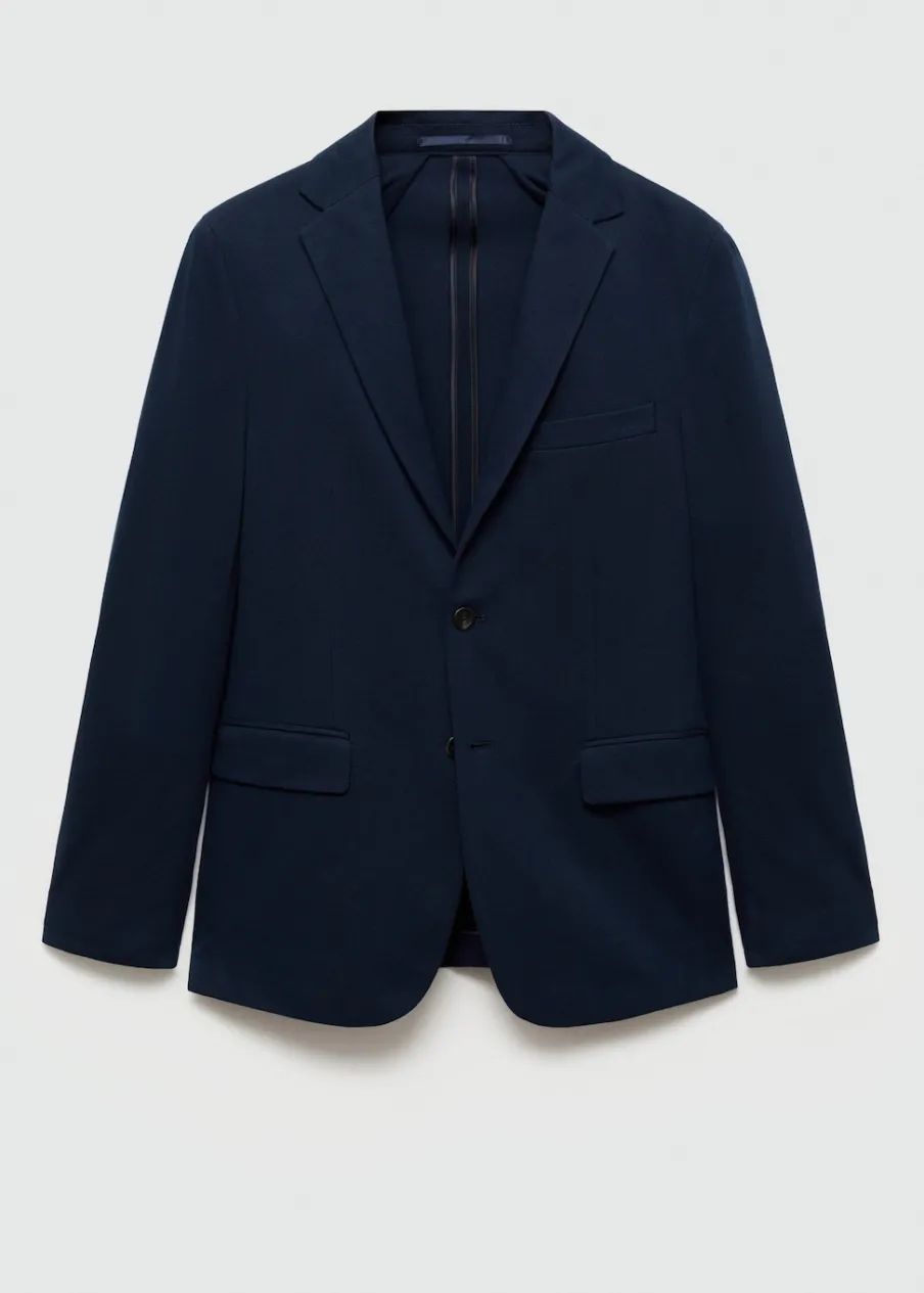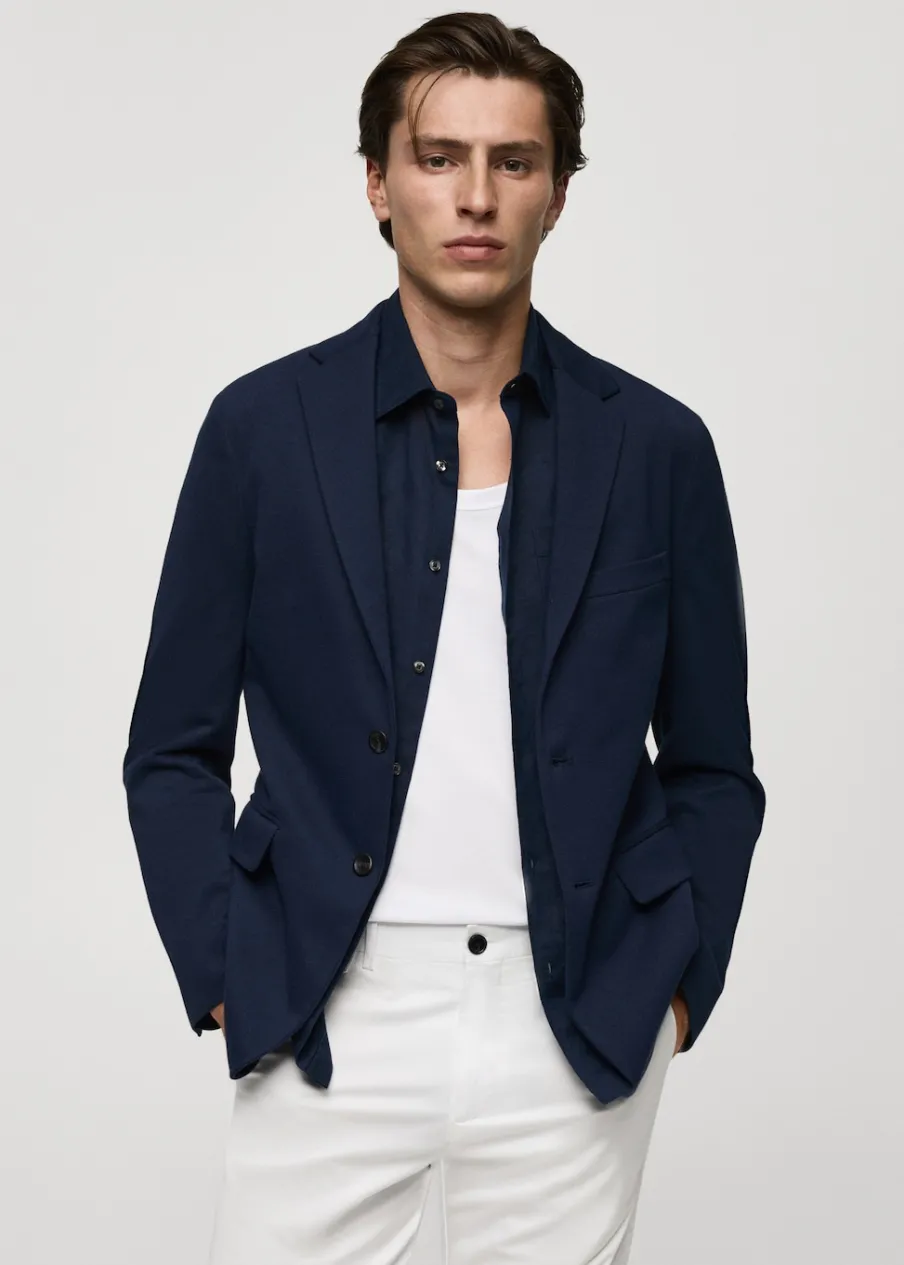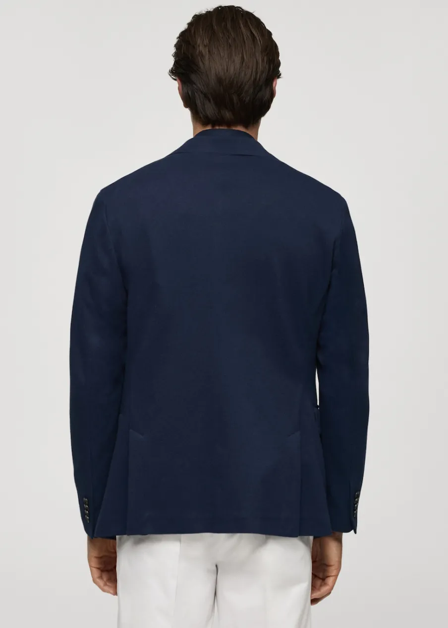 Slim-fit. Tkanina bawełniana. Tekstura bawełniany diagonal. Cienka tkanina. Kołnierz z klapami. Dwie kieszenie nakładane z przodu. Długi rękaw z guzikami na mankietach. Kieszeń wewnętrzna z zapięciem na guzik. Podszewka z przodu. Podwójne rozcięcie z tyłu. Model ma 187 cm wzrostu i nosi rozmiar 50. Zapięcie na guziki z przodu.