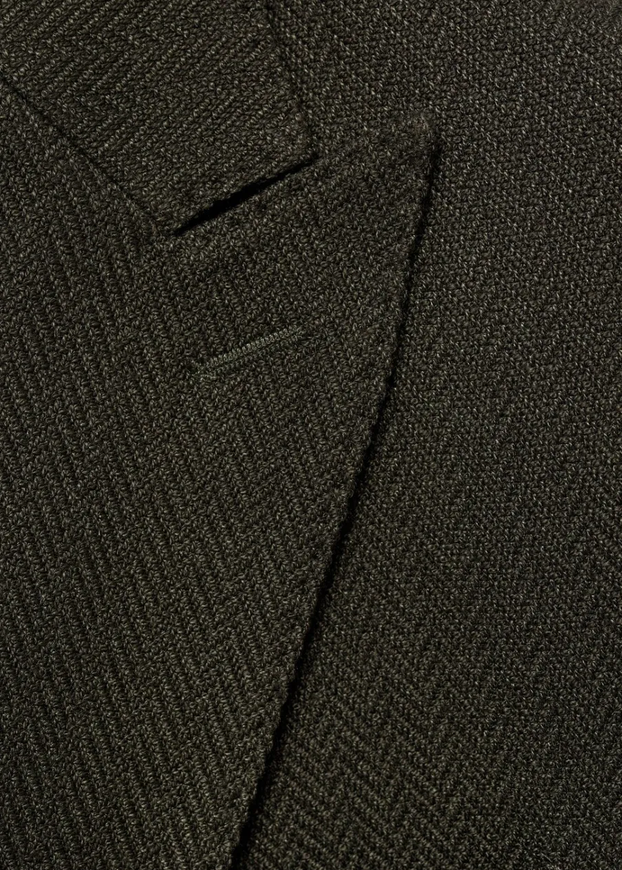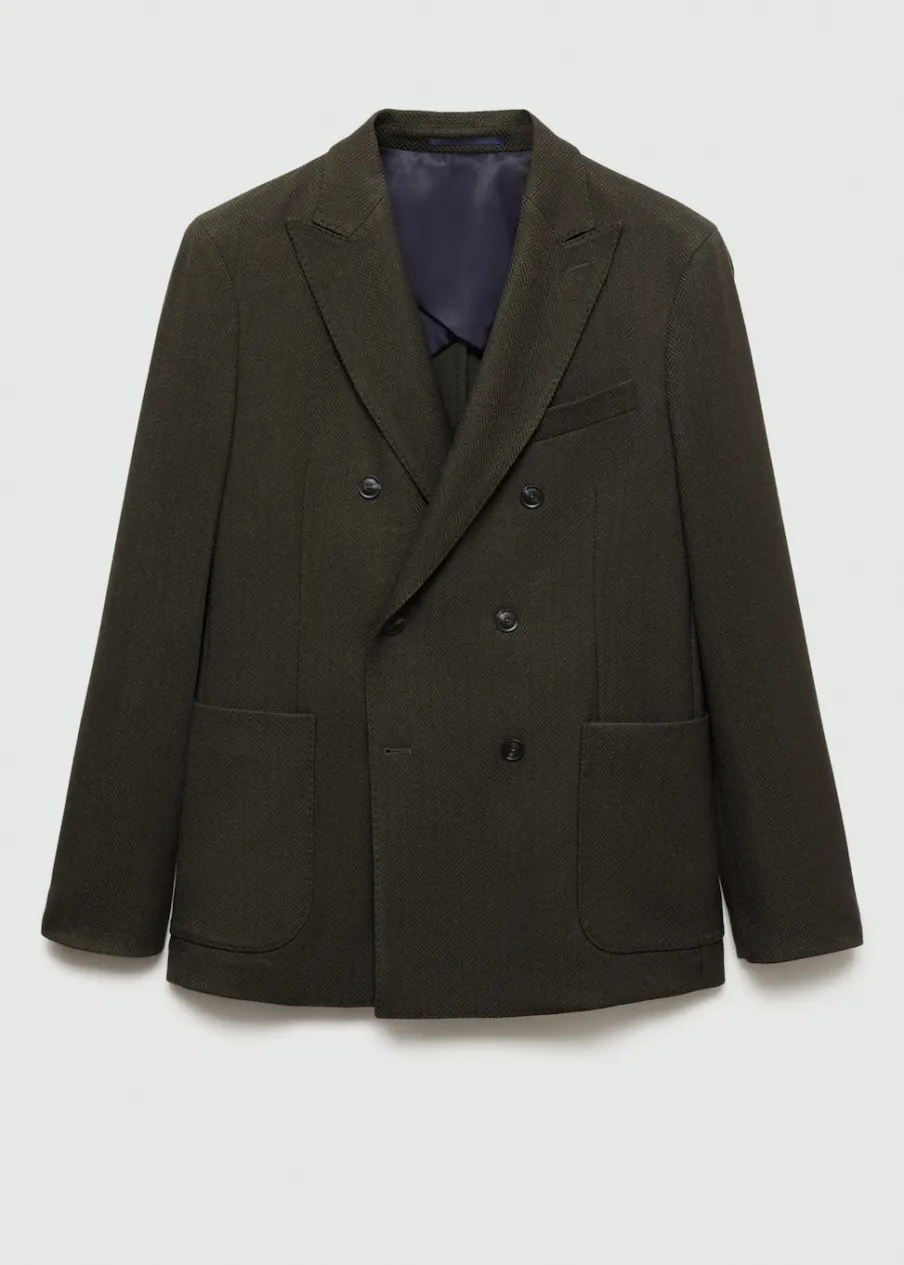 Wyłącznie online. Slim-fit. Struktura w jodełkę. Cienka tkanina. Klapy otwarte z butonierką. Dwurzędowe zapięcie na guziki z przodu. Kieszeń wpuszczana na piersi. Dwie kieszenie nakładane z przodu. Długi rękaw z guzikami na mankietach. Kieszeń wewnętrzna z zapięciem na guzik. Model ma 190 cm wzrostu i nosi rozmiar 50. Dwie szlice z tyłu. Częściowa podszewka.