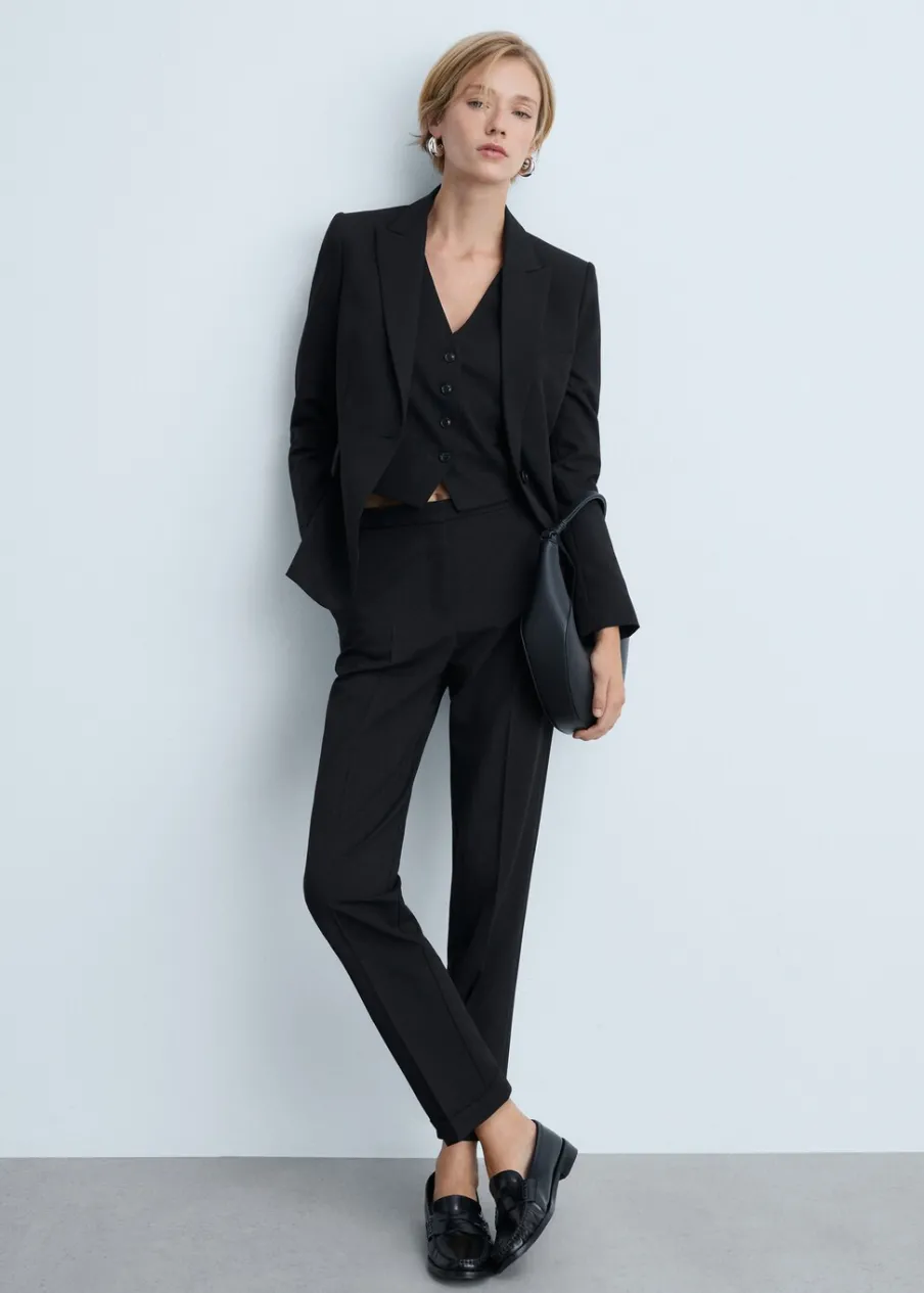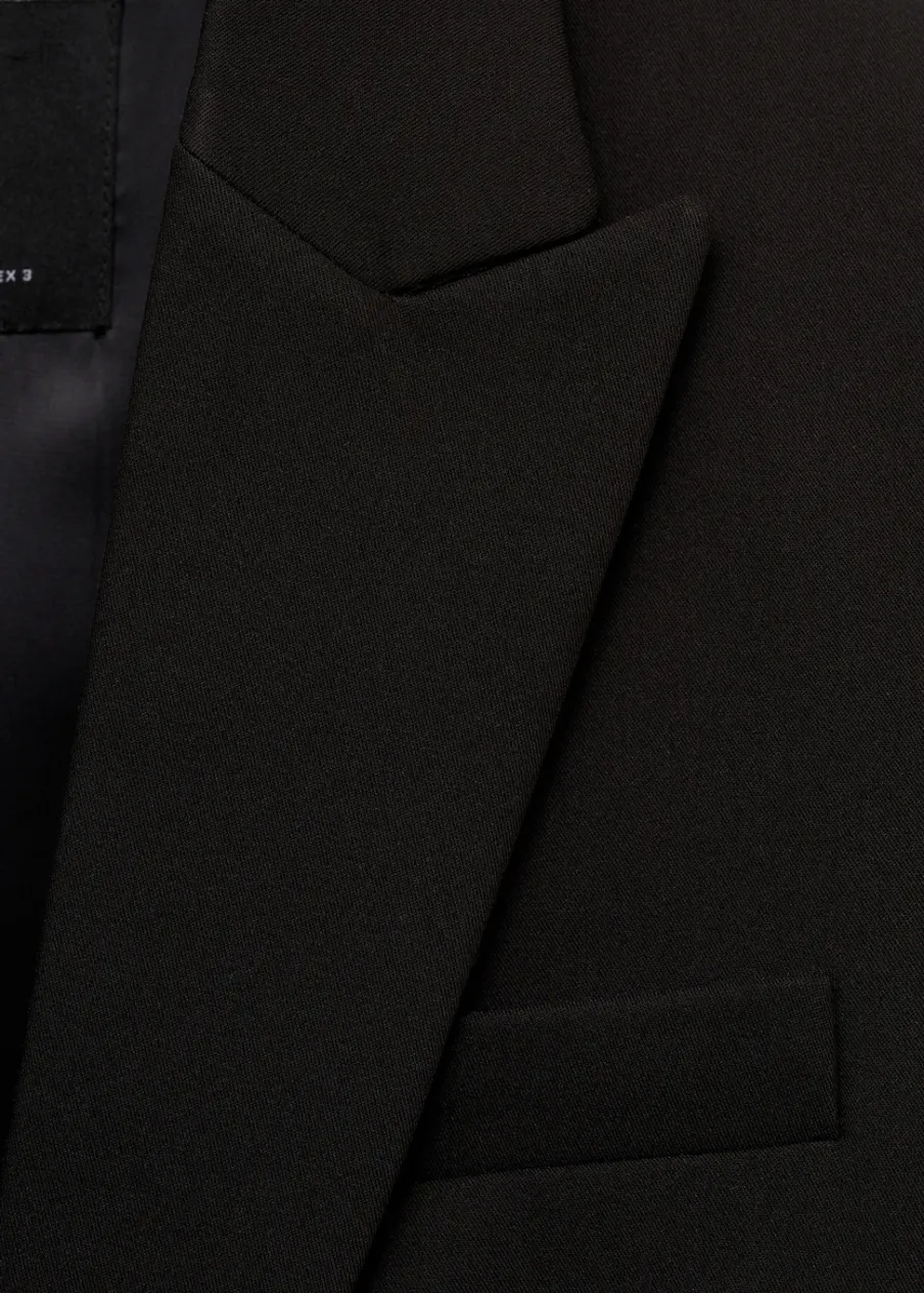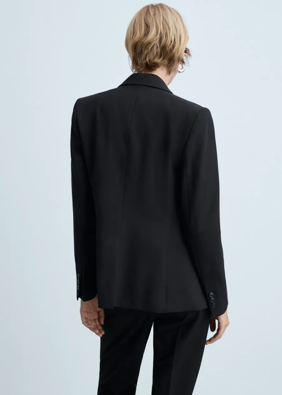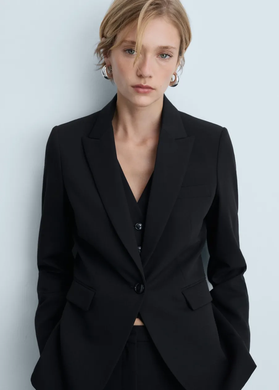 Model prosty. Dekolt w szpic z kołnierzykiem. Klapy z nacięciem. Długi rękaw. Usztywnione ramiona. Detal z zakładkami. Rozcięcie z tyłu. Wewnętrzna podszewka. Total look. Dwie wpuszczene kieszenie z przodu. Model wcięty.