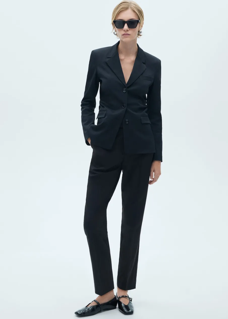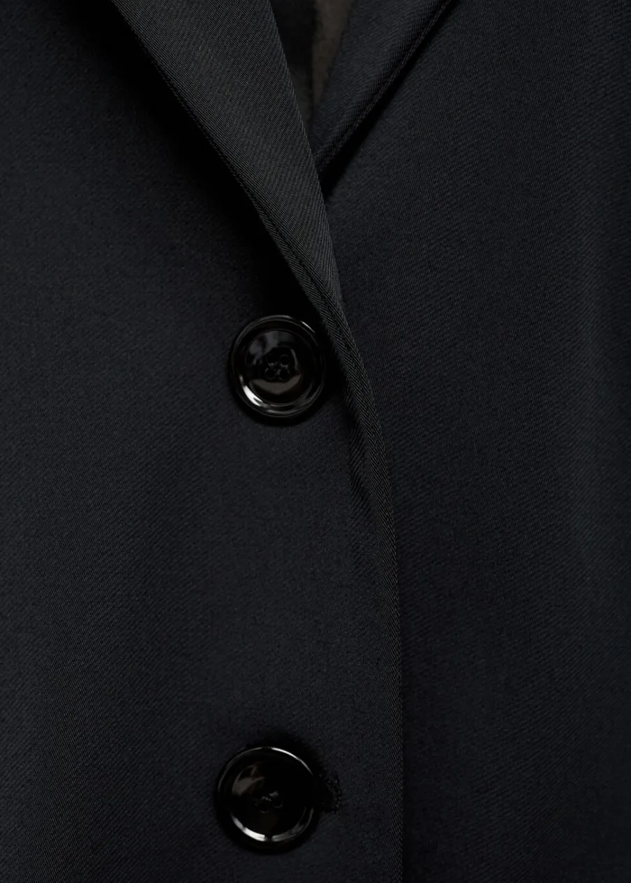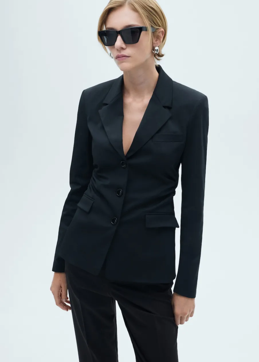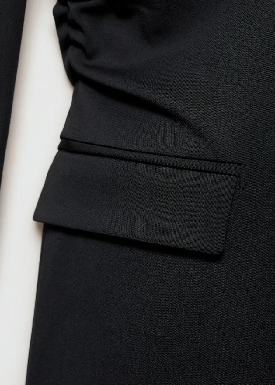 Model prosty. Model wcięty. Fason garniturowy. Dekolt w szpic z kołnierzykiem. Klapy z nacięciem. Długi rękaw. Dwie kieszenie z przodu z wypustkami i patką. Kieszeń wpuszczana na piersi. Zapięcie na guziki z przodu. Marszczona tekstura. Total look. Wewnętrzna podszewka. Modelka ma 181 cm wzrostu i nosi rozmiar S/36.