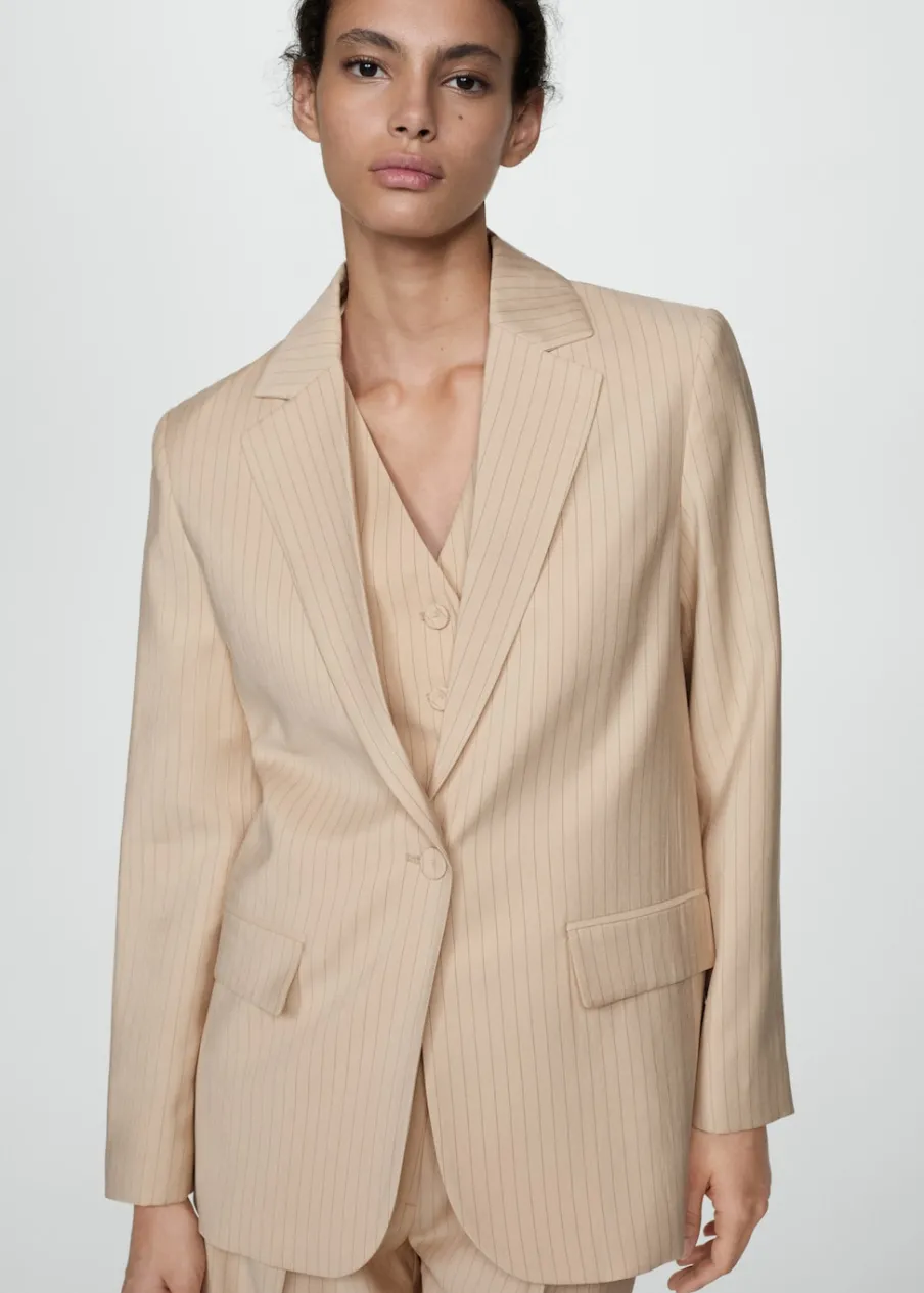 Lejąca tkanina. Model prosty. Dekolt w szpic z kołnierzykiem. Klapy z nacięciem. Długi rękaw z guzikami na mankietach. Dwie kieszenie z patkami z przodu. Total look. Dostępne w Plus Size. Wzór w paski. Zapięcie na guziki z przodu.