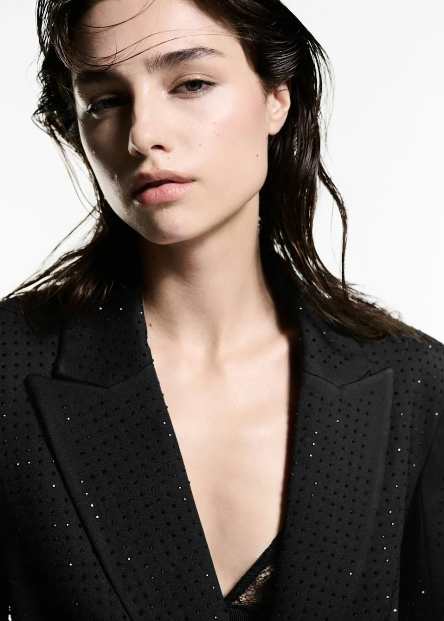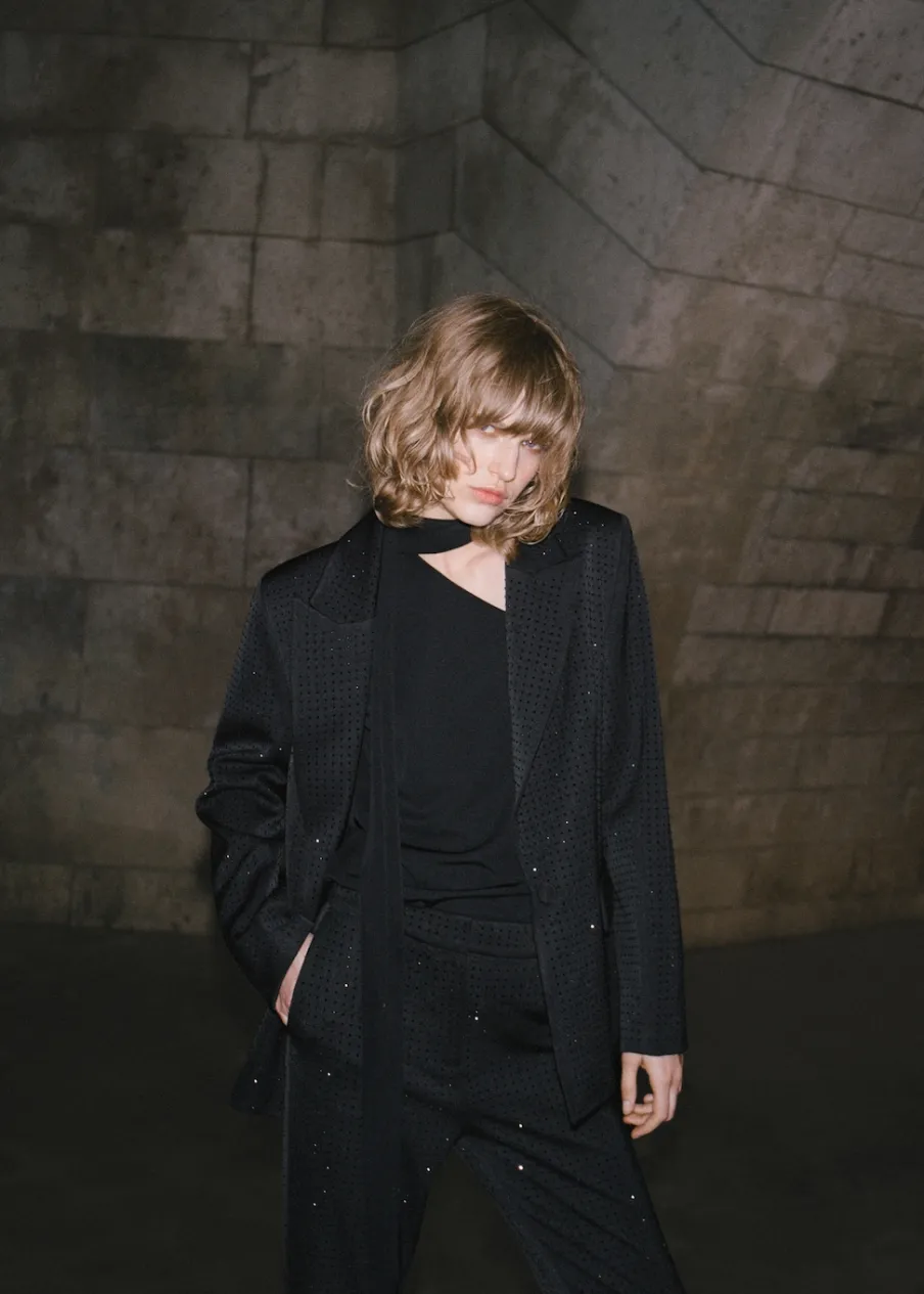 OpisDługi rękaw. Total look. Kolekcja wizytowa. Modelka ma 177 cm wzrostu i nosi rozmiar S/36. Dekolt w szpic z kołni…