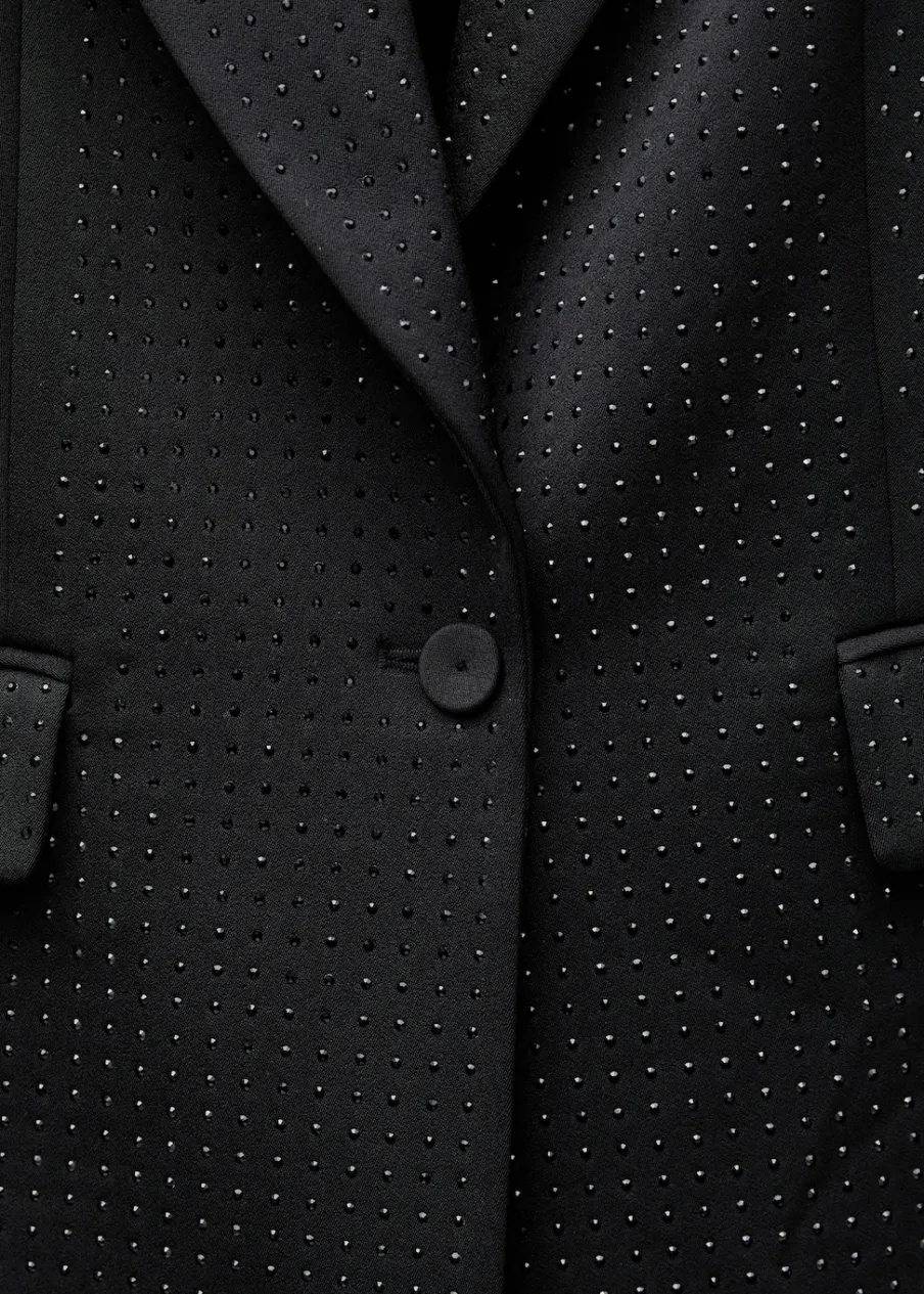 Długi rękaw. Total look. Kolekcja wizytowa. Modelka ma 177 cm wzrostu i nosi rozmiar S/36. Dekolt w szpic z kołnierzykiem. Dwie kieszenie z przodu z wypustkami i patką. Zapięcie z przodu na guzik. Wewnętrzna podszewka. Model prosty.