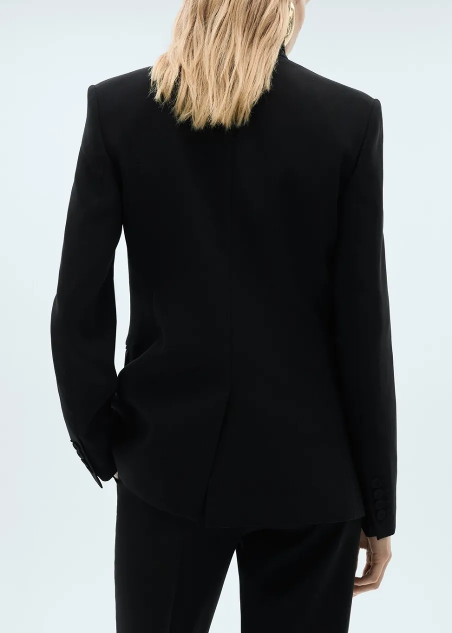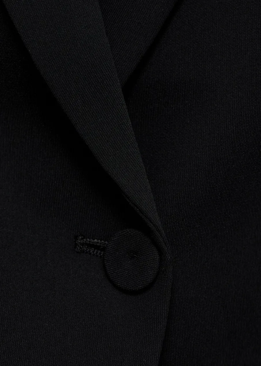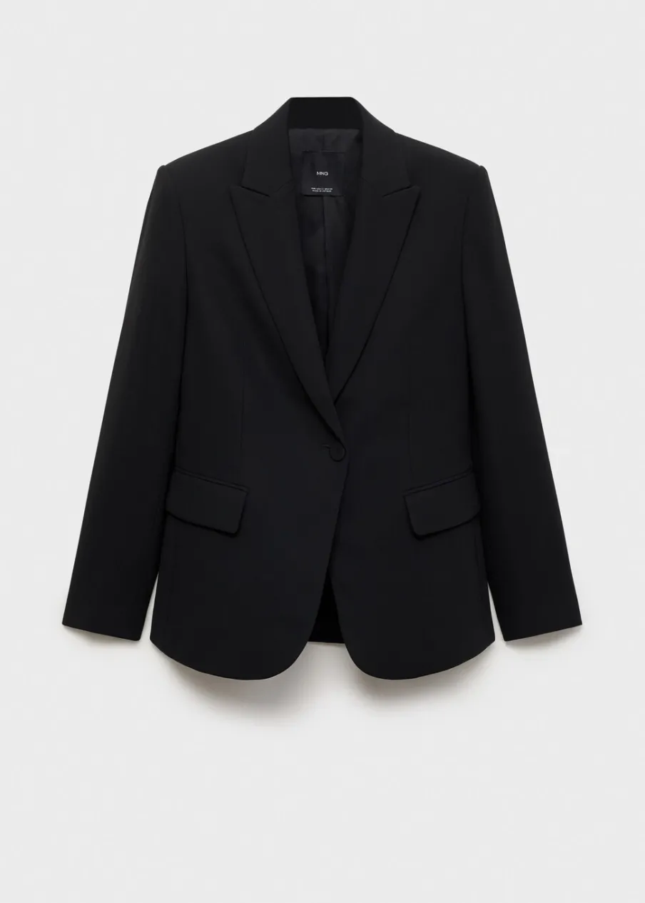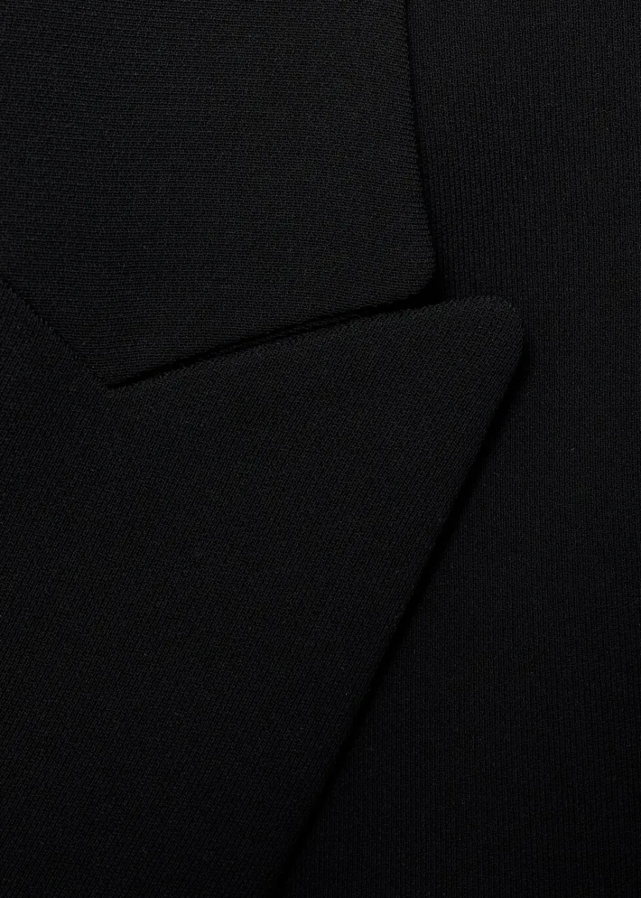 OpisModel strukturalny. Model prosty. Dekolt w szpic z kołnierzykiem. Klapy z nacięciem. Długi rękaw z guzikami na m…