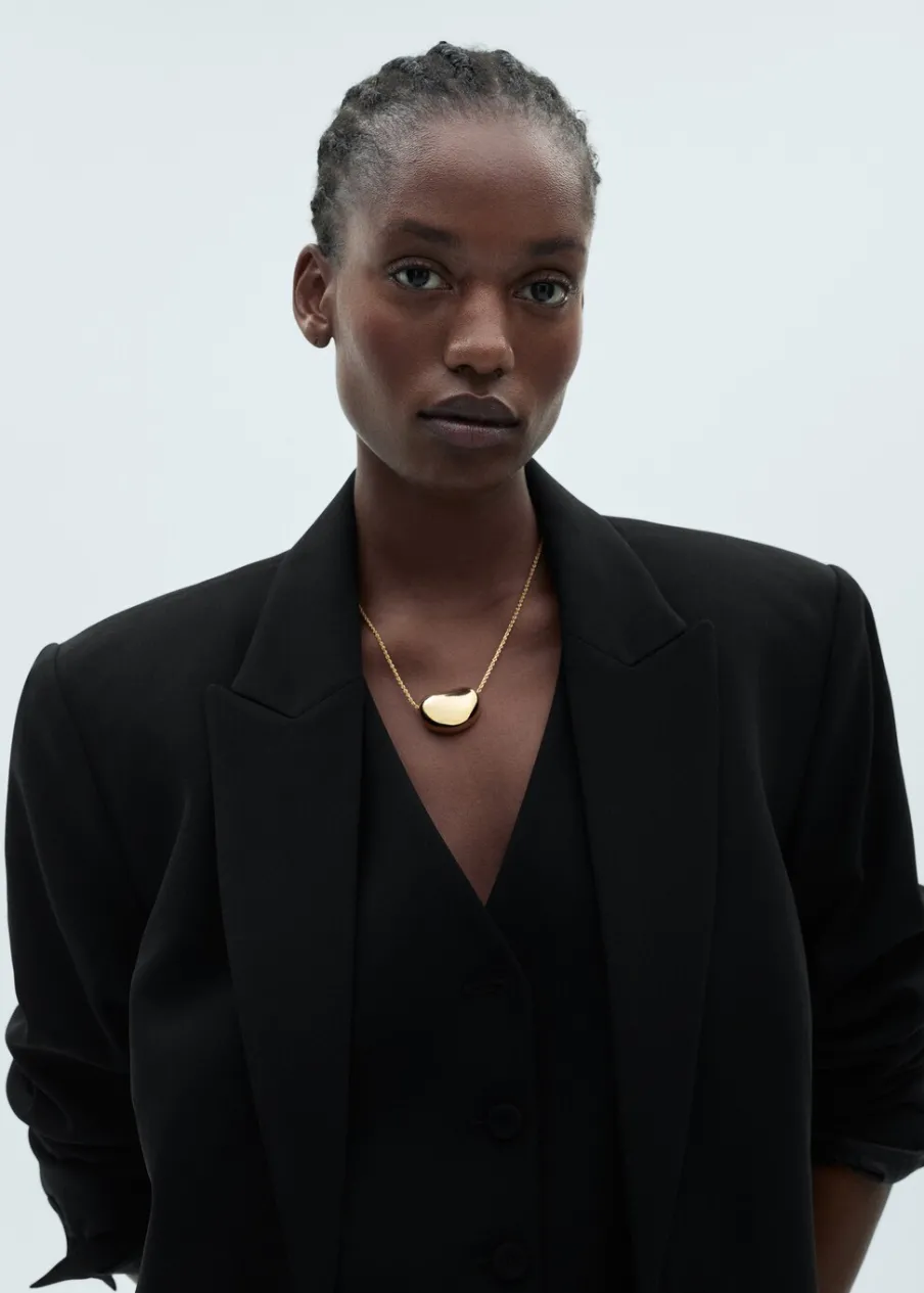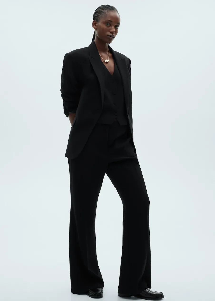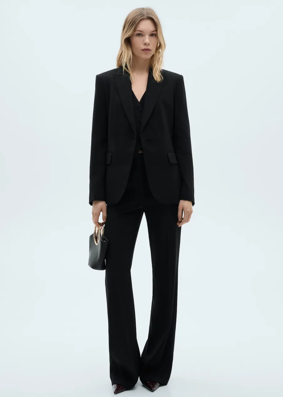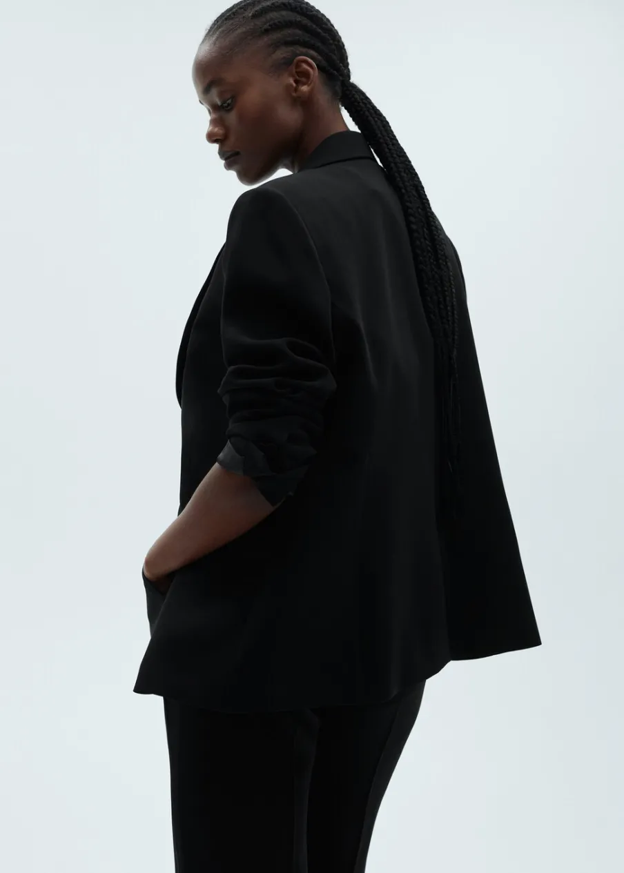 OpisModel strukturalny. Model prosty. Dekolt w szpic z kołnierzykiem. Klapy z nacięciem. Długi rękaw z guzikami na m…